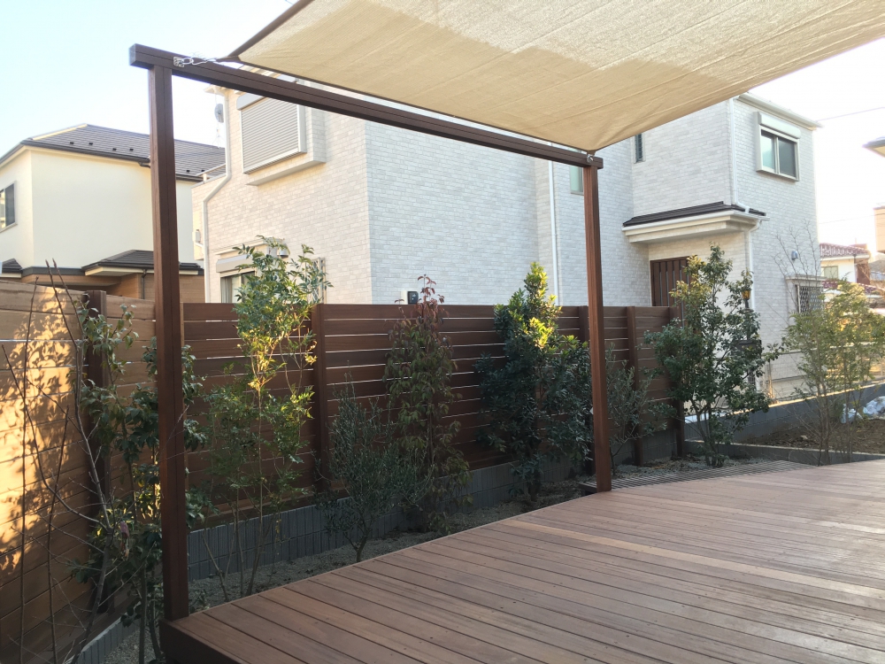 オーニングをデッキ一面に伸ばし、上からの目線も防ぎ、ガーデンライフを楽しめます。