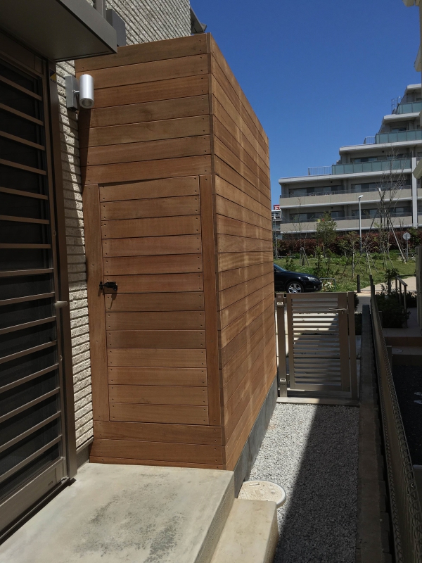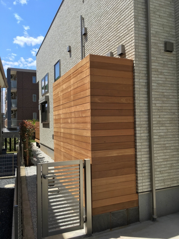 お隣さんの2階から覗けないように、高さは2500mmほどのウッド囲いを設置し、
