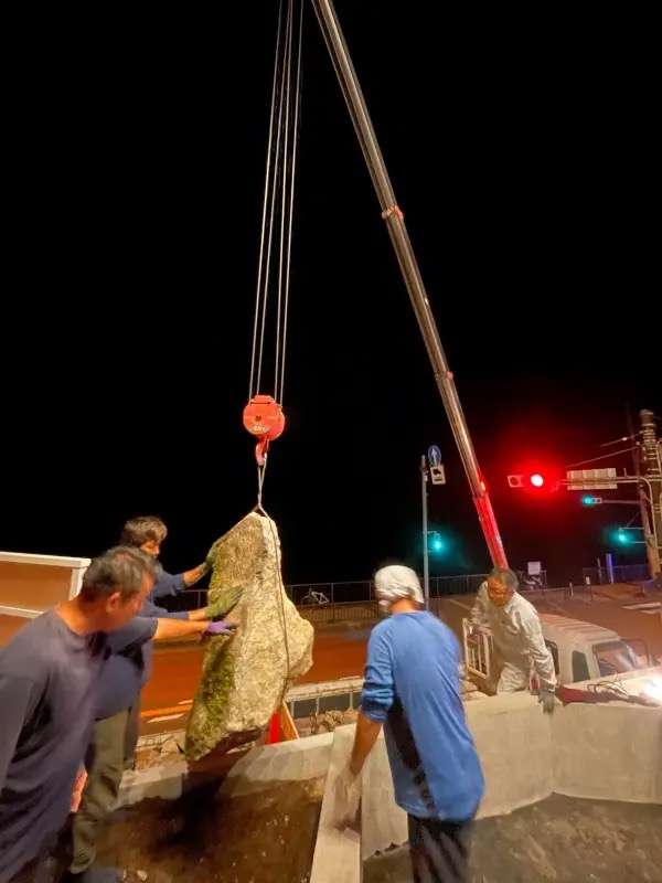 道路を片道封鎖する警備員、ブームを操作する運転手、石の向きを調整する職人、遠くから指示を出す職人がいてようやく一つの岩が設置されます。