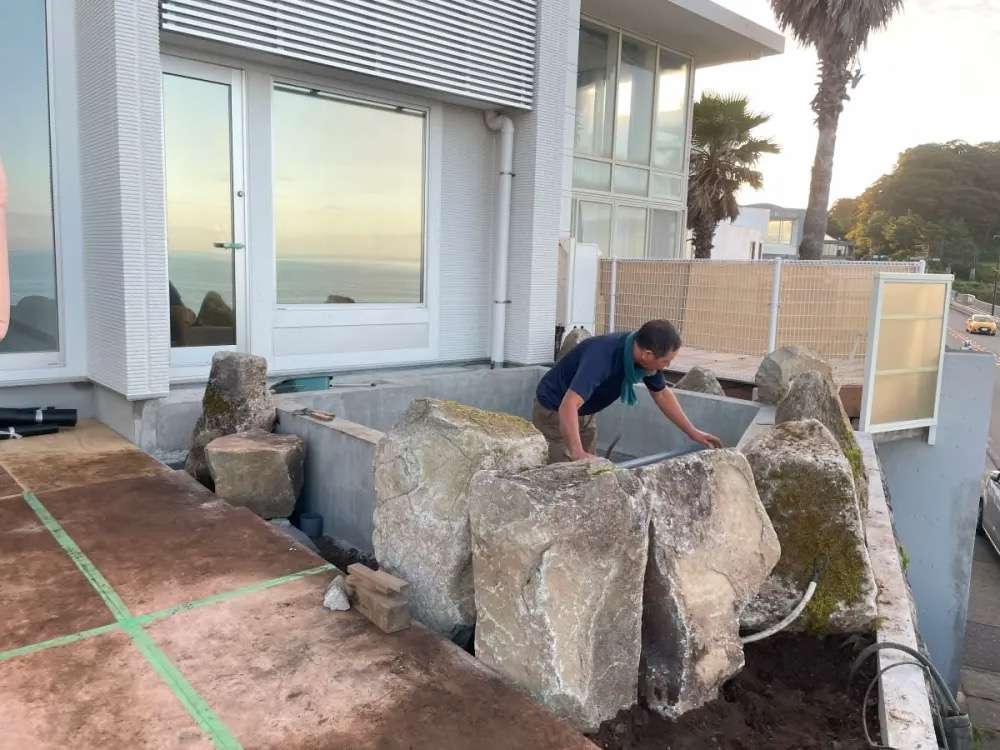 稲村ガ崎のヴィラで露天岩風呂と枯山水庭園の設計施工をさせていただきました。