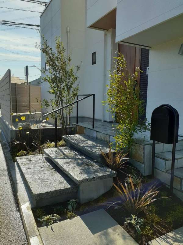 和のテイストを入れつつ、自然石を用いたデザインの玄関前にしました。