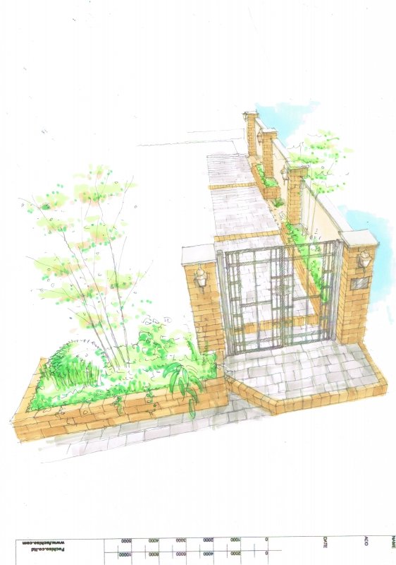 修正後はアプローチ内の花壇の形をとガラッと変更致しました。