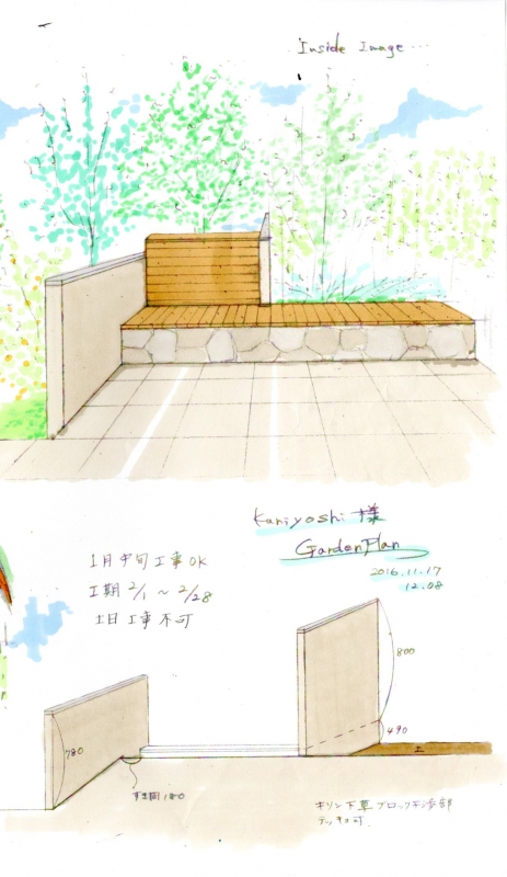 ベンチ背もたれは近隣からの視線を遮るフェンスの役割も兼ね、施工させて頂きました。