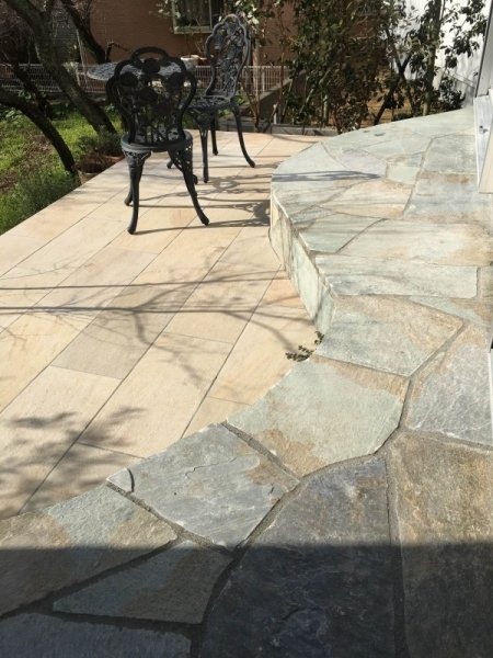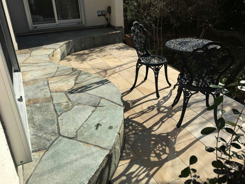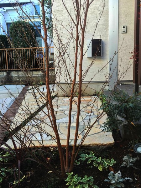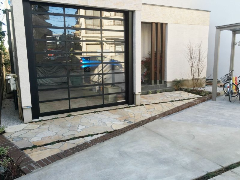 玄関アプローチは長方形に乱形石をに貼り落ち着いた雰囲気に、レンガ長手敷きを角度を付け敷くことでデザイン性をUPしました。