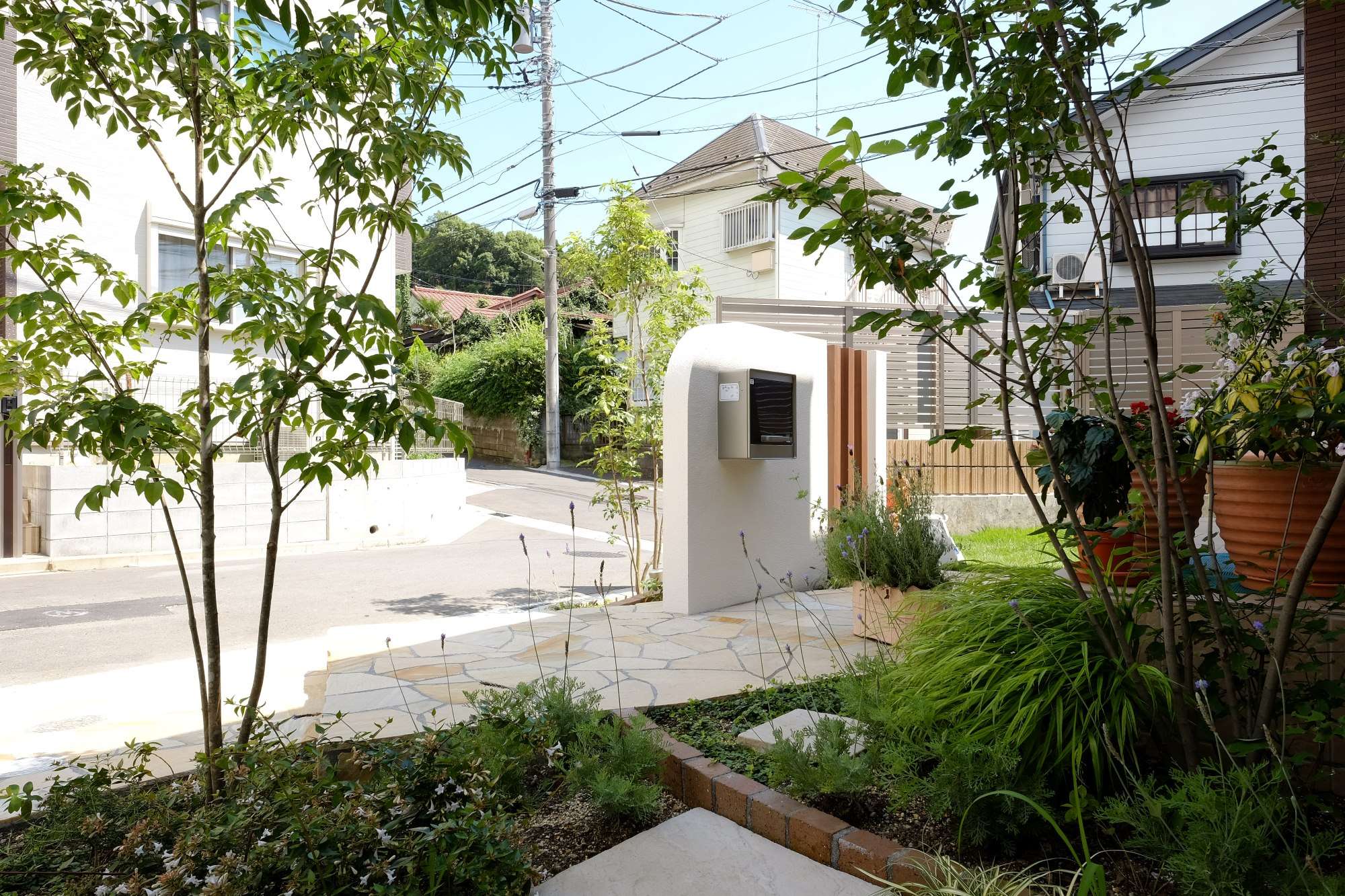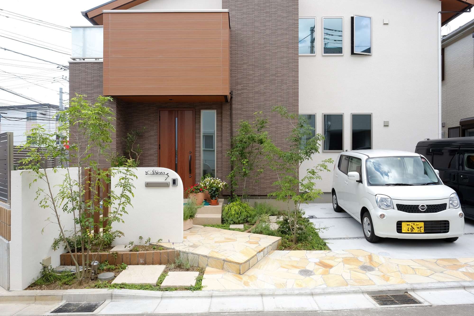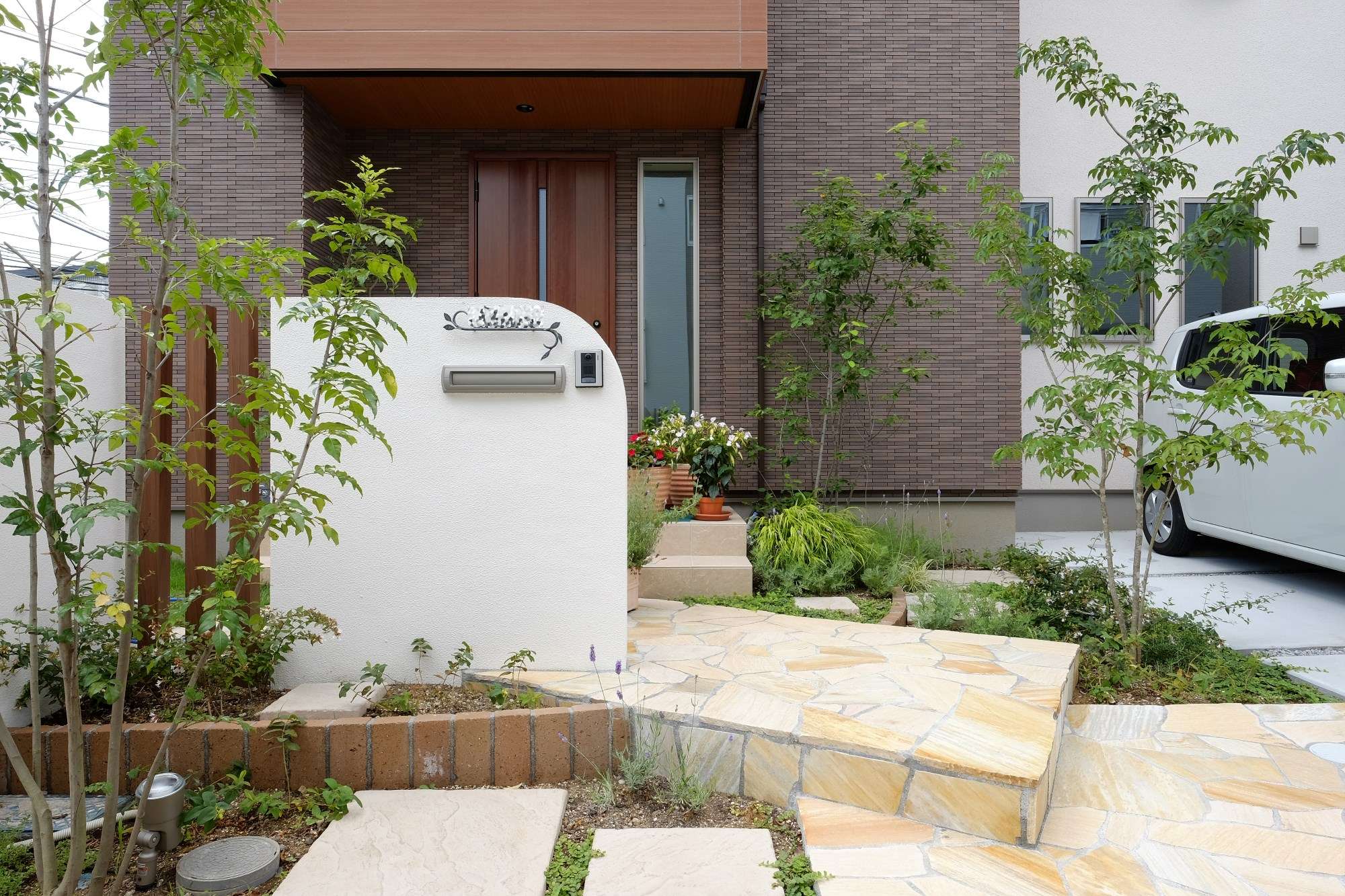優しい色合いにこだわった玄関先にはシマトネリコやジューンベリー等の木を。