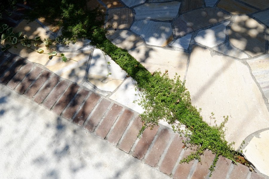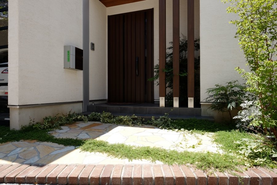 石貼り×レンガ×目地草 明るいオープン外構