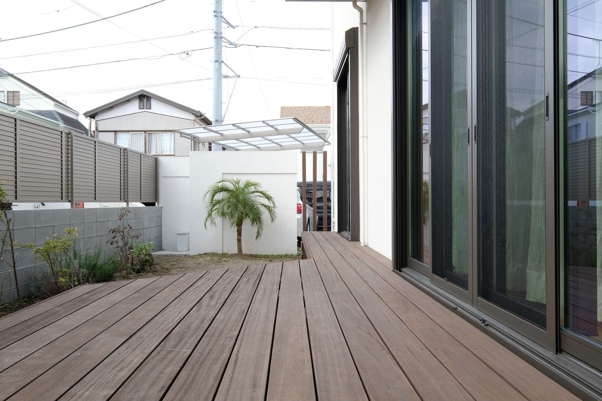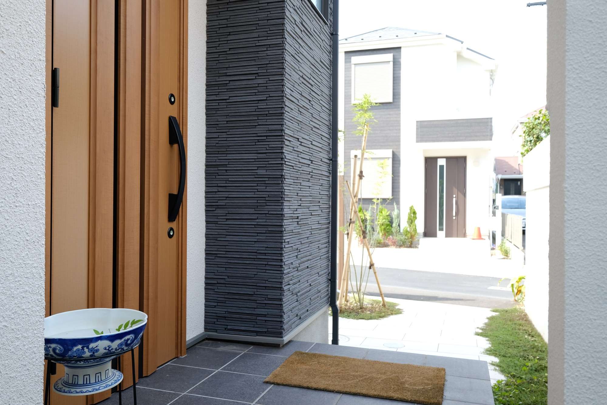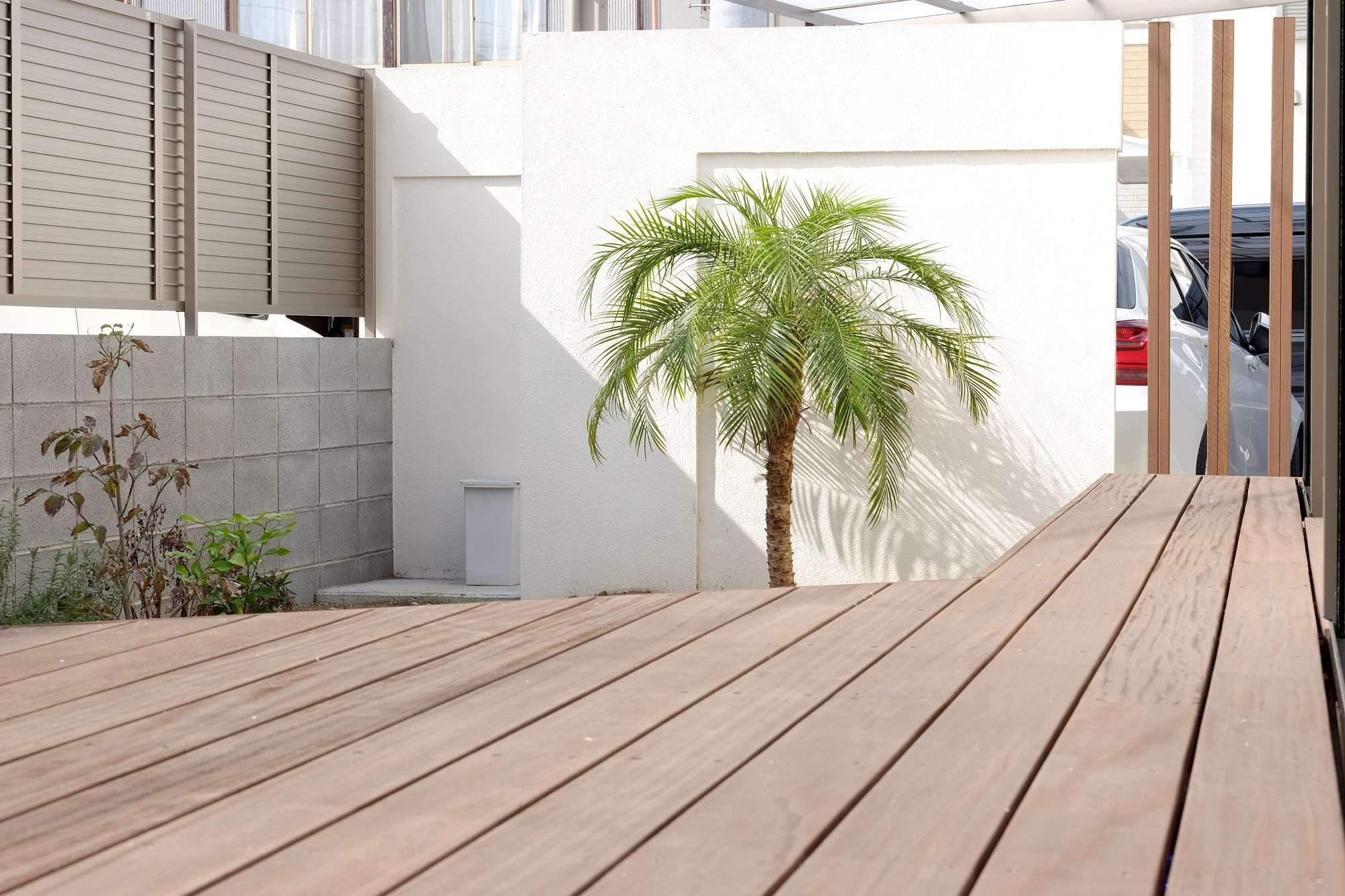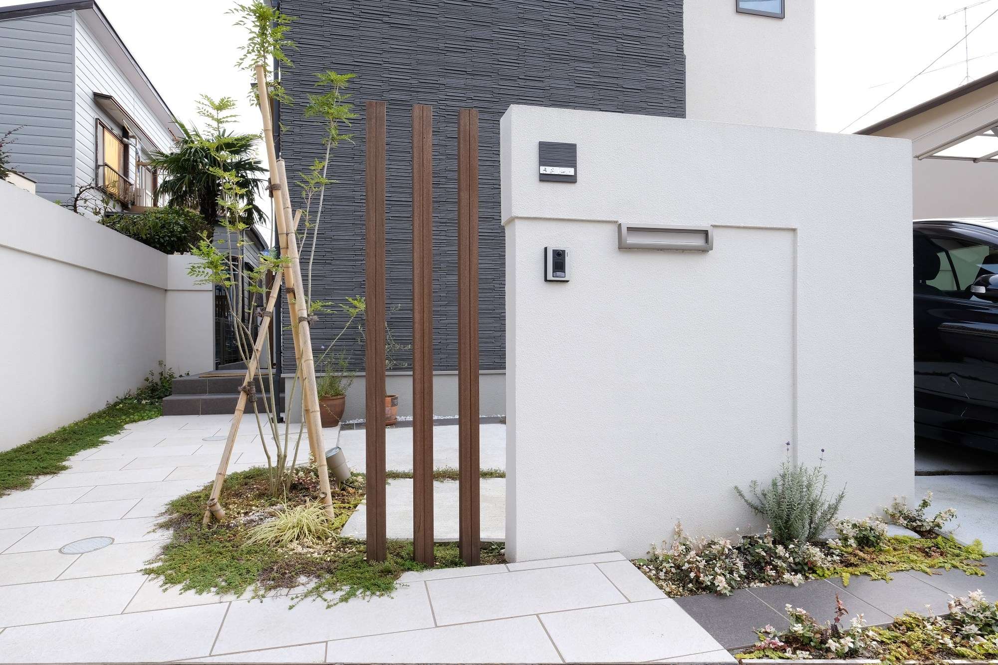 あえてダークブラウンのウッド立てとカラーコントラストを作り出すことで、白い門柱を際立たせます。