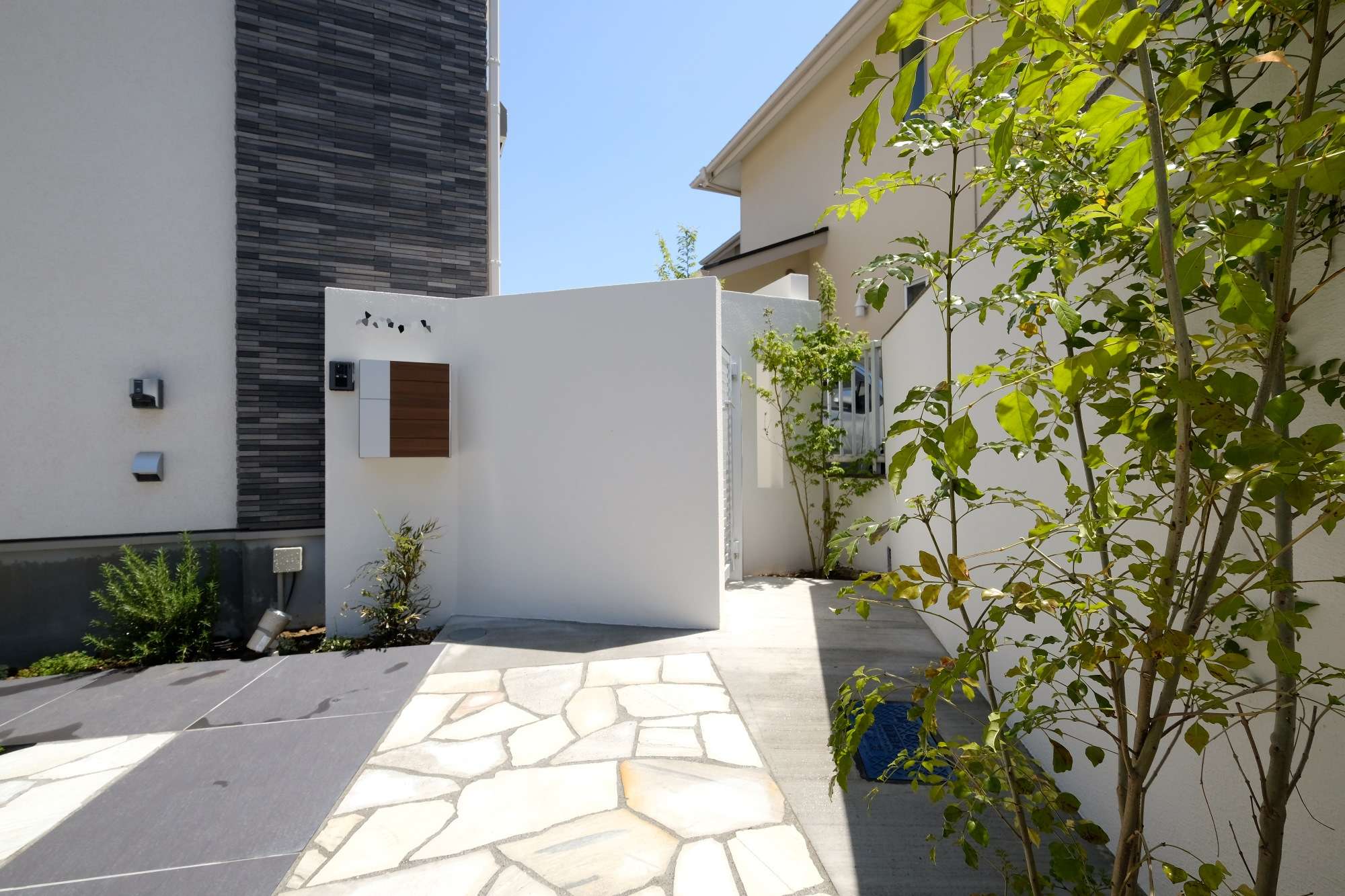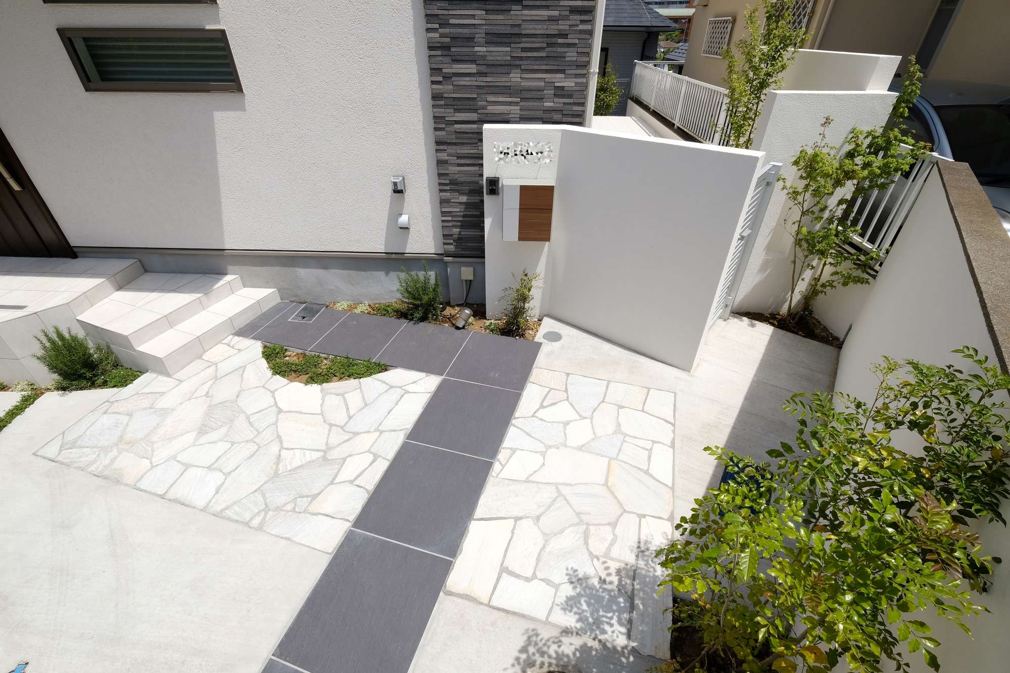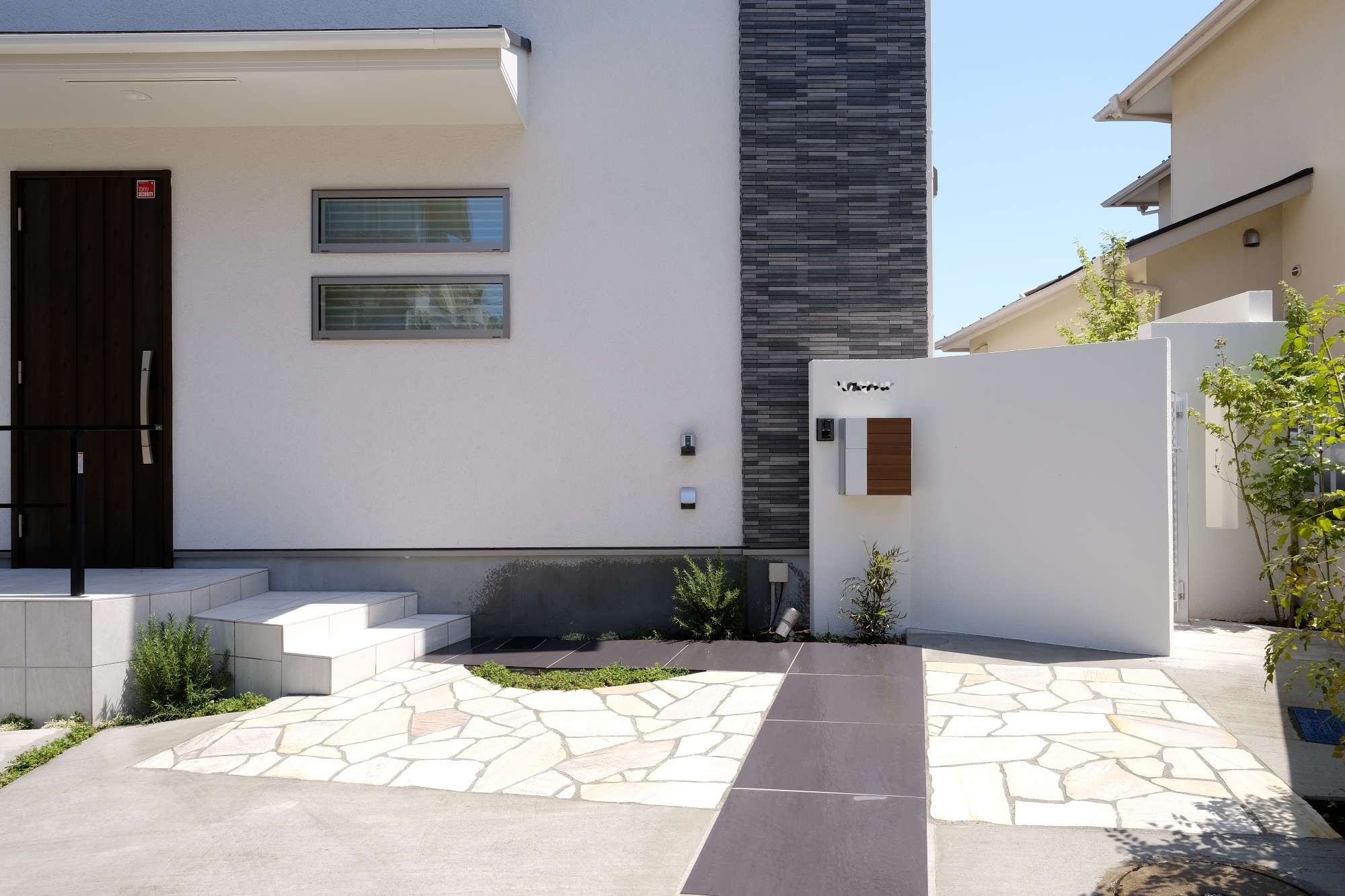 白・黒の建物外壁に色味は合わせ、乱形石と大判タイルで構成されたアプローチ、