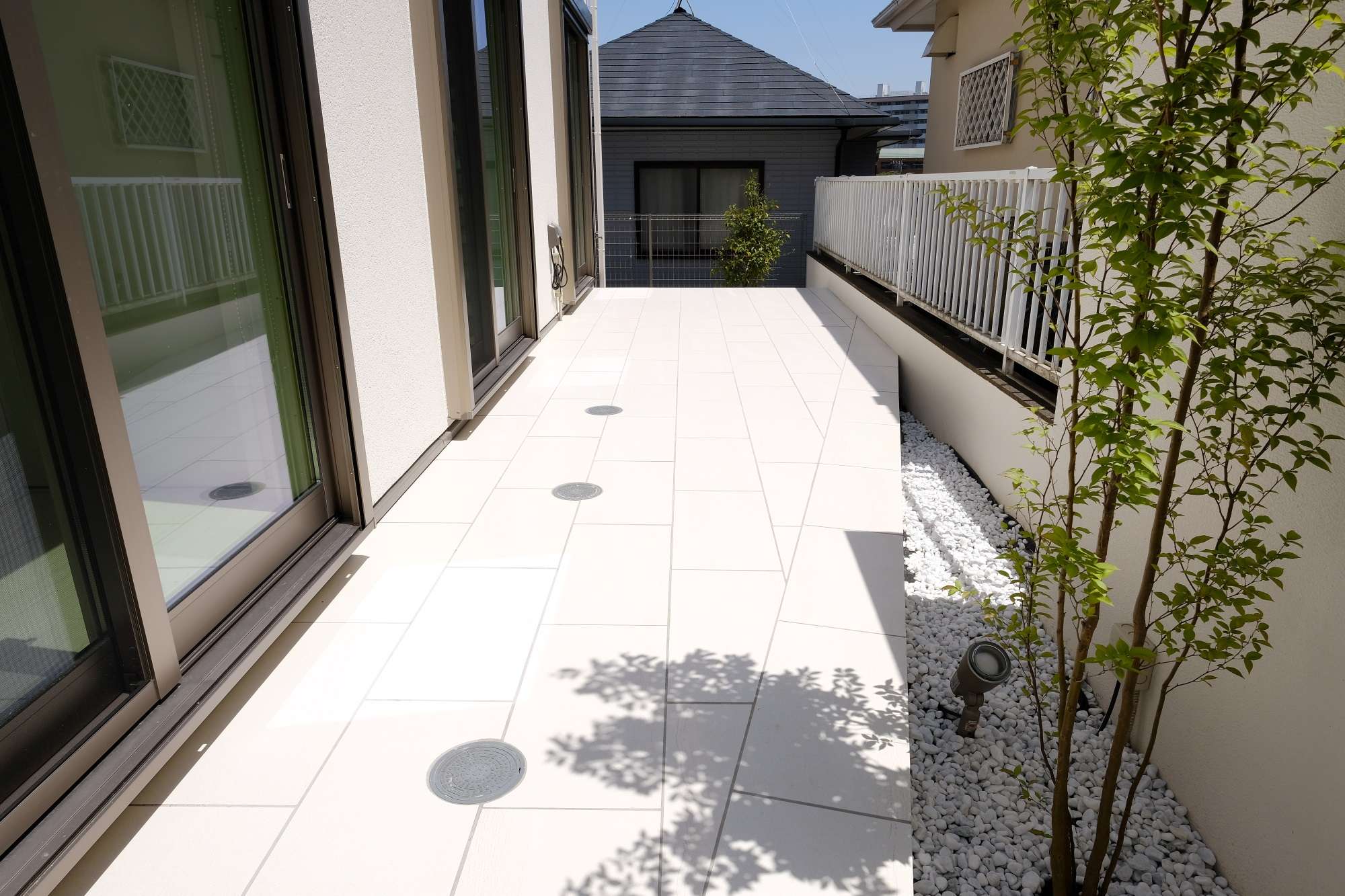 お庭側のタイルデッキ。こちらも真っ白な300*600タイルを採用し、モダンでシャープな印象を持たせています。白タイルのテラスは、同じ白壁の建物とも調和し、また明るく広く感じさせる効果もあります。お子様のプール遊びやBQにも活躍しそうです。