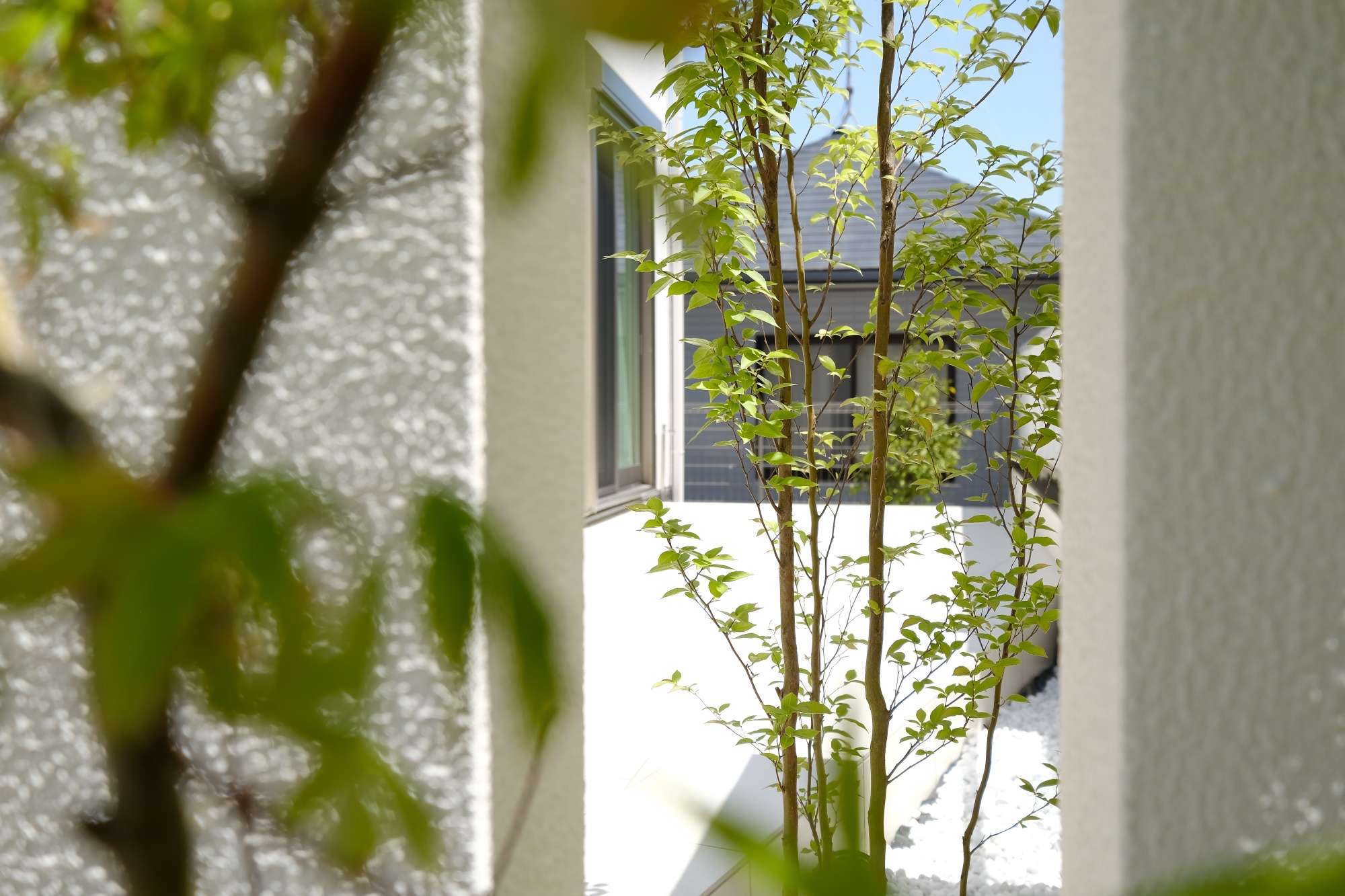 アプローチ側にも随所に植栽エリアを設け、手前は常緑樹のシマトネリコ、お庭入り口にはコハウチワカエデを配置しました。樹種の選択と配置は、常緑樹と落葉樹をバランスよく組み合わせることで、年間を通して木々を楽しむことができます。