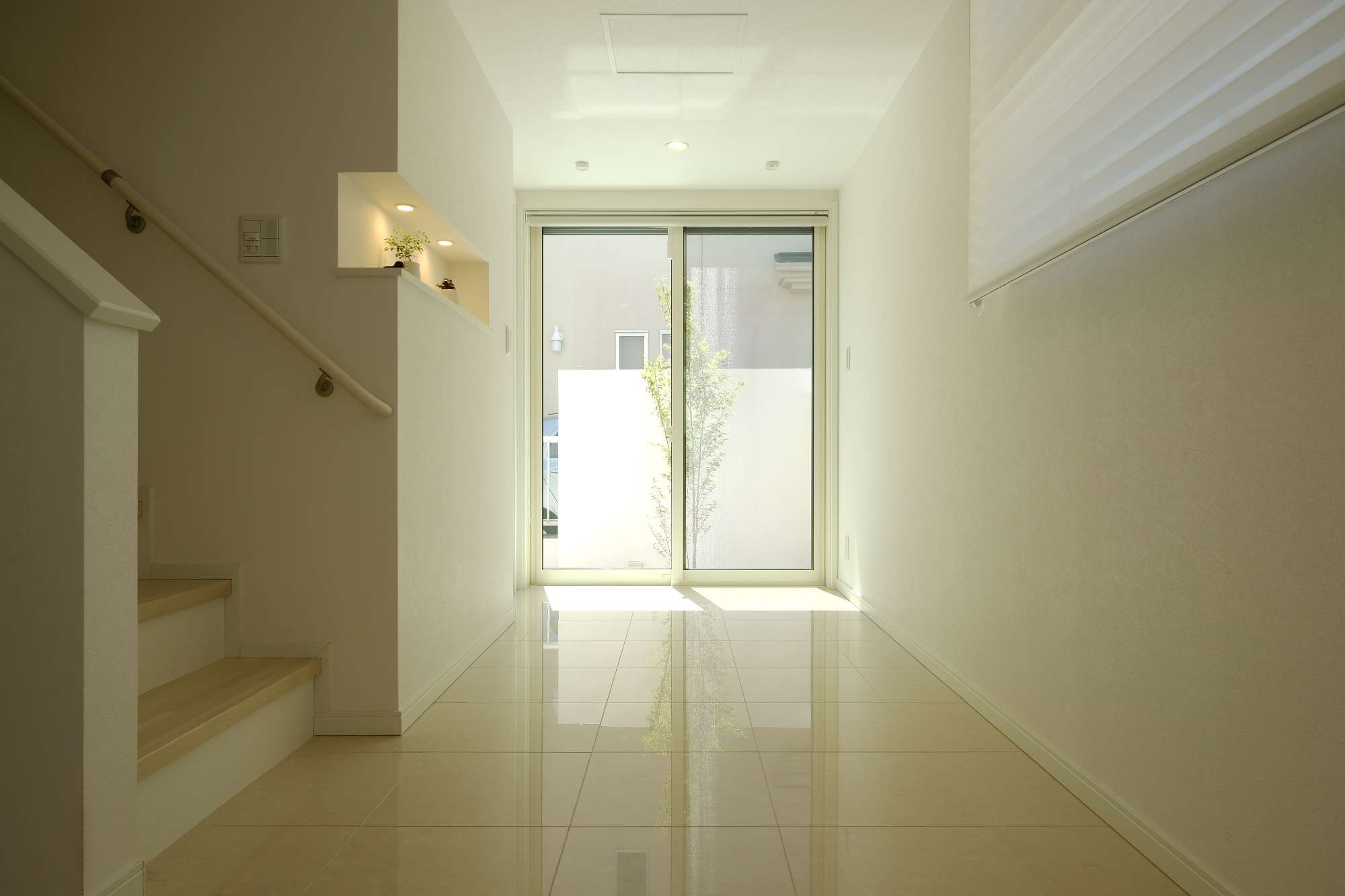 お施主様のこだわりで広い面積を確保したという玄関ホール。この玄関ホールからは、白い塗り壁をキャンバスにしたシンボルツリーのヒメシャラを見る事ができます。このヒメシャラにはスポットライトも仕込まれていて、夜も楽しむことができます。