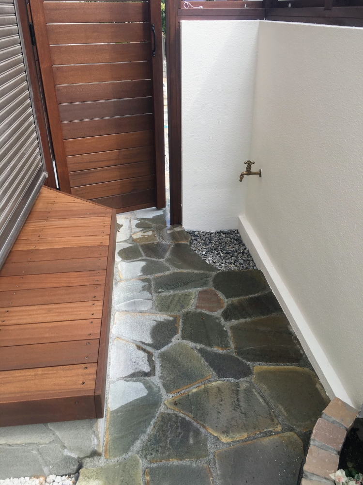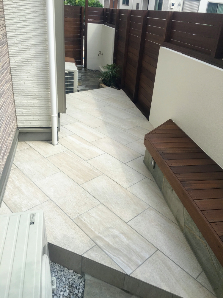 既存の土留めブロックへ塗り壁とウッドフェンスを組み合わせた目隠しを施し、お庭内はタイル張りのテラスとウッドベンチを組み合わせたスペースへと変更いたしました。