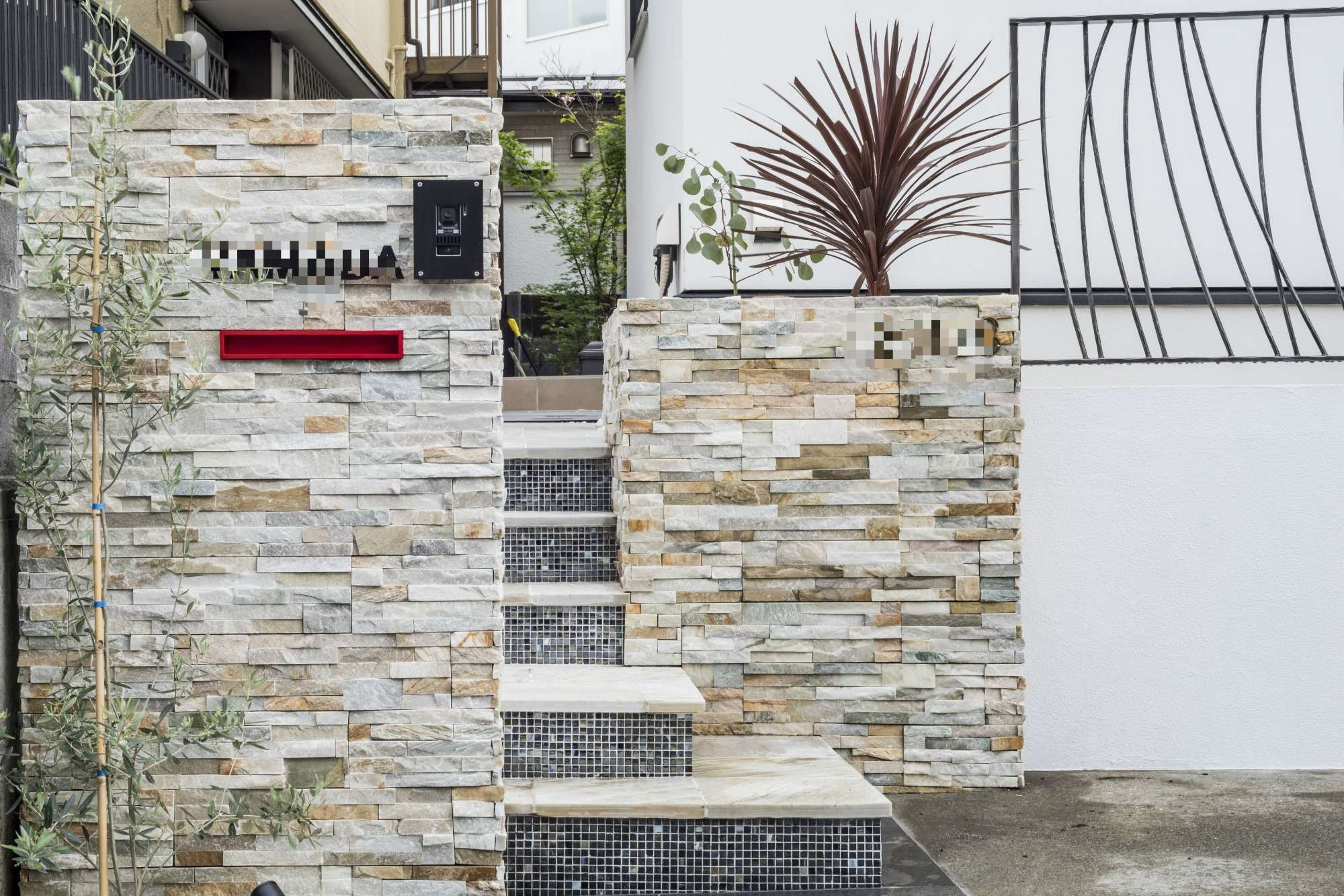 階段の蹴込みにブラックのモザイクタイルと踏面の天然石で高級感と愛らしさを。