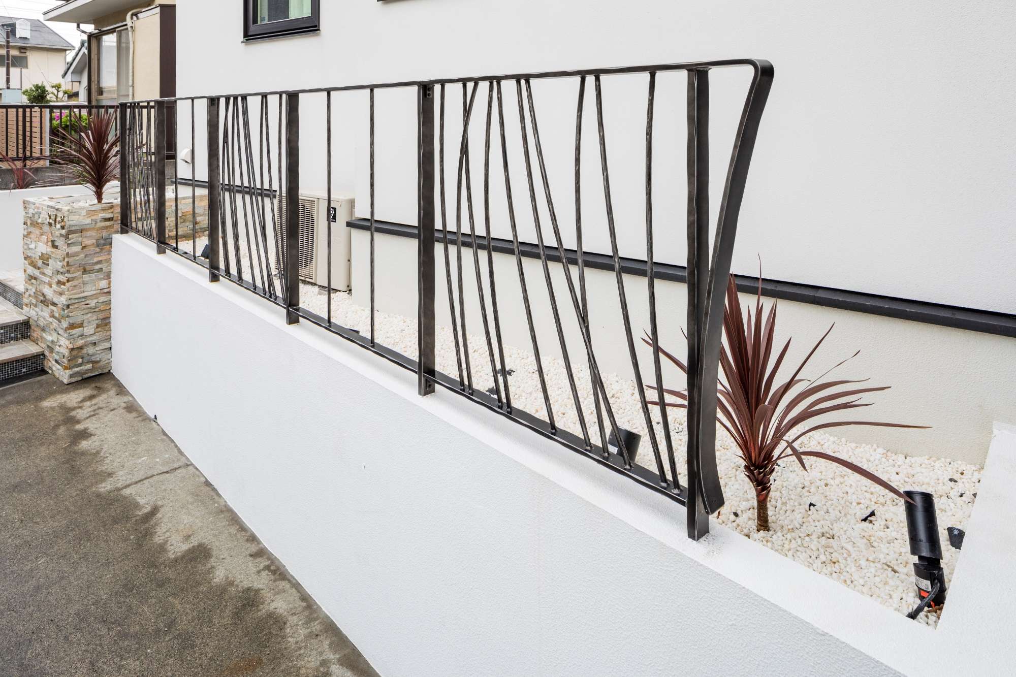 お家のイメージを大きく左右しているフェンスはオンリーワンのボタニカルフェンス。アイアン風のハードな素材の中にも柔らかい曲線が入りホテルの水場をほんのりと。