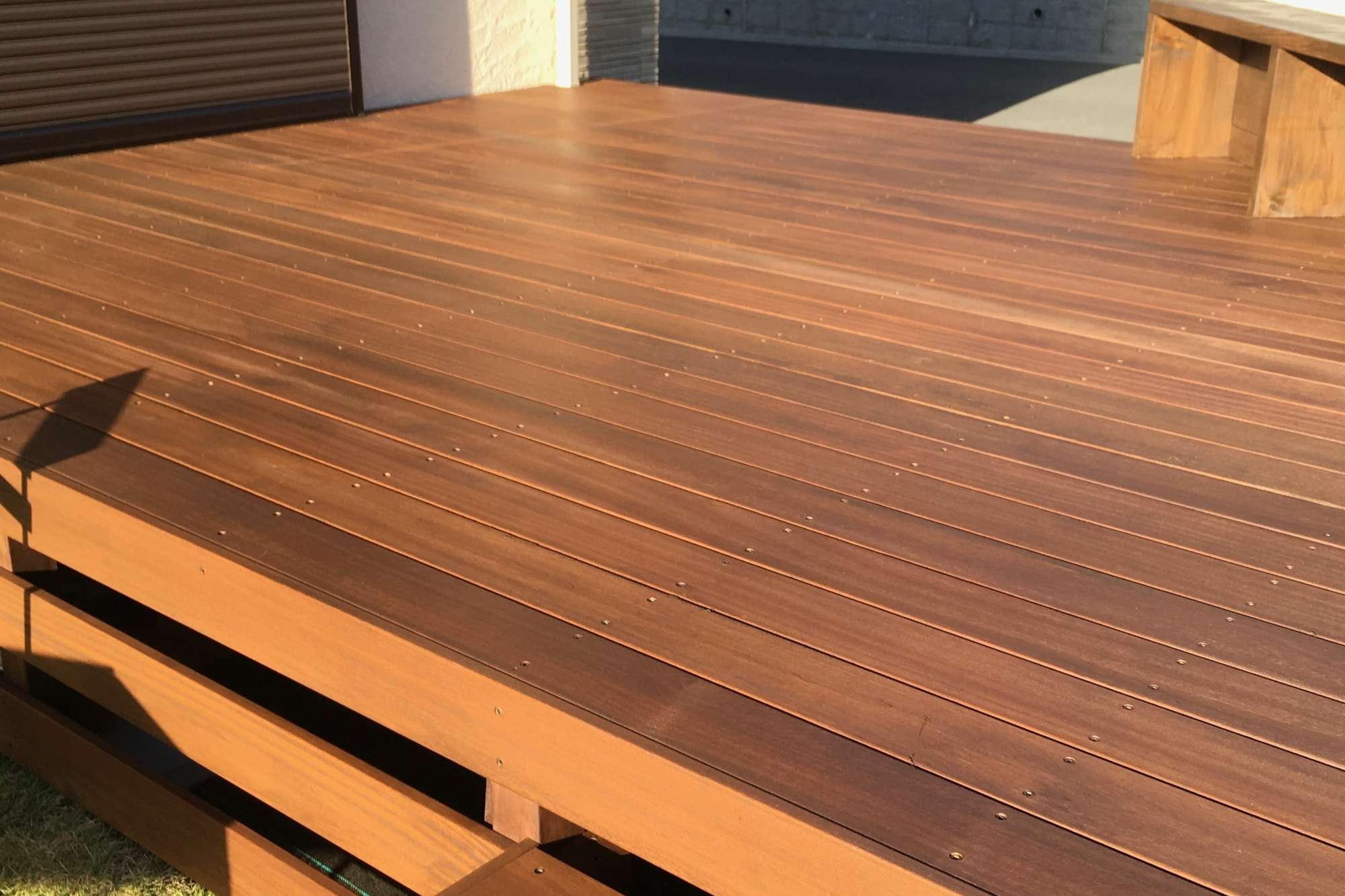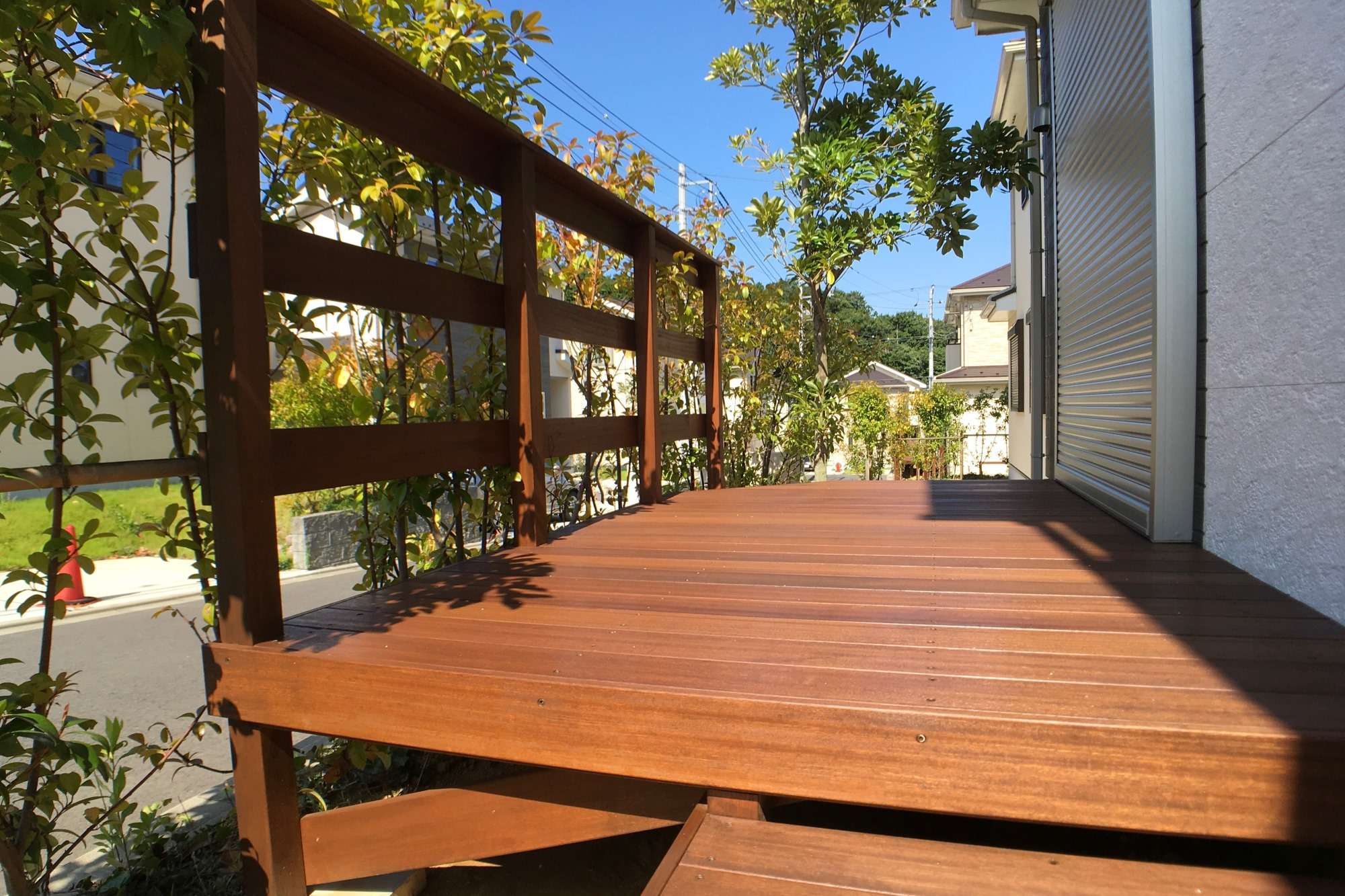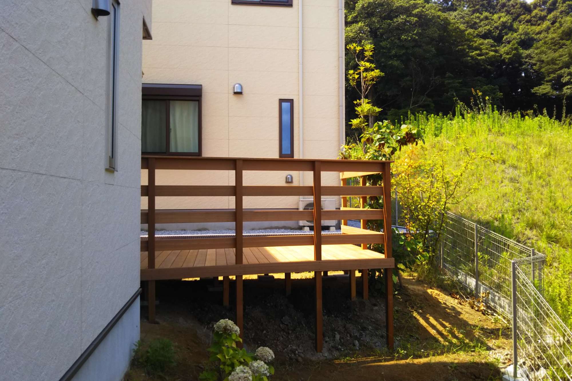 裏ののり面は植栽を植える空間として使用することができなかったので、ウッドデッキを設けて有効面積を広げ、くつろぎの空間として活かしました。