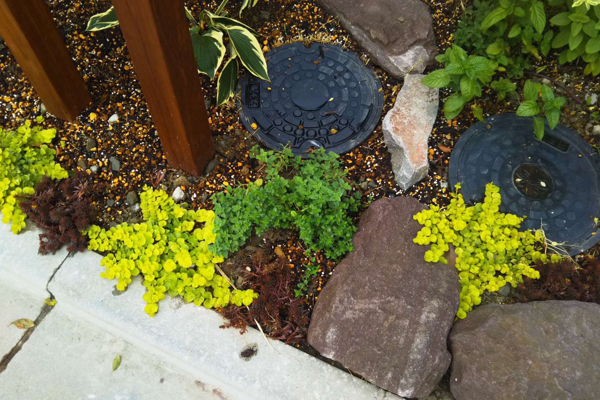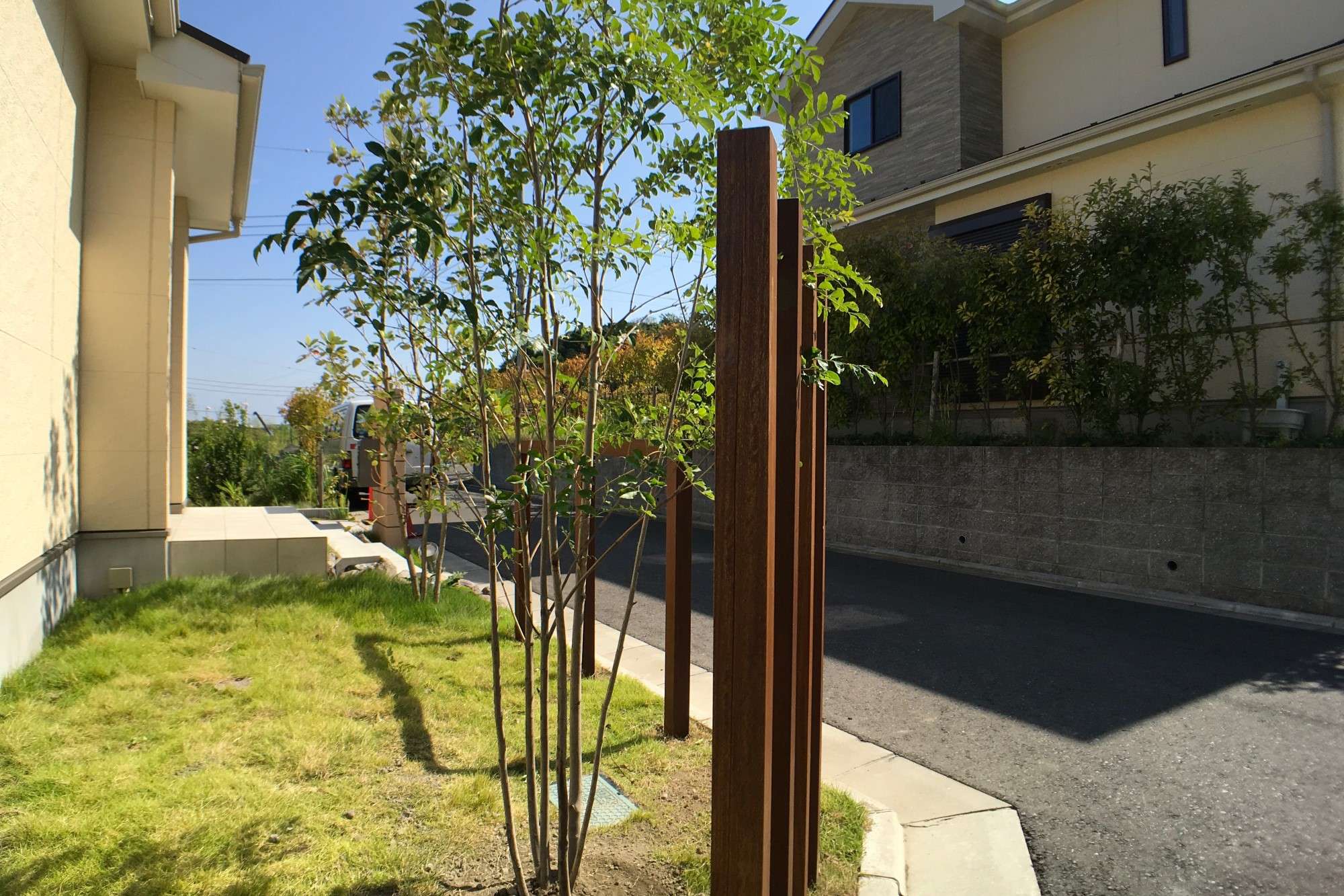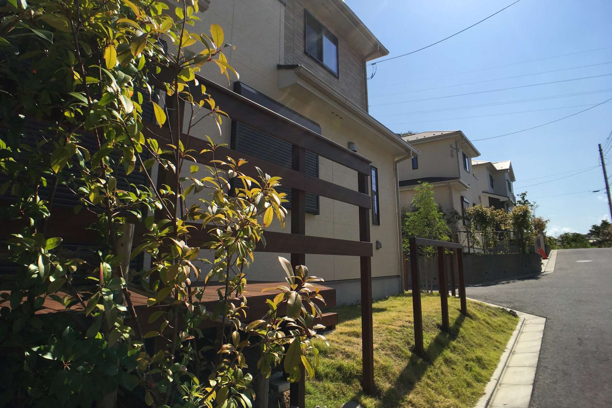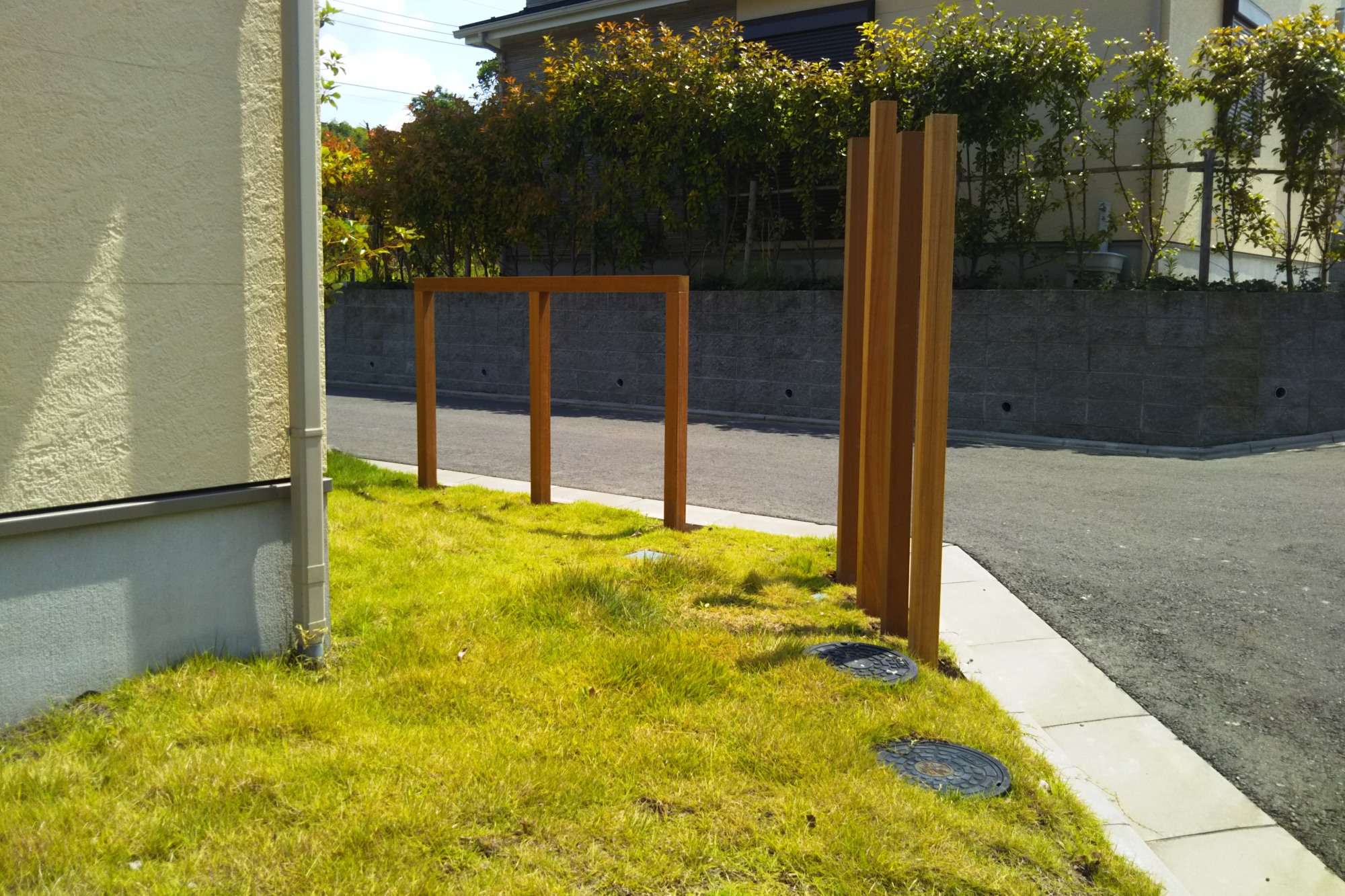 玄関アプローチにはウッド支柱、植栽を設けて統一感を出し、各々にはそれぞれの個性を持たせました。