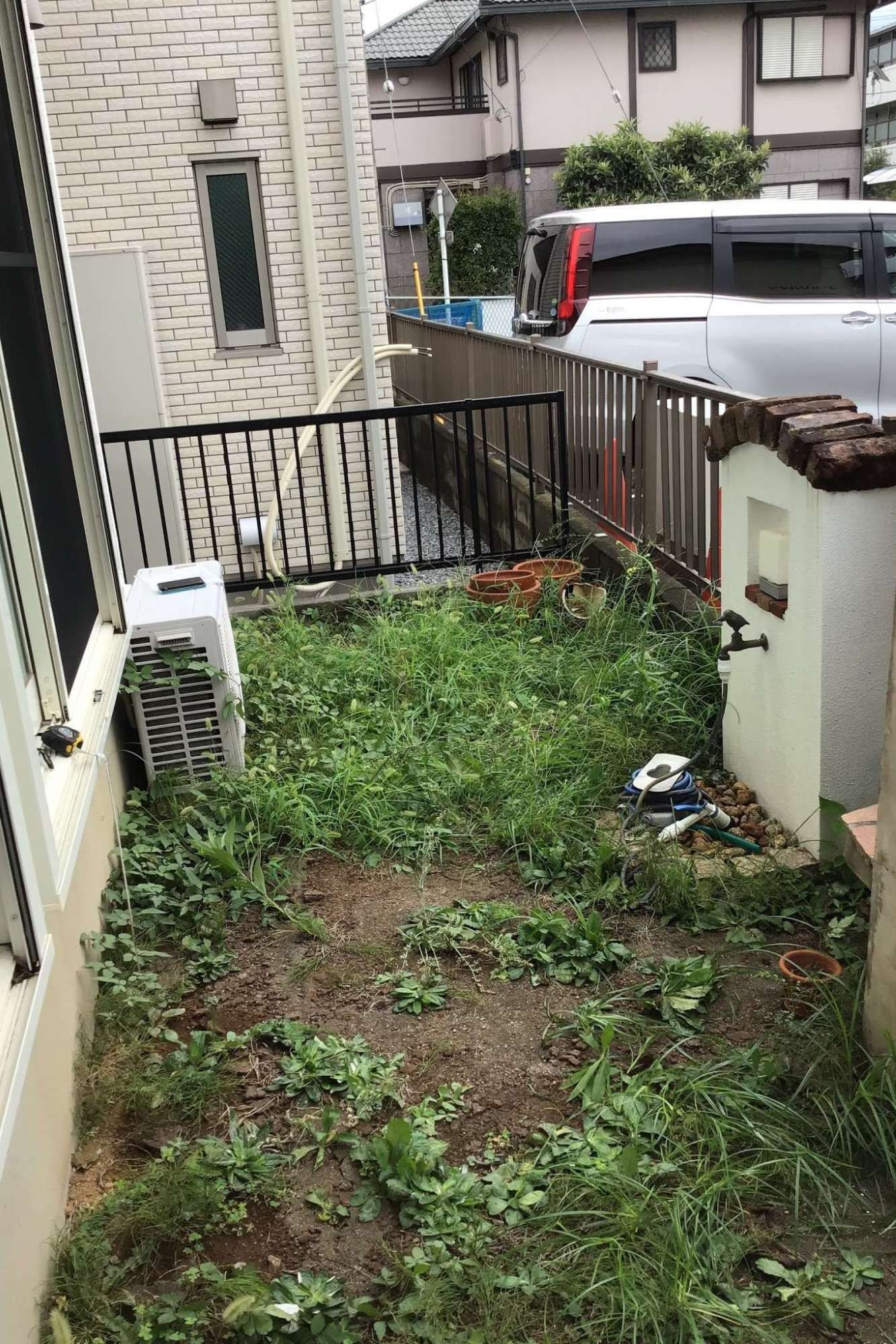 施工前のお庭は、南向きで日当たりも良いため、雑草が茂り、蚊も多く、ほとんど活用できていないとのことでした。