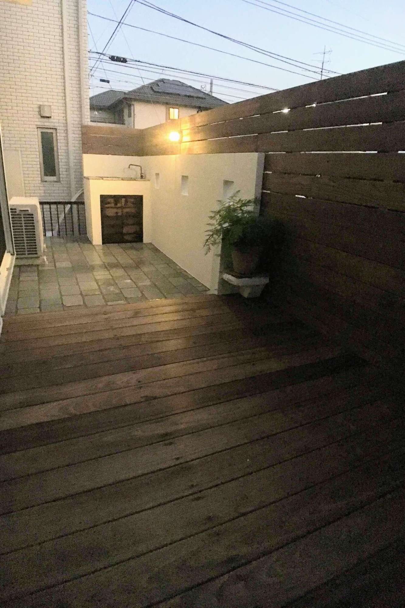 お庭入り口部分にはガーデンシンクを配置、石張りの面から一段上がると、掃き出し窓からの出入りが容易なウッドデッキになります。隣接する駐車場からの目隠しは、塗り壁とウッドフェンスの組み合わせで単調にならないよう工夫しました。