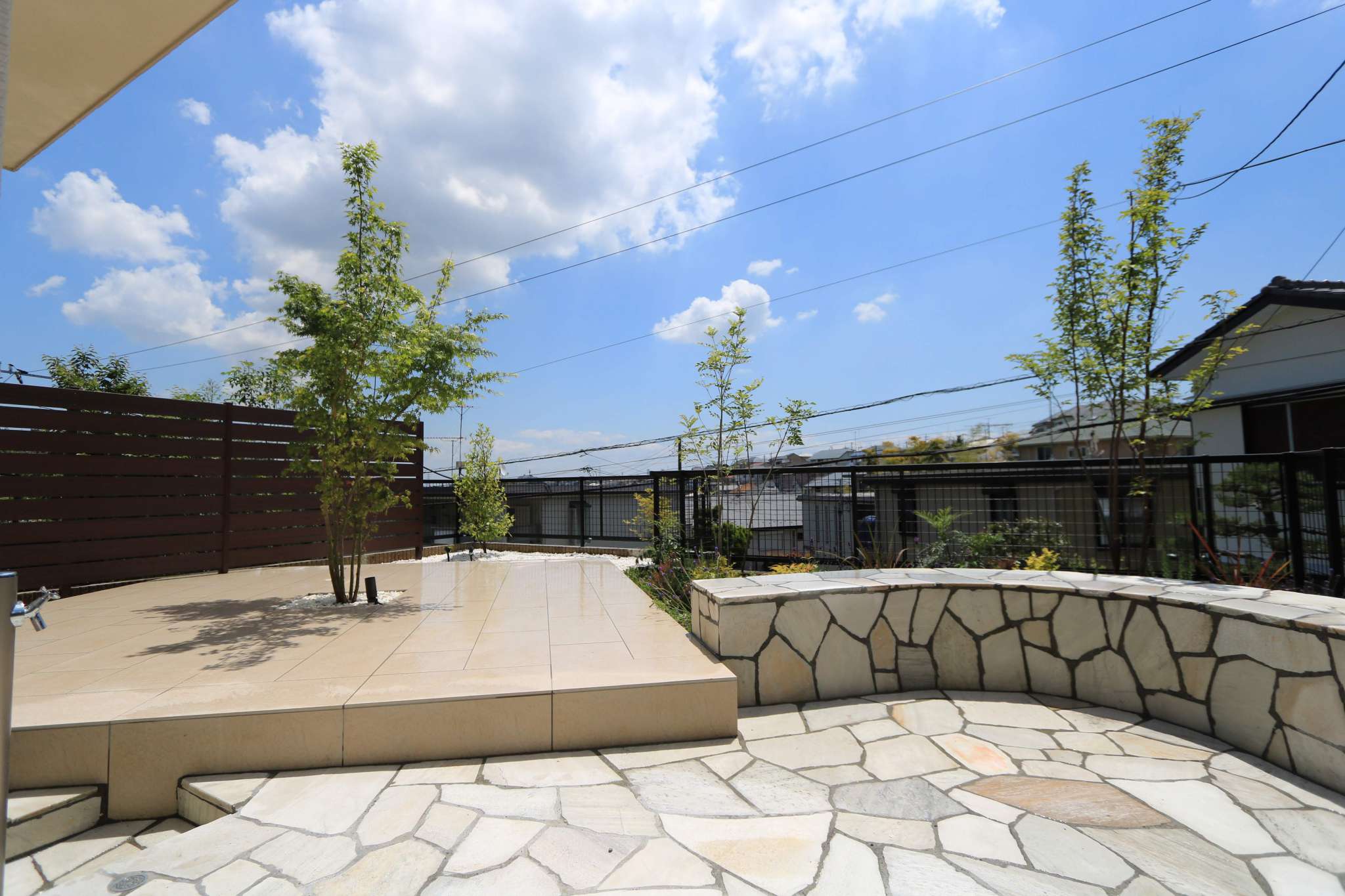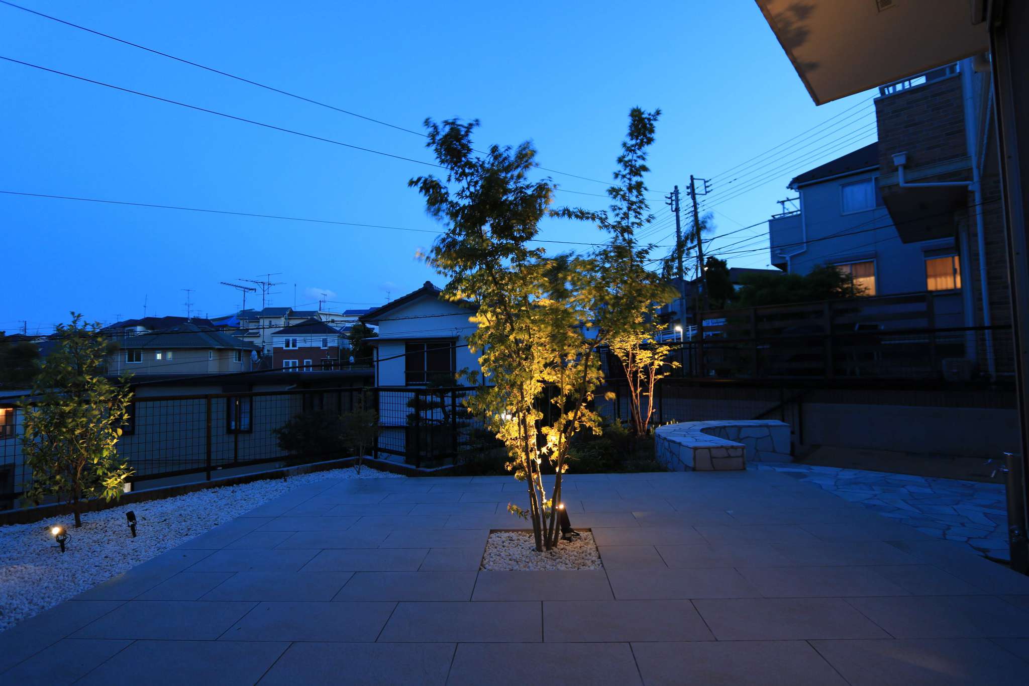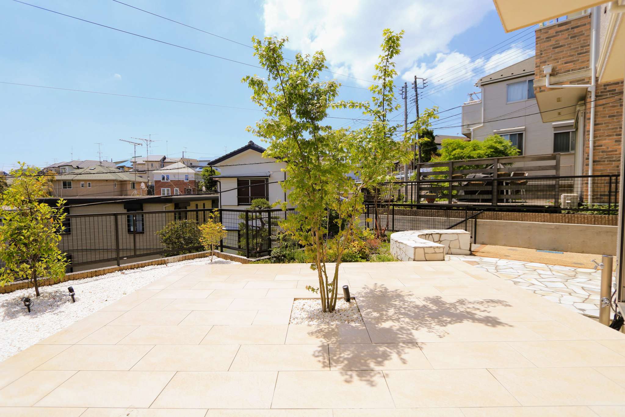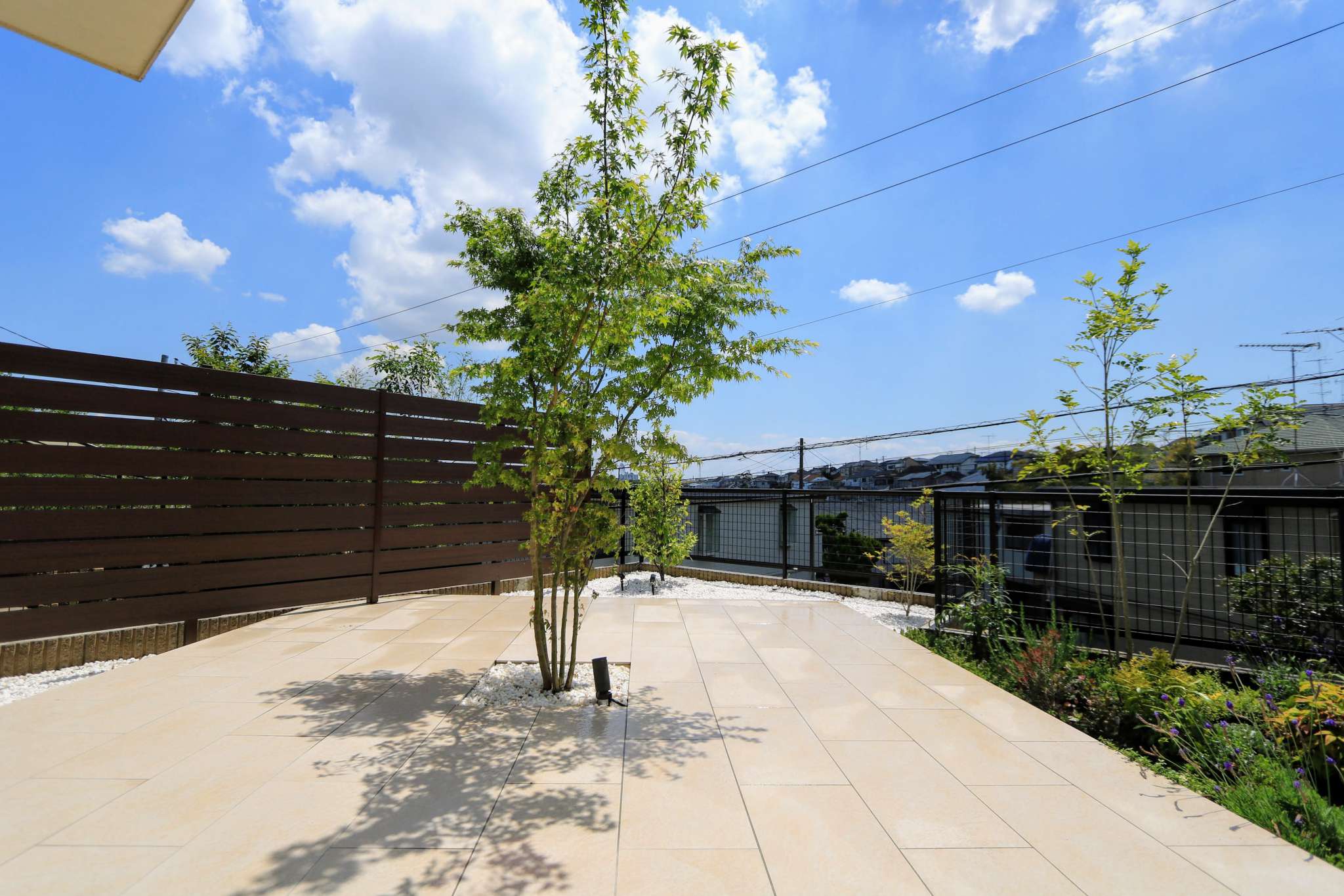スクエア型の広いタイルテラスの中心にシンボルツリーのモミジが植わっています。モミジは室内からもよく見えるように、掃出し窓の前に配置しました。