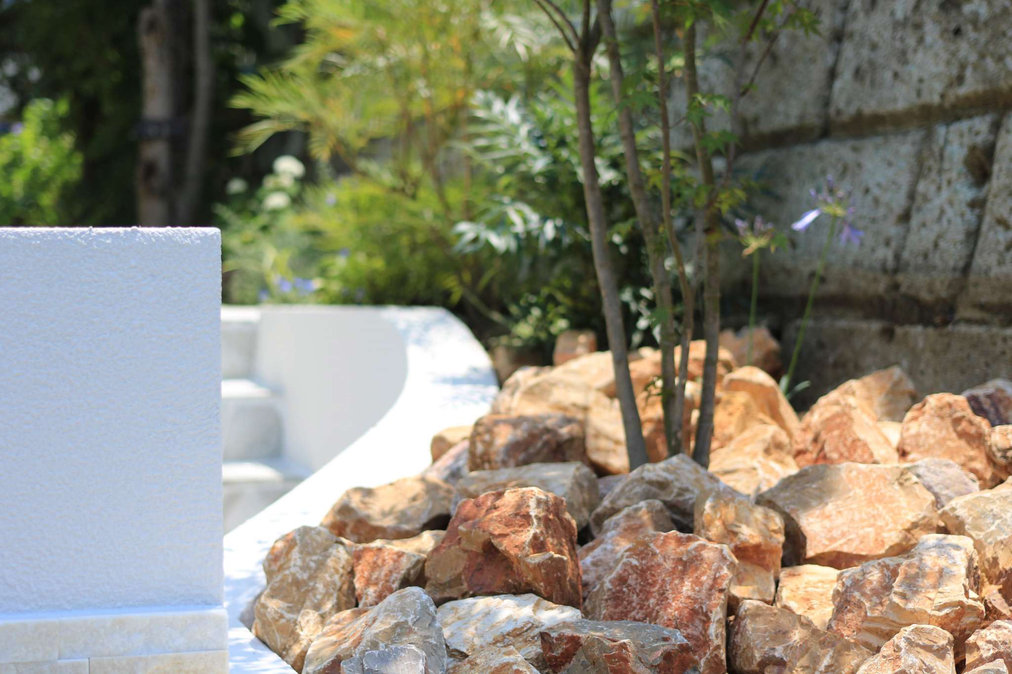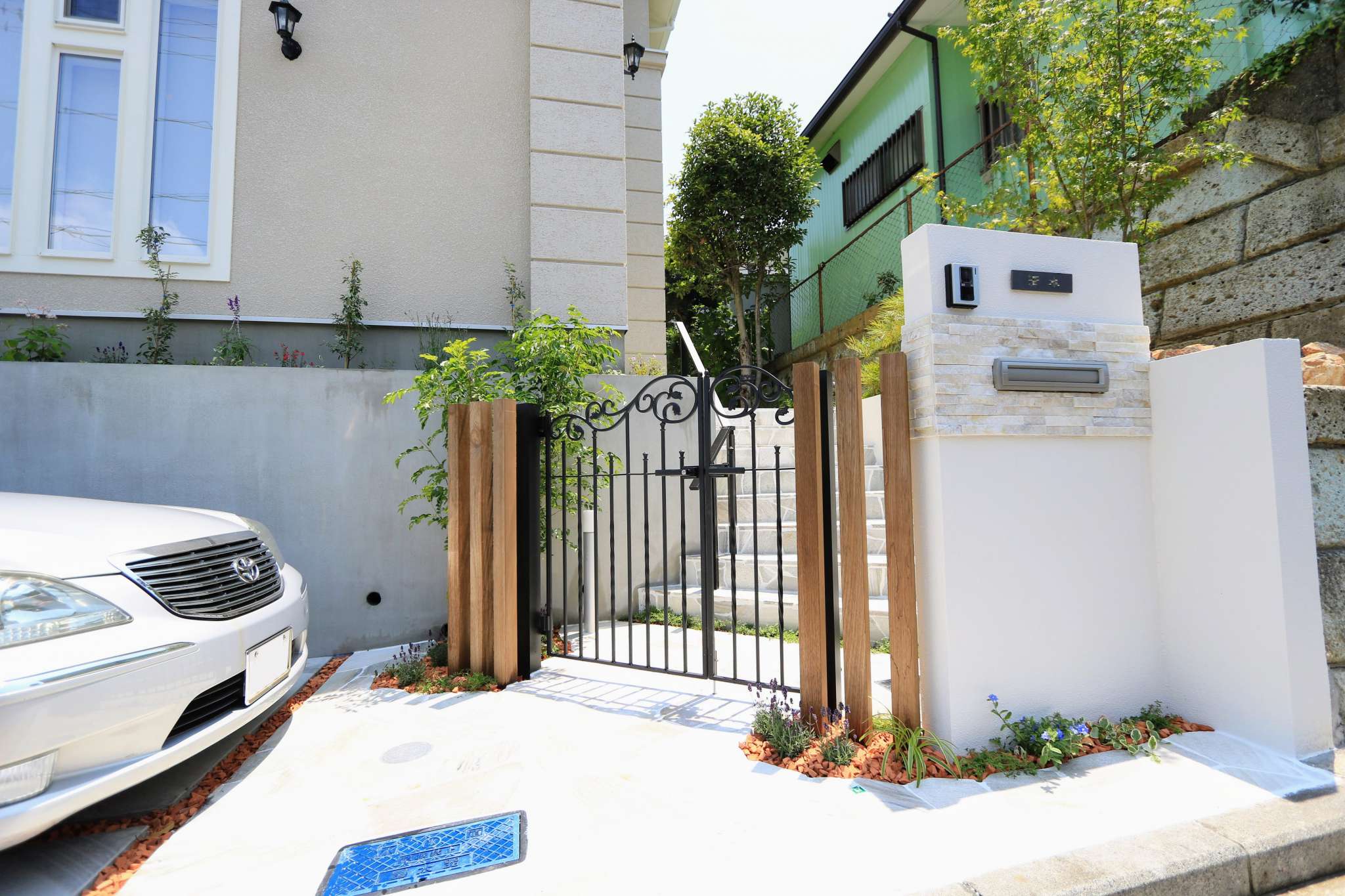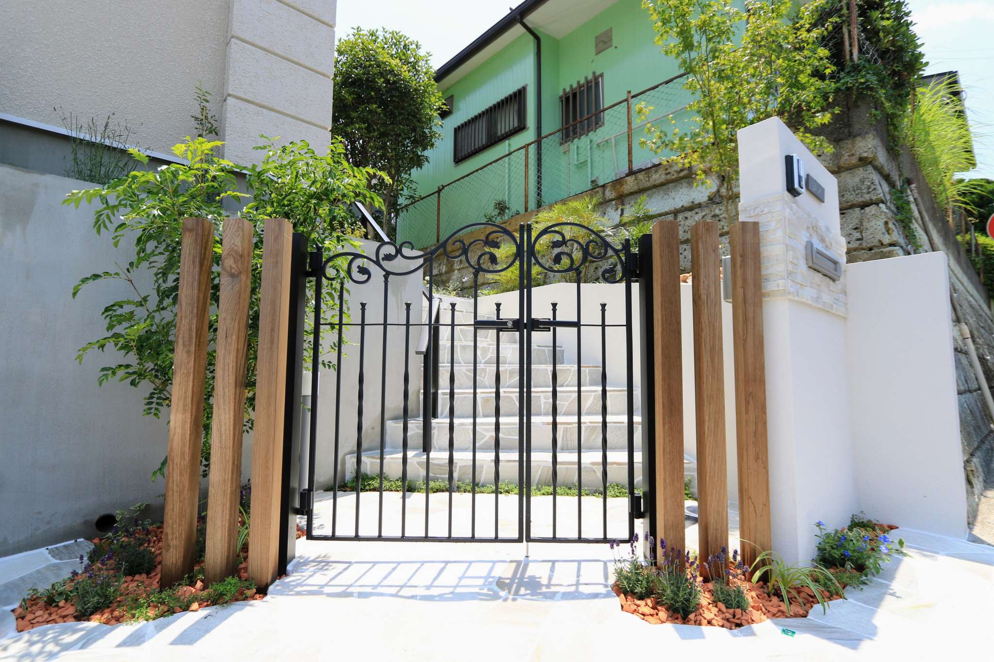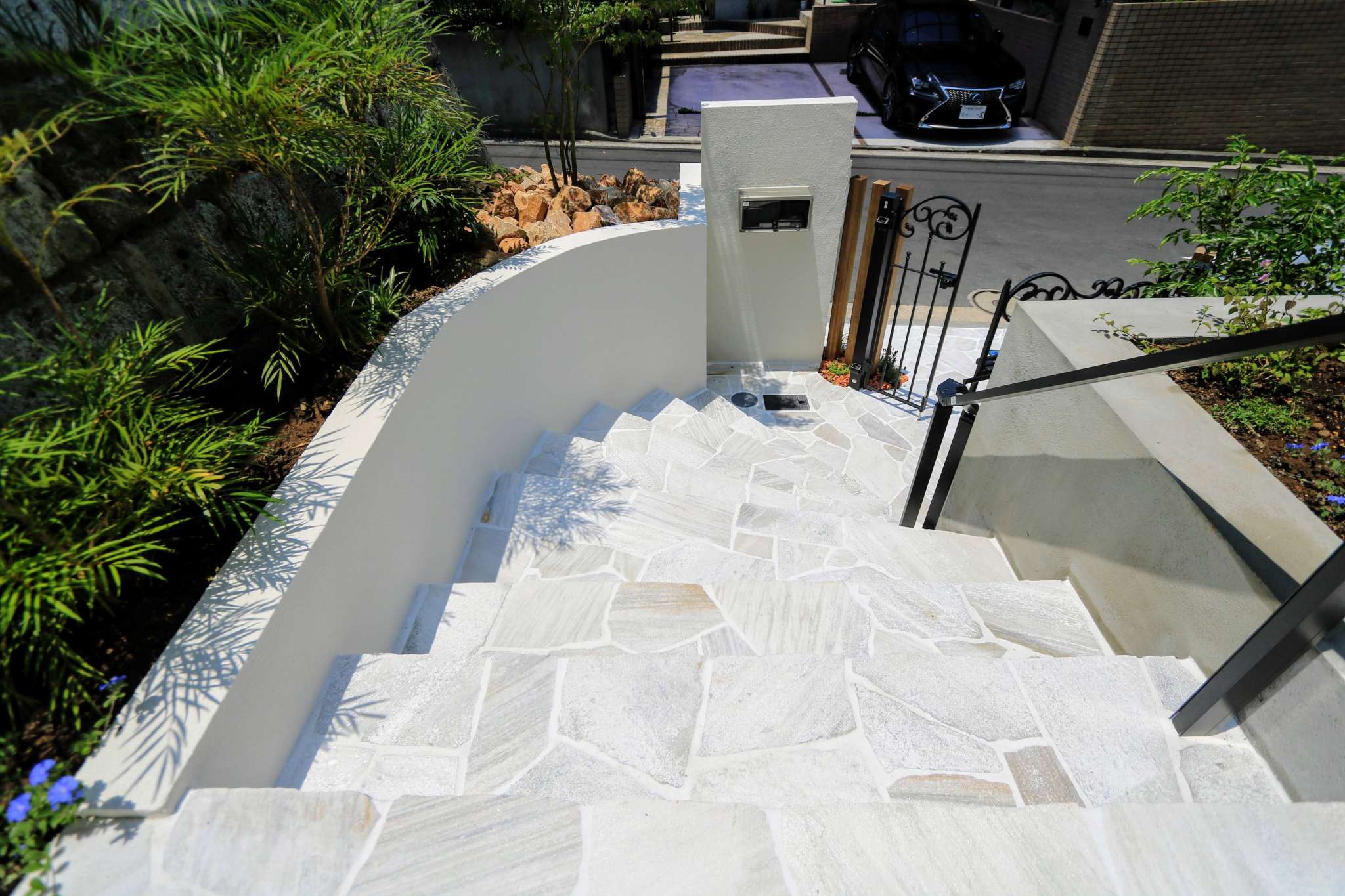 曲線を描いた石張りのアプローチ階段は、白目地が上品さを引き立てます。