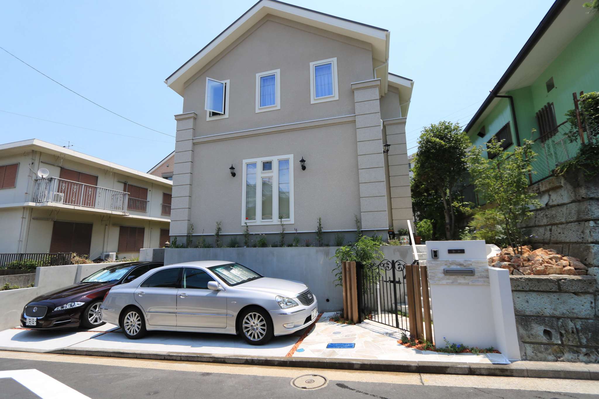 2台の大型セダンが駐車できるスペースと、重厚な新居を引き立てる緑多いアプローチ。