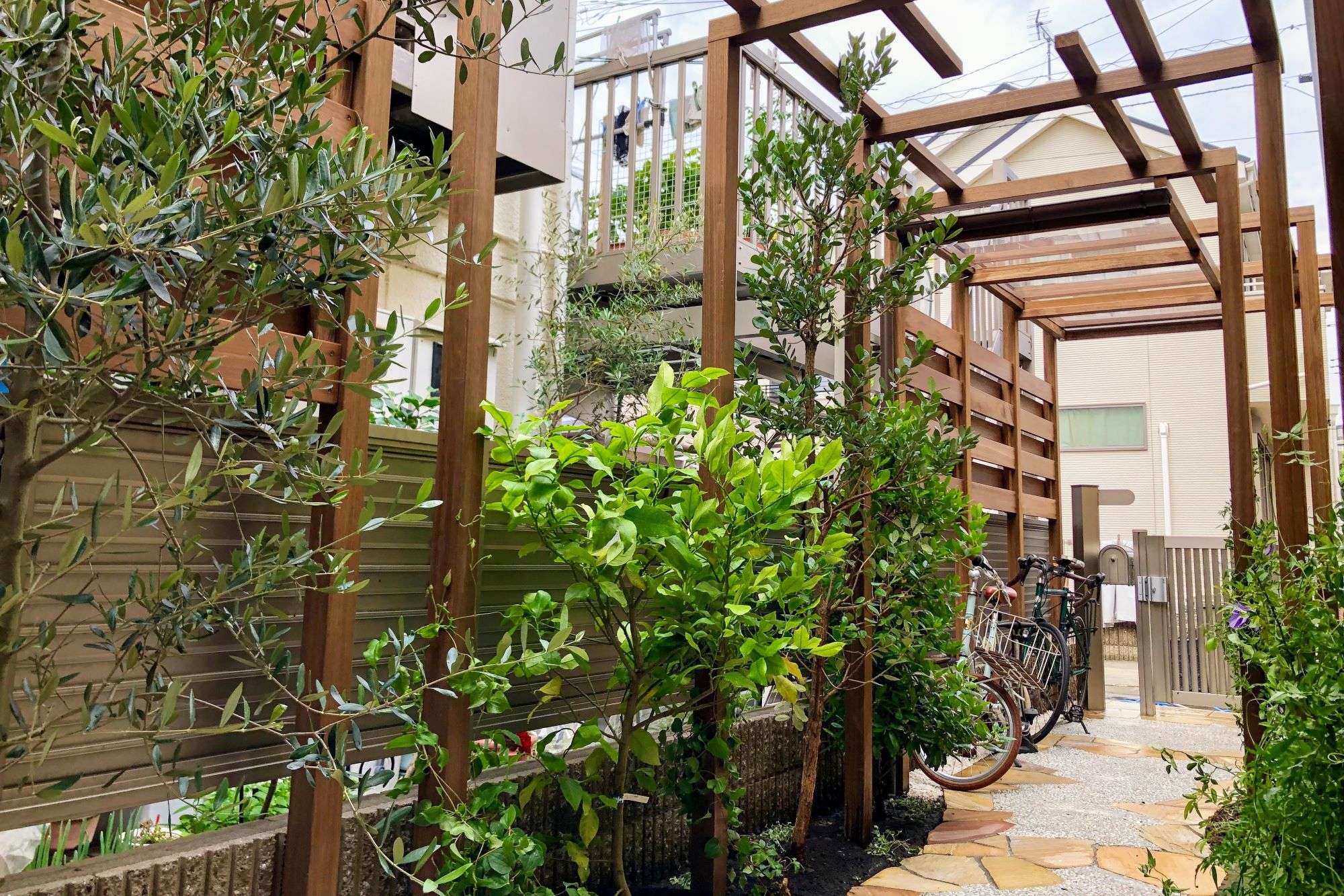玄関アプローチの上に天然木のパーゴラがある外構を今回はご紹介いたします。