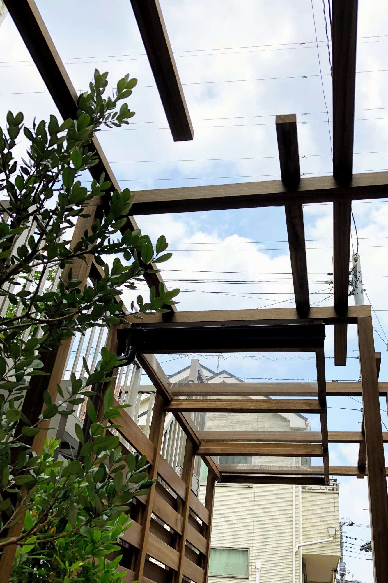 旗竿地の敷地で玄関アプローチが道路から約7mあり、その上に美観と機能性を兼ね備えたパーゴラを施工しました。
