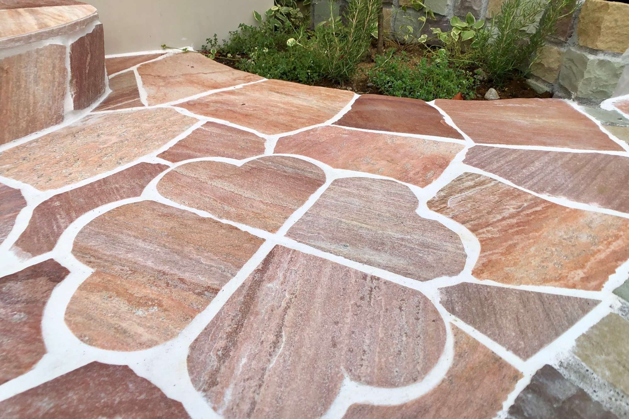 Rの縁には色とりどりのピンコロ石を取り入れ、エントランスの素材と同様にすることで、統一感をだしてあります。