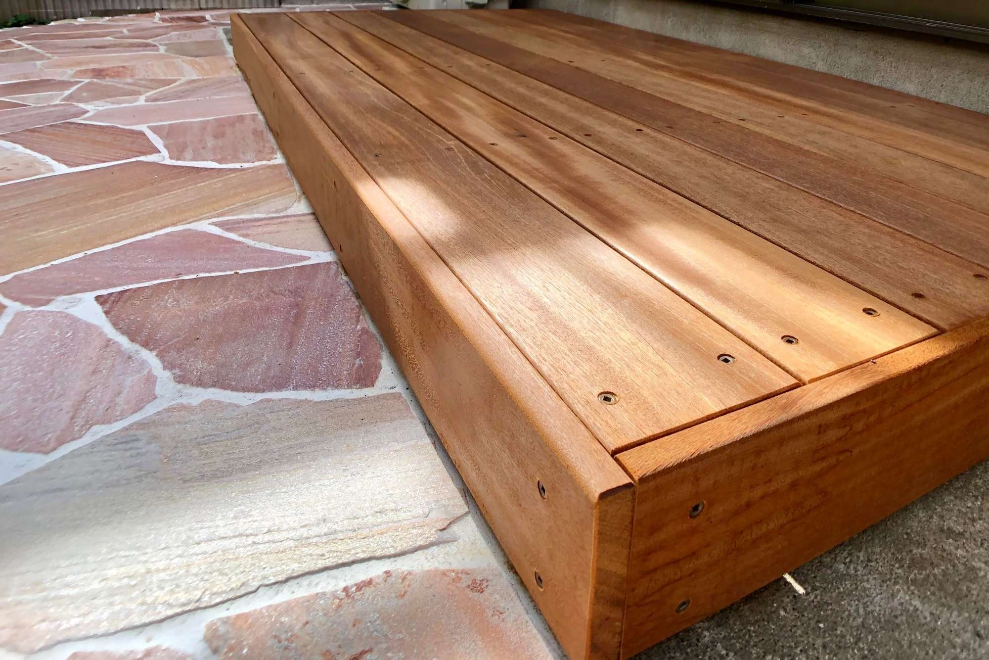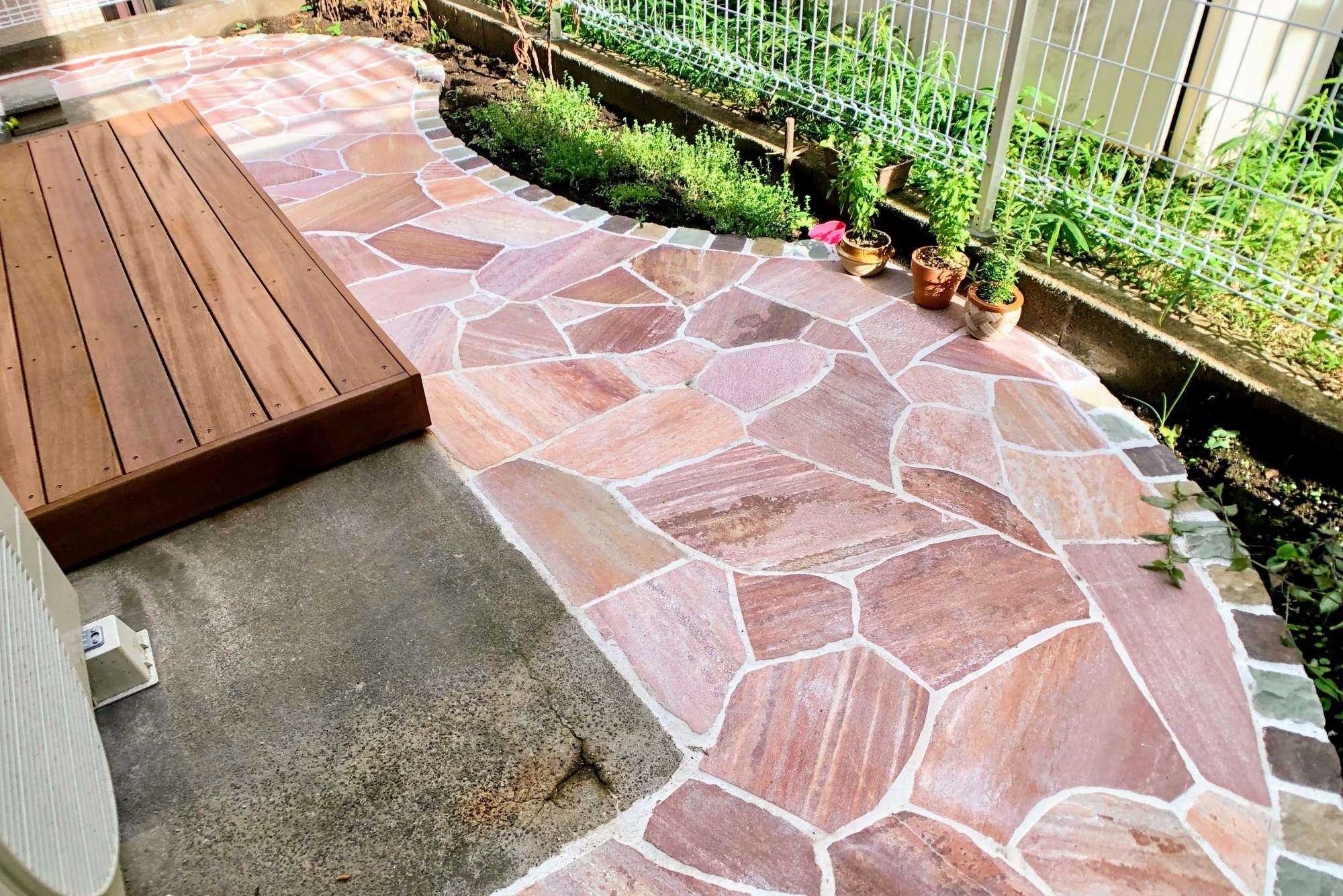 庭側を愛犬が駆け回れる場所へのリフォームをご希望されていたので、掃き出し窓から続く部分にウッドデッキのステップを施工、その先に自然石のテラスをデザインしました。