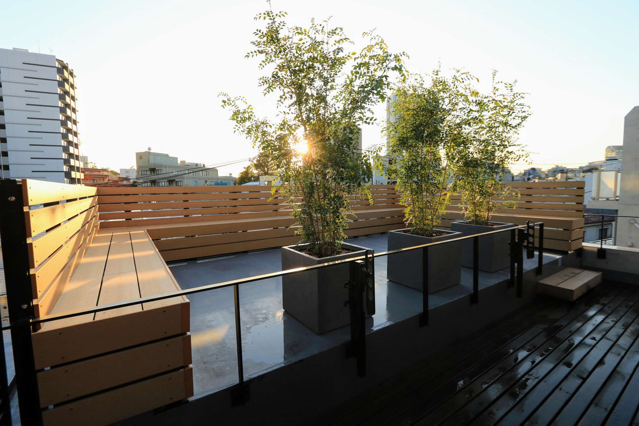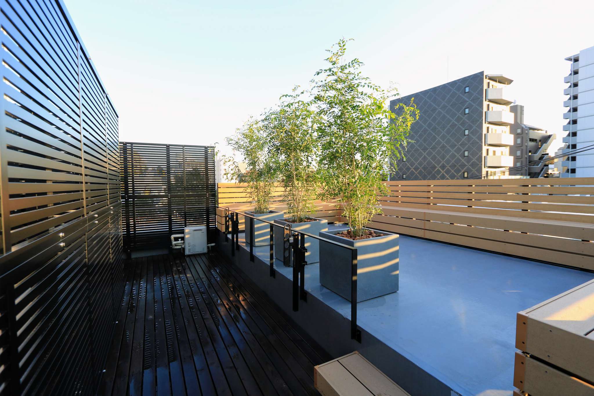 隣地側マンションからの視線を軽減でき、十分なサイズのベンチが設置されたことで、都会のど真ん中とは思えない解放感のあるスペースとなりました。