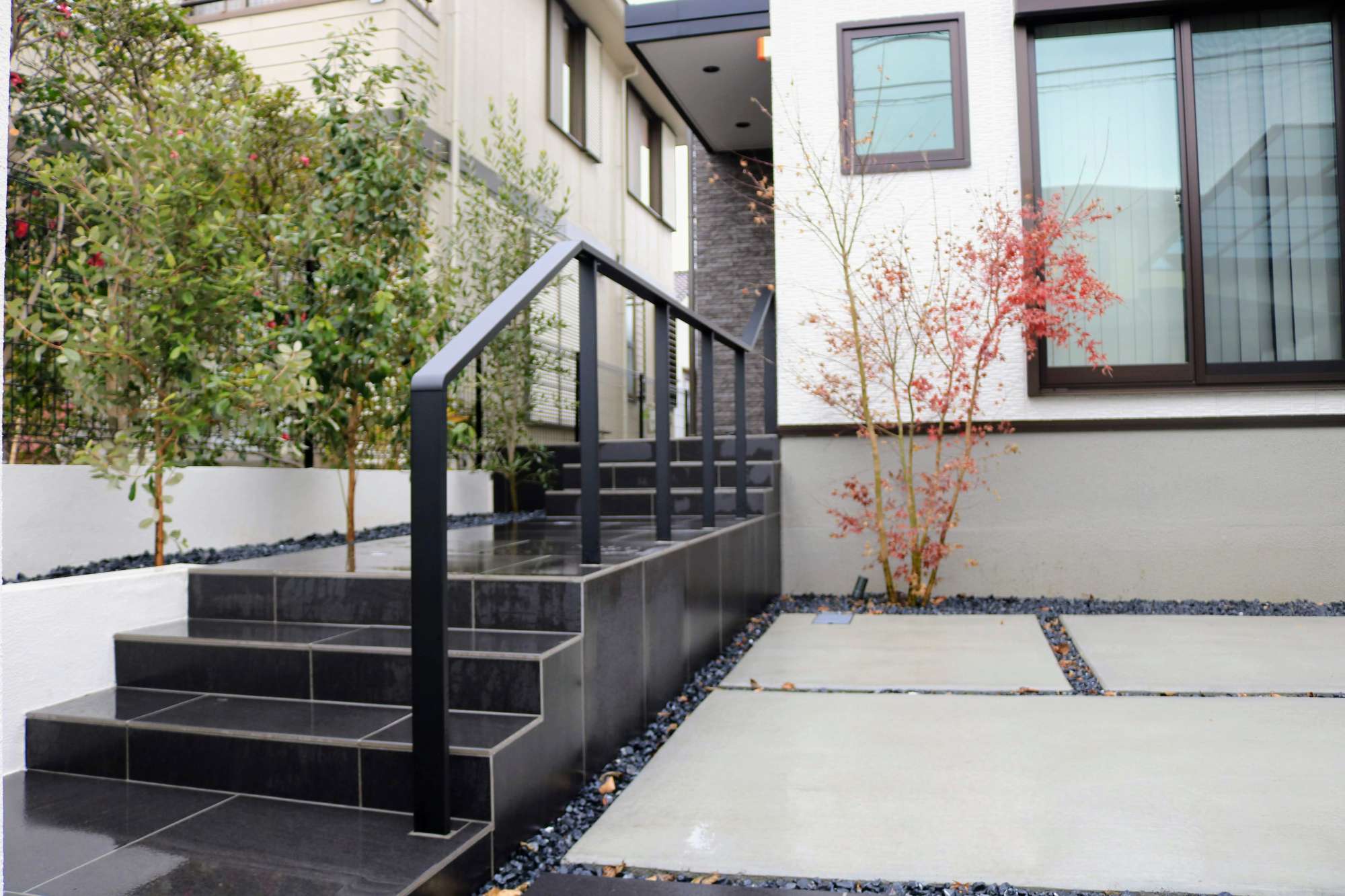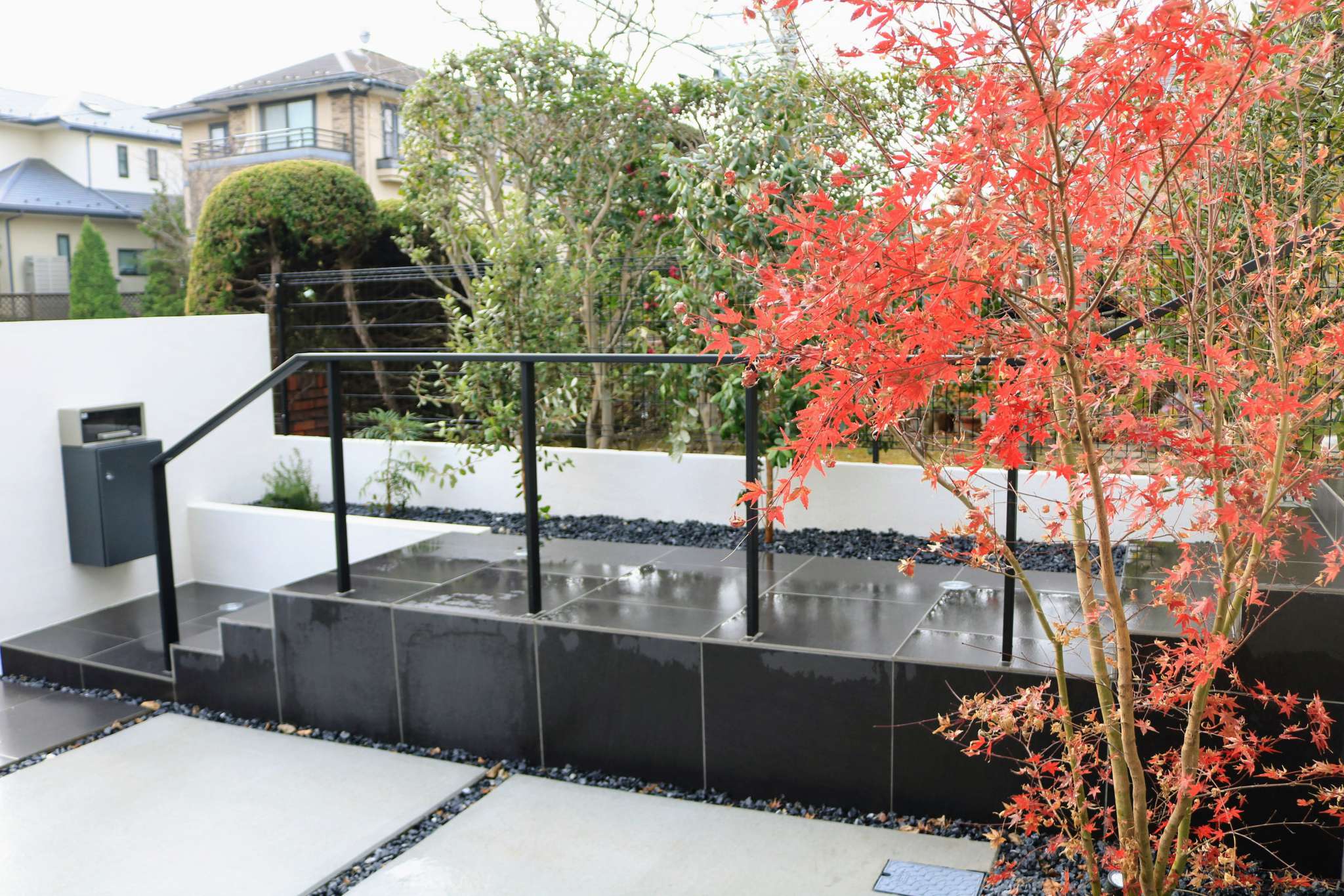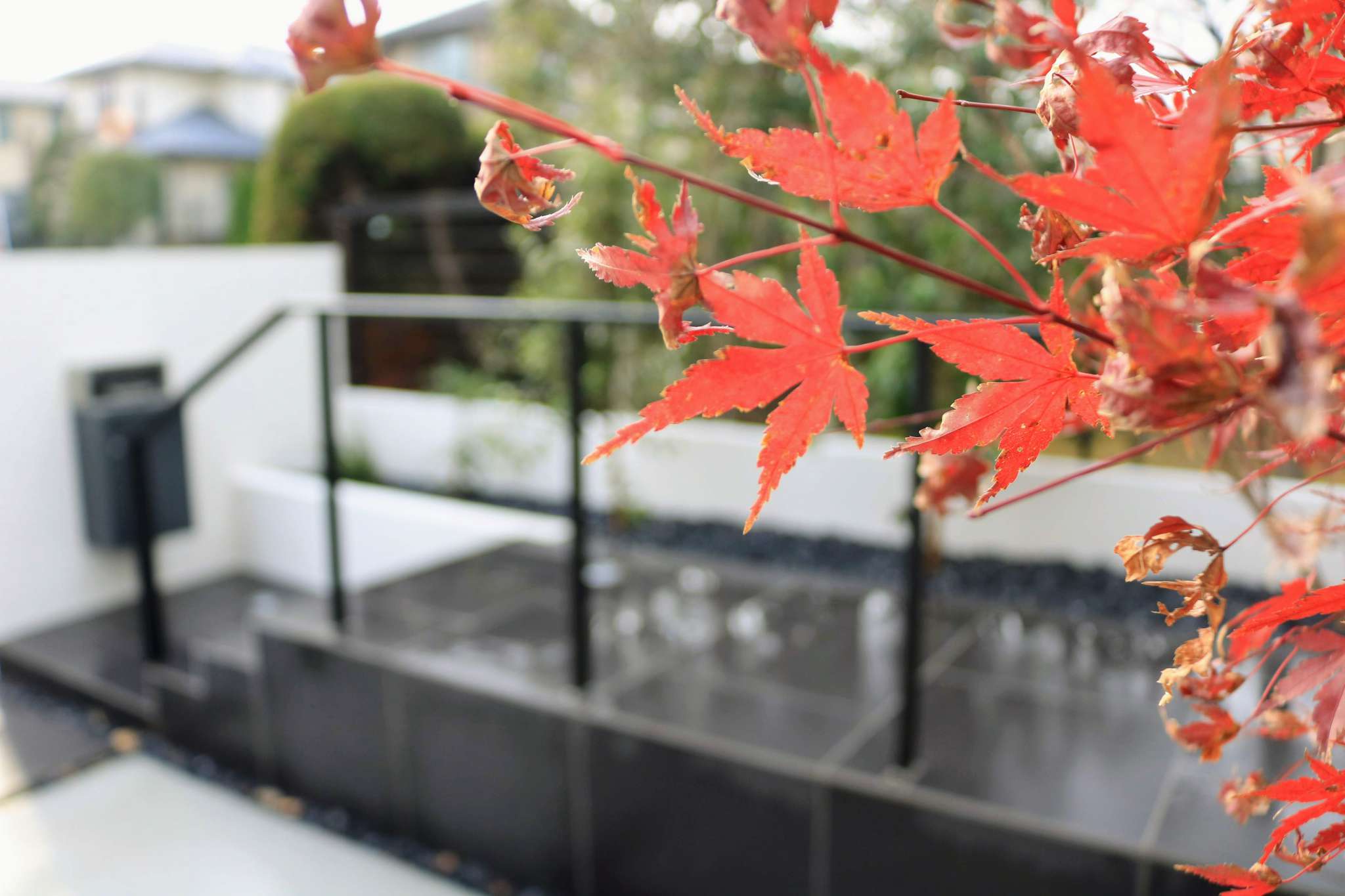 シンボルツリーのモミジは赤く紅葉し、モノトーンの色味の中で季節を感じられます。