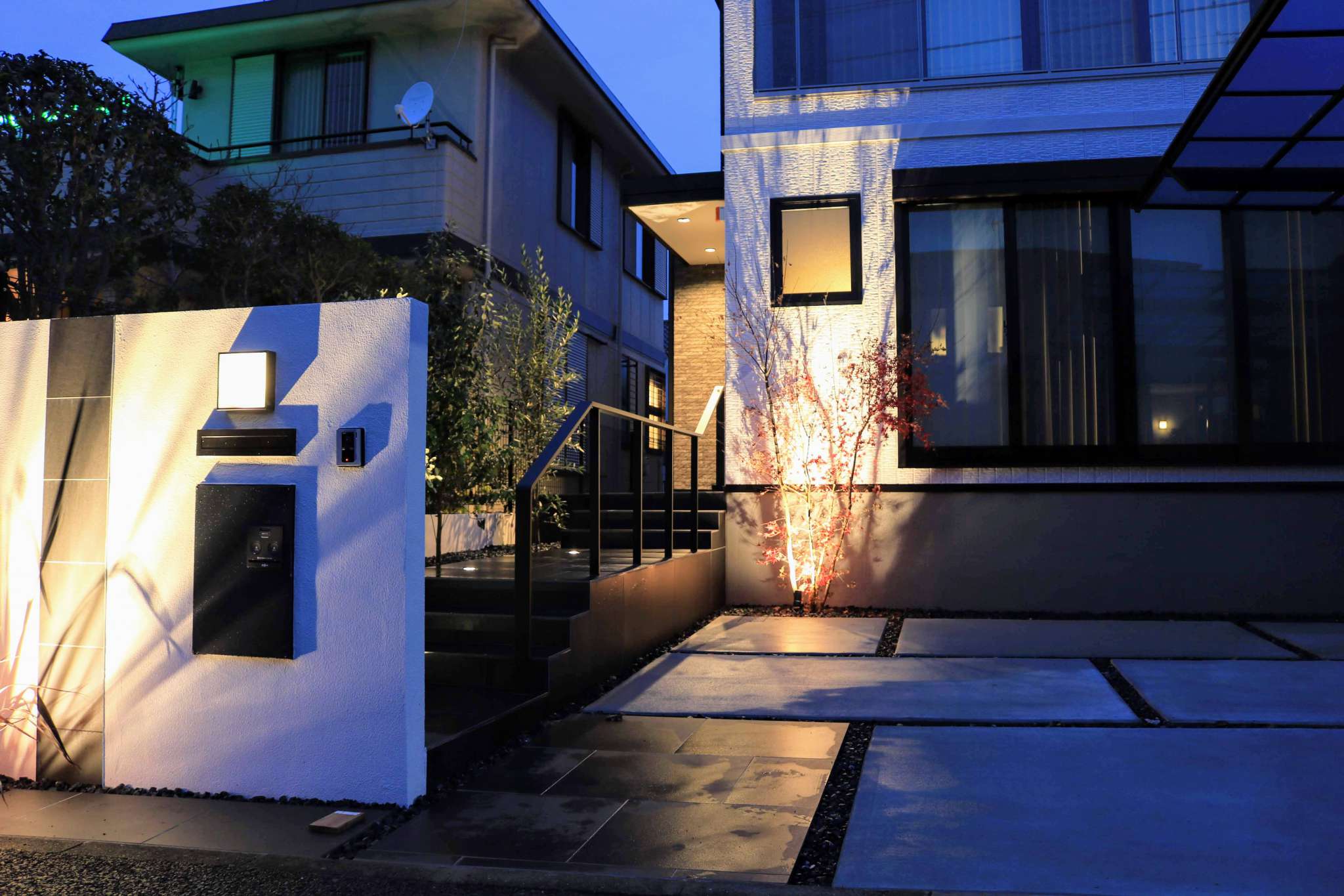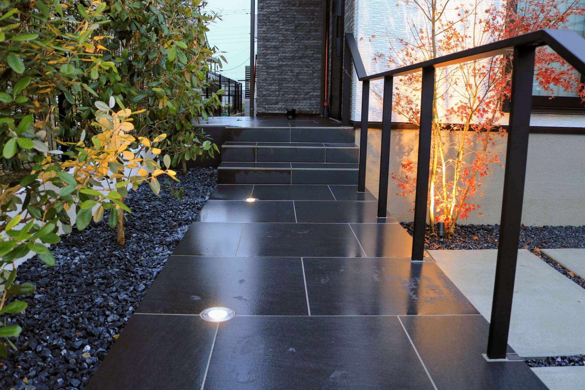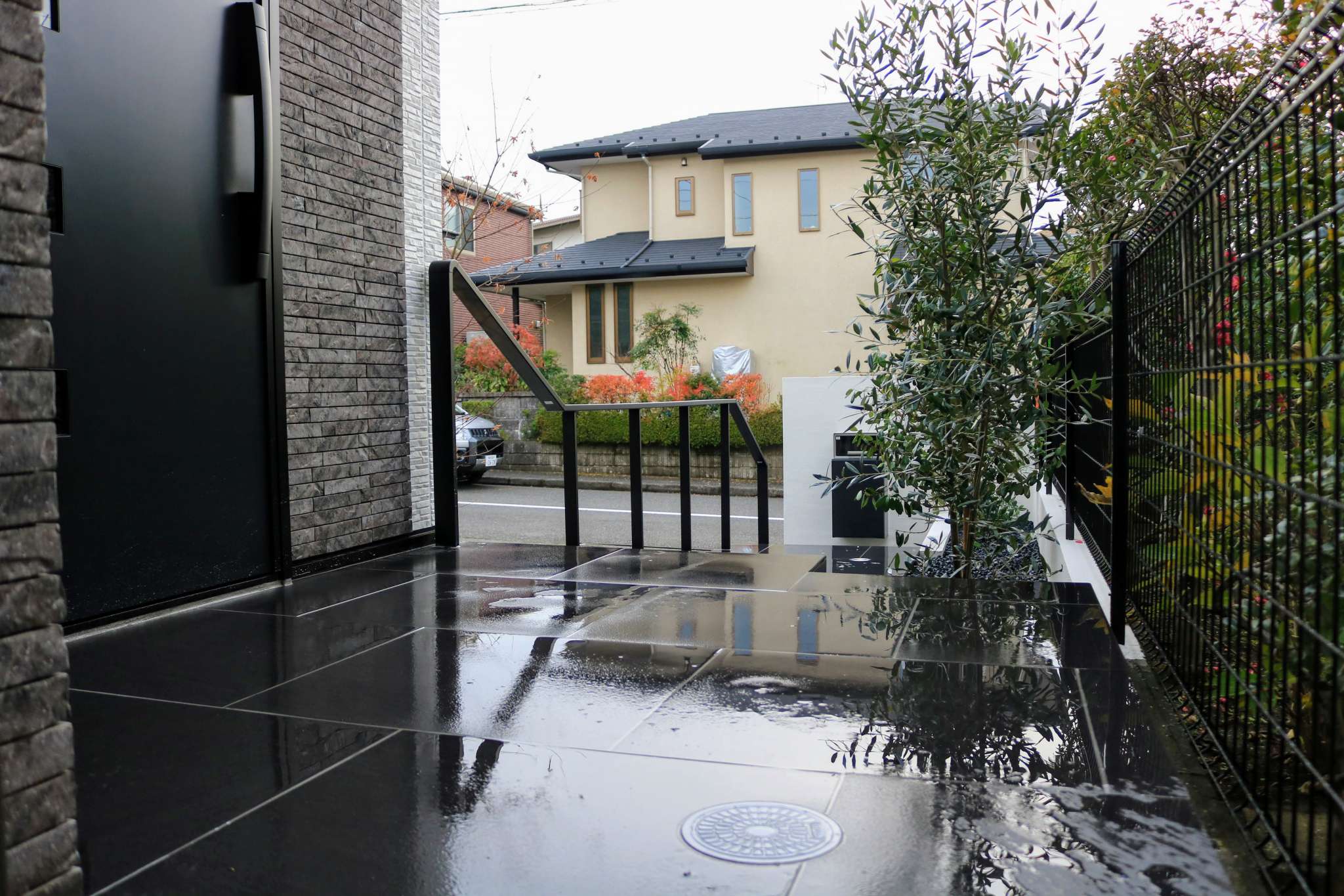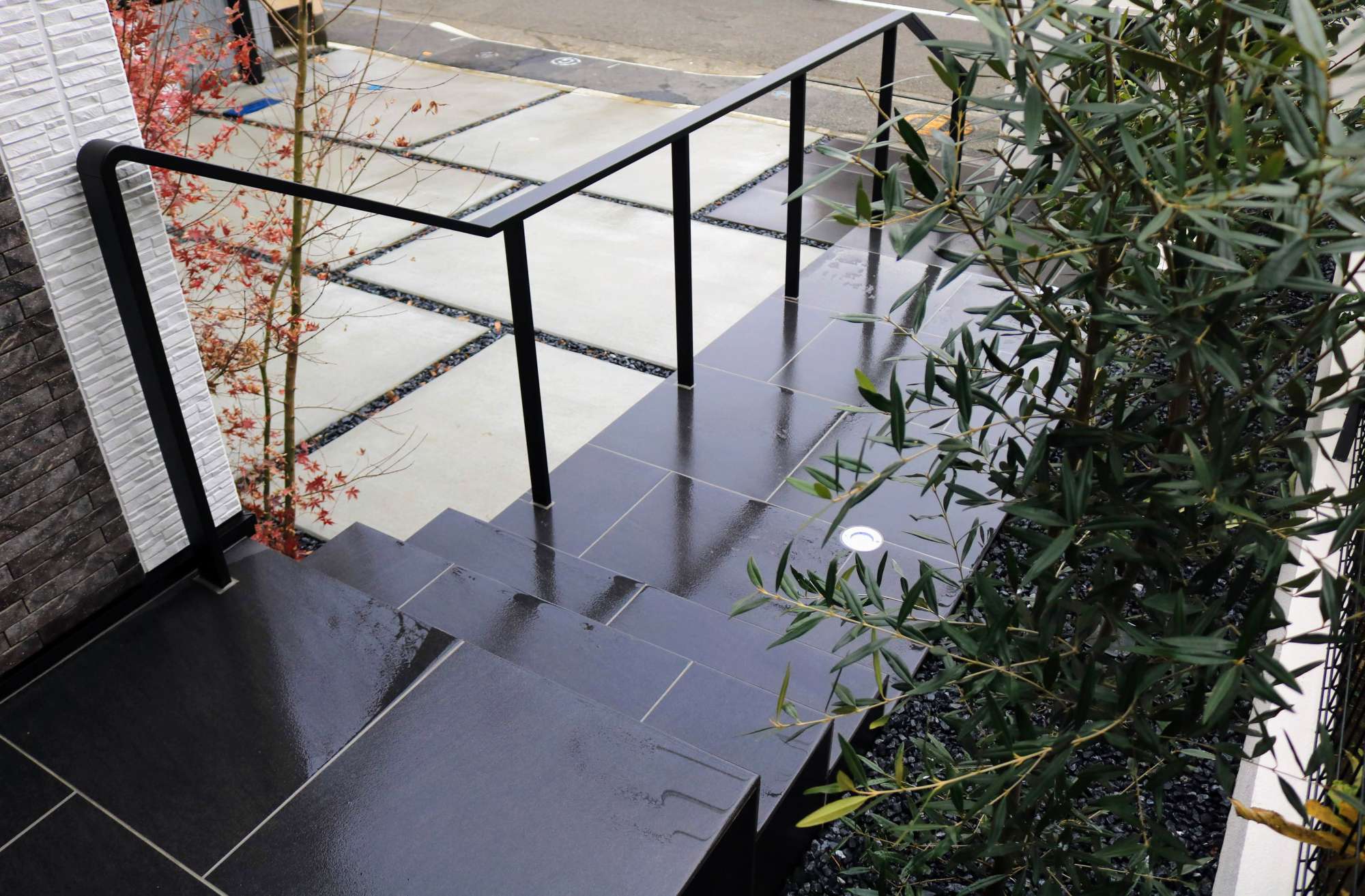 手すりにはリクシルのデザイナーズレールを採用し、シンプルでミニマルなデザインですっきりとした外構となりました。