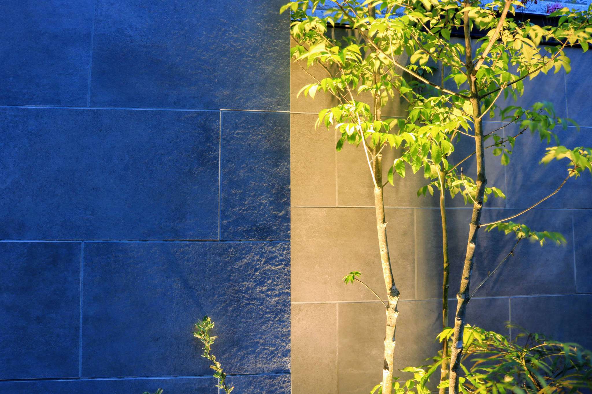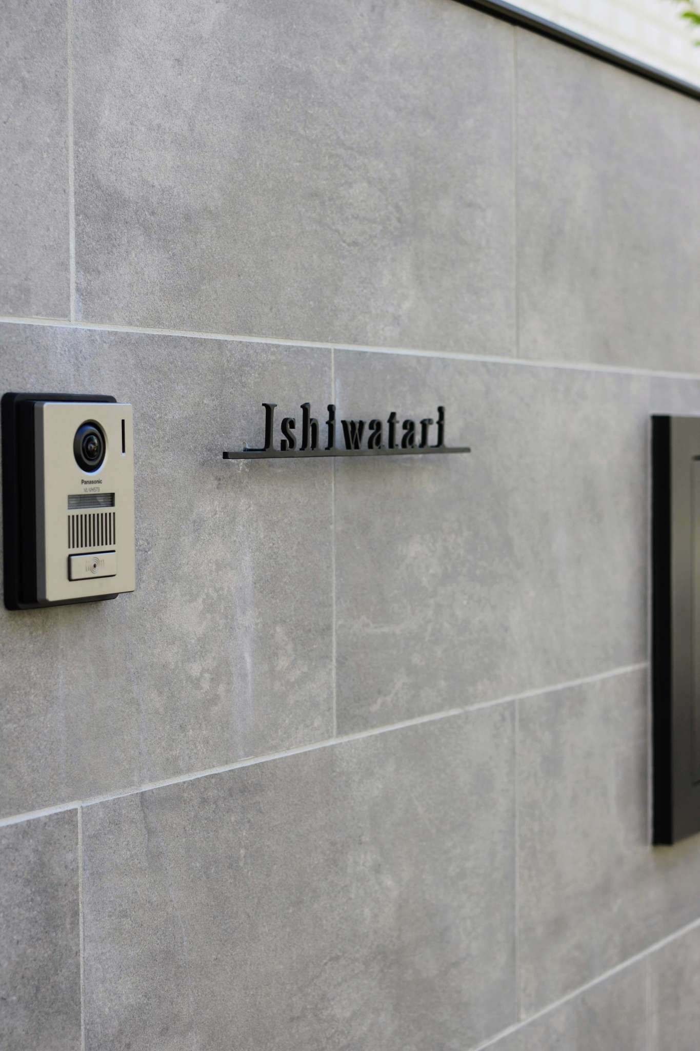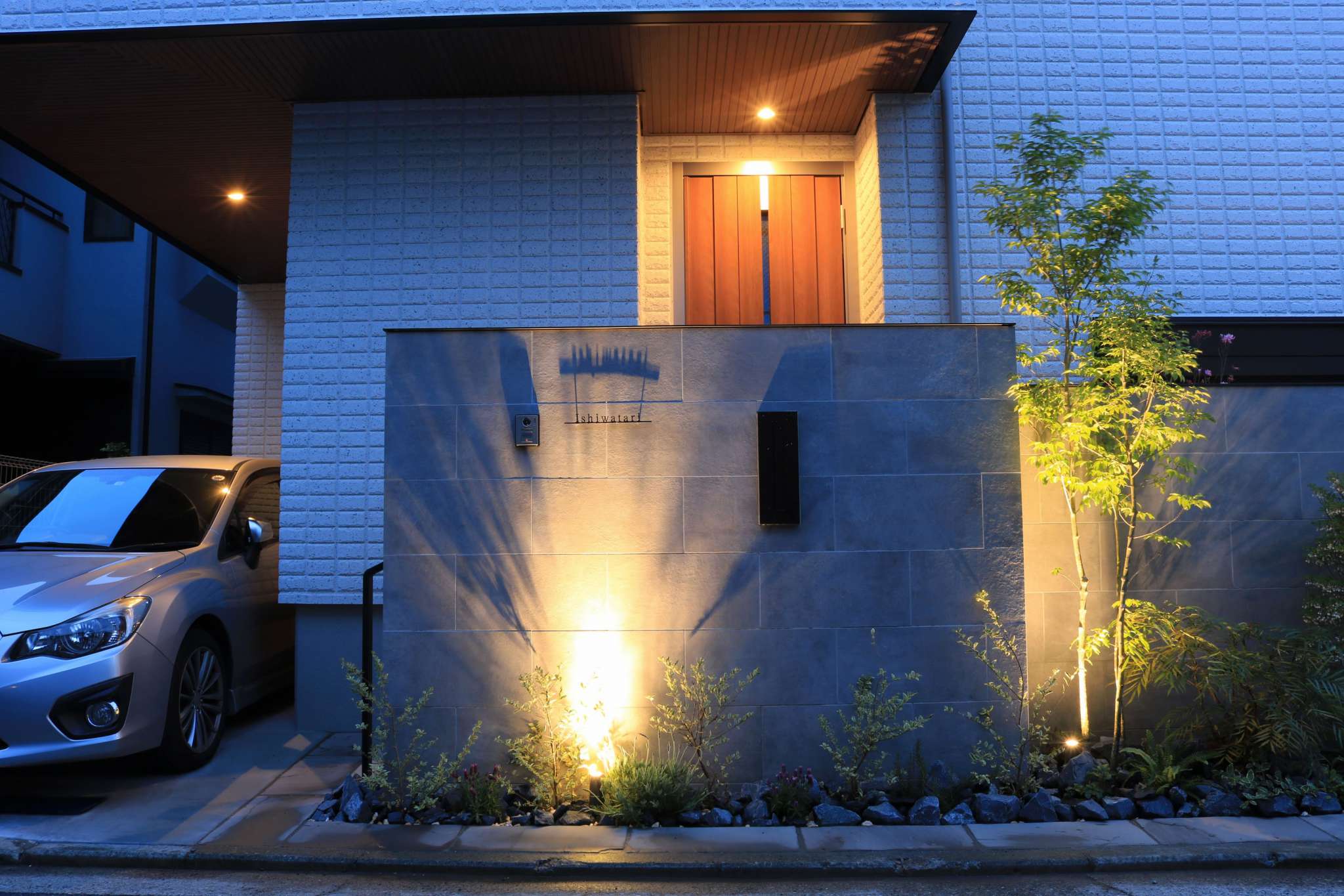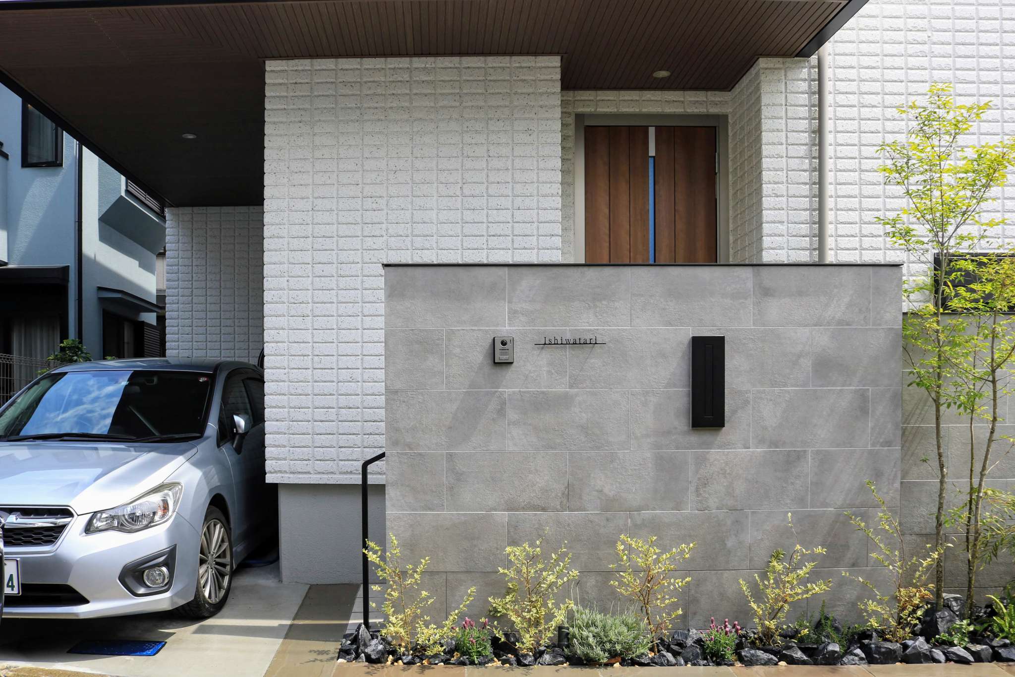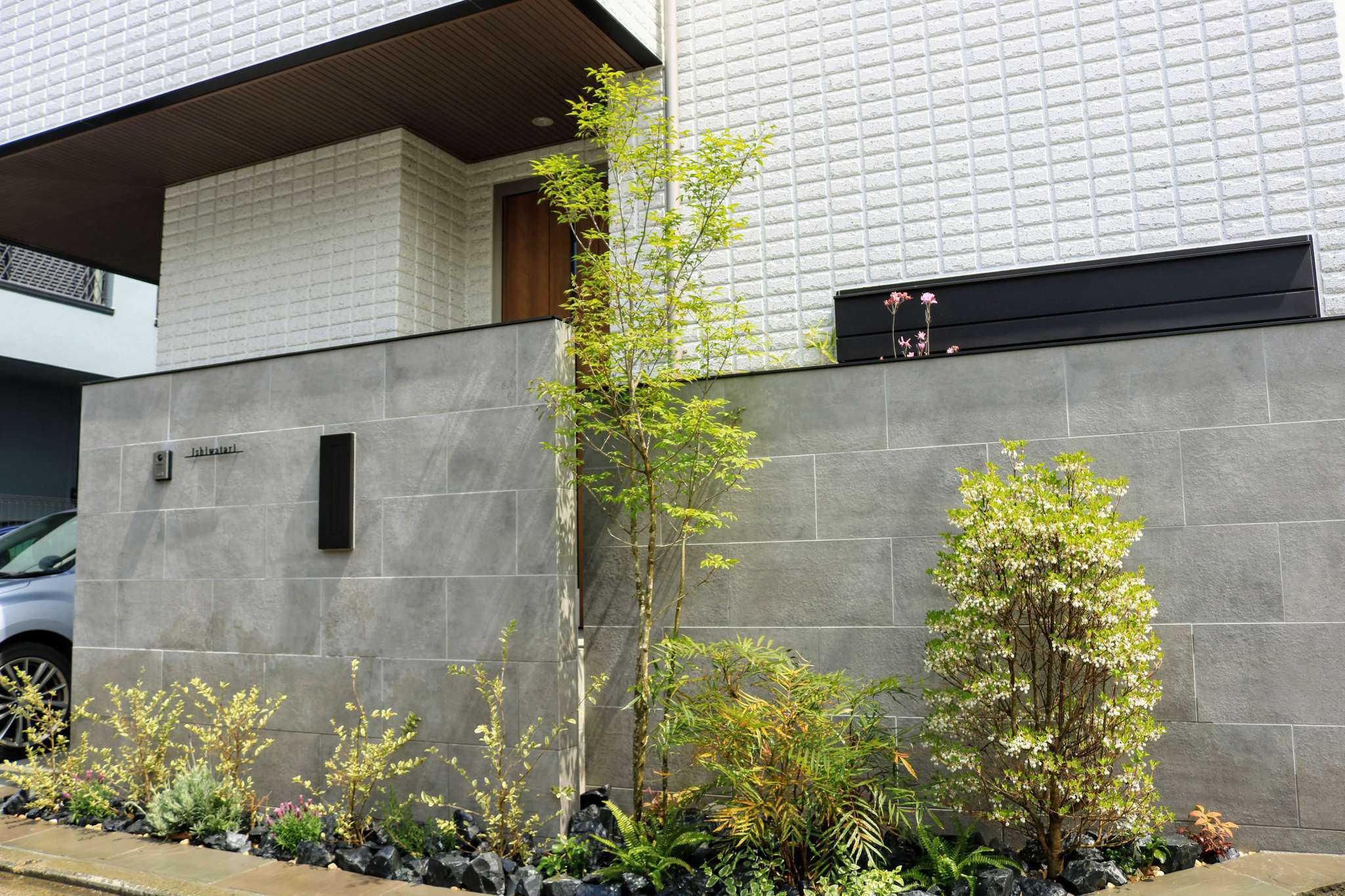 門袖はモルタル仕上げのような無機質な質感のタイル張りとし、玄関前の目隠し(プライバシー確保)としても機能しています。前面道路沿いには、石張りで囲われた植栽帯とし、無機質な壁をキャンバスに植栽のみどりが映えるよう留意しました。 シンボルツリーは株立のアオダモを採用し、添景樹としてドウダンツツジやマホニアコンフューサを配置。メリハリのある植栽計画とし、自然な印象を与えられるよう工夫しました。