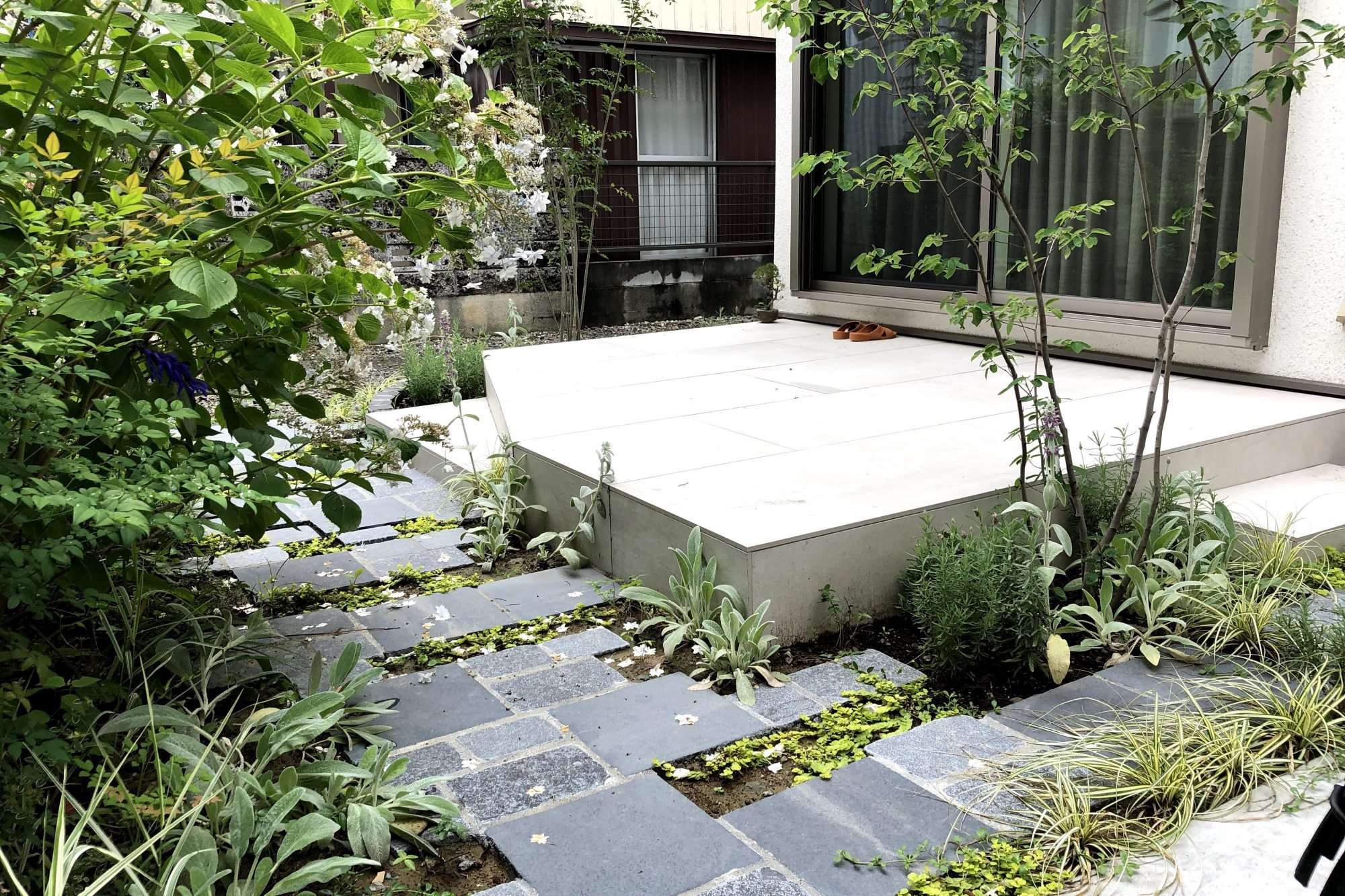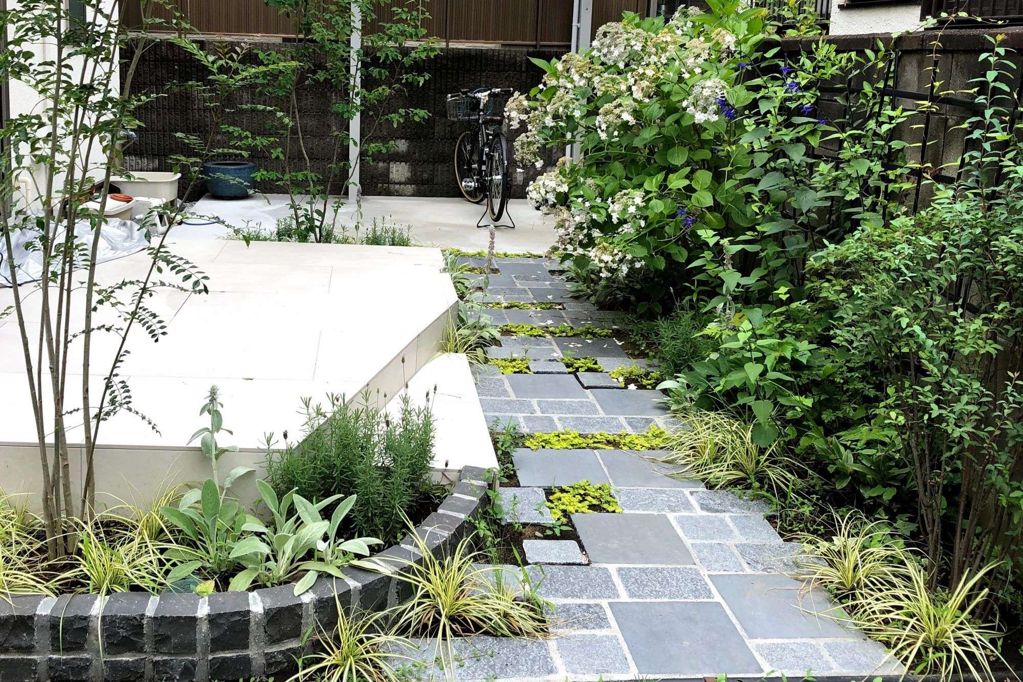 外構のリフォーム工事では自転車を乗るのが楽しくなるようにと、サイクルポートや通り道、季節感ある豊かな植栽とタイルテラスをデザインしました。