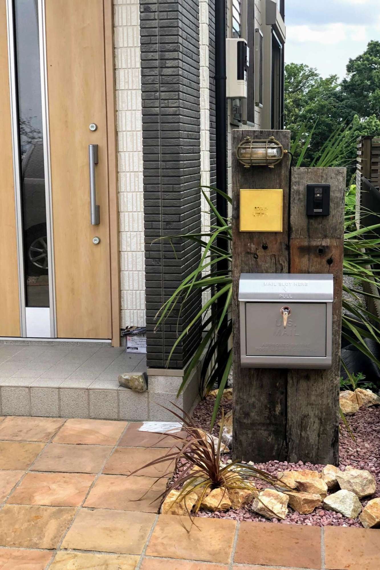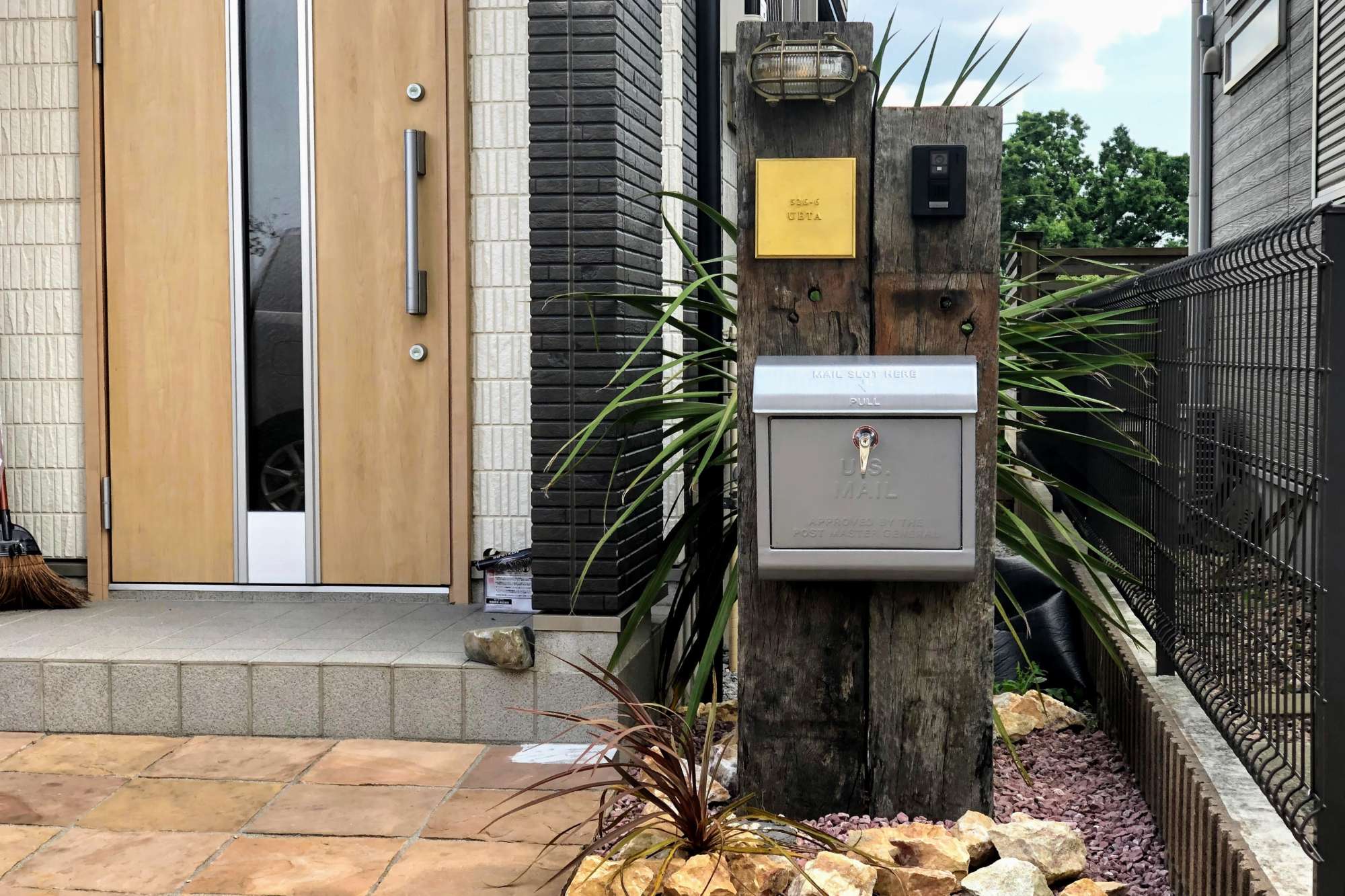 アンティーク風のマリンライトや鋳物の表札など。こだわりの部材を用いてあります。