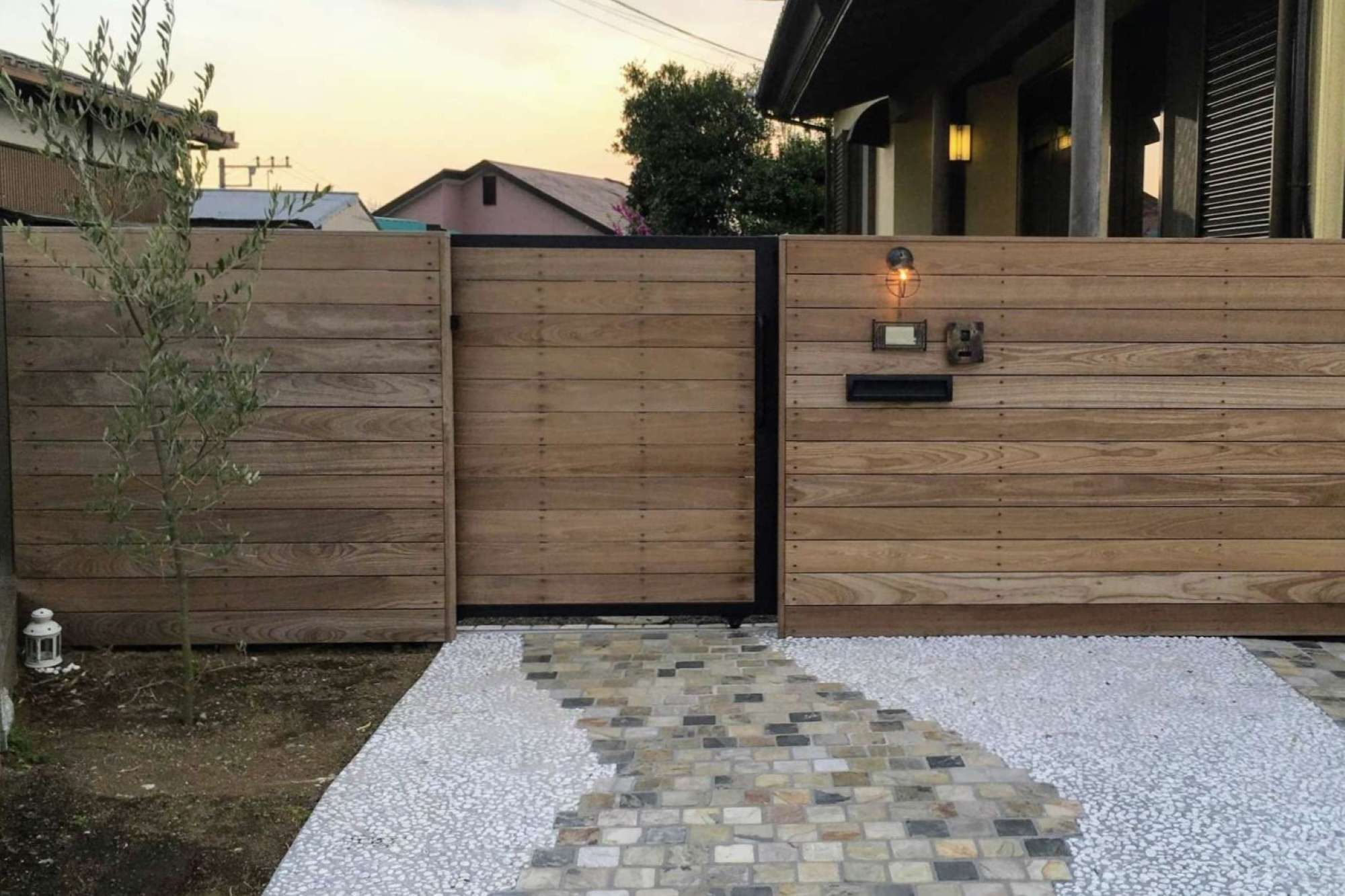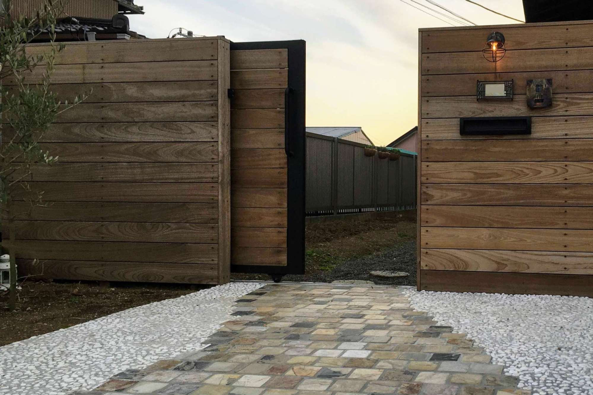 施主様のこだわりで門灯やポストなどもアンティーク風のものを。ハードウッドのナチュラルな風合いととても合います。