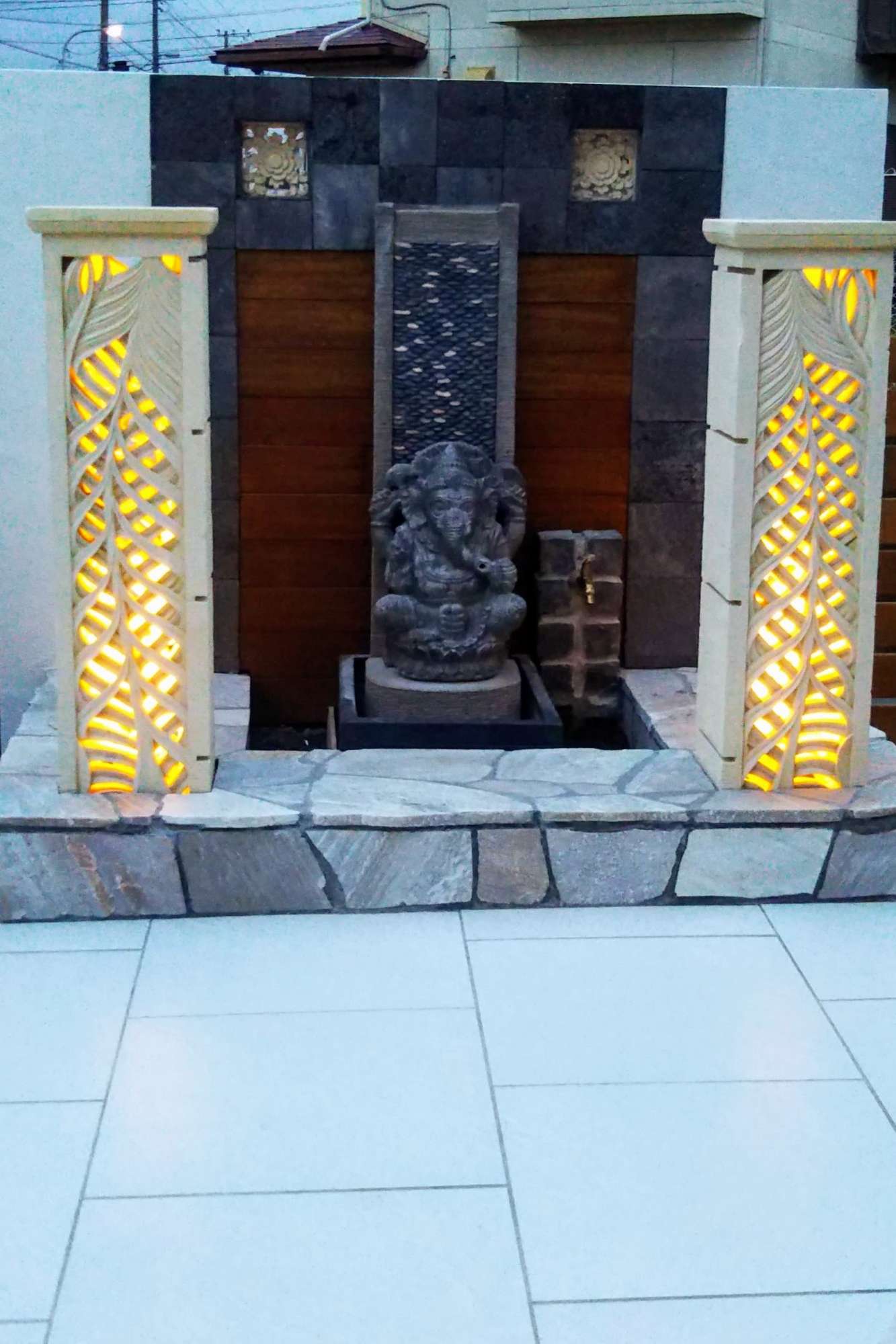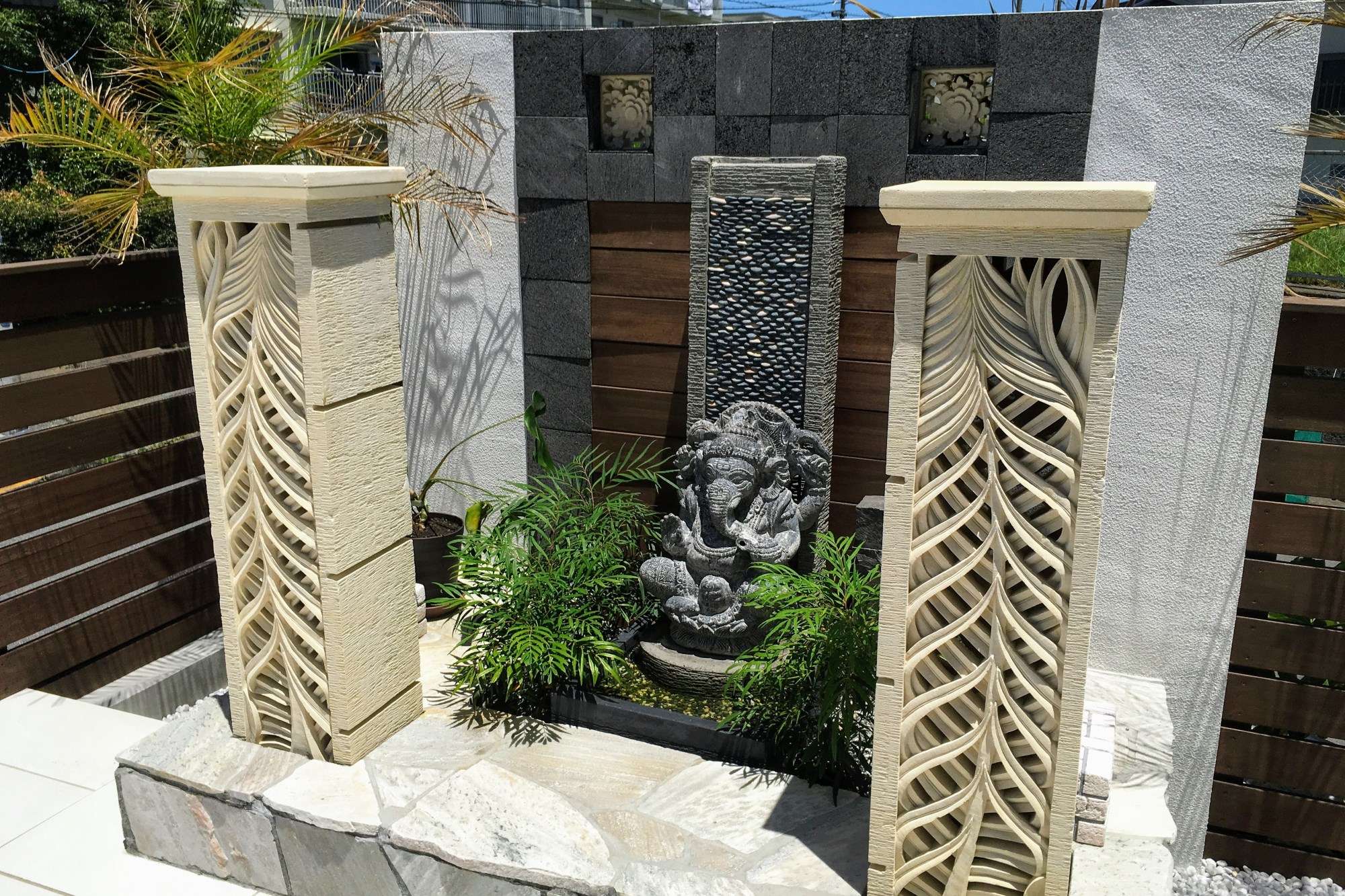ガネーシャの後ろには平たい丸石を使った装飾、溶岩プレート(方形)、ハードウッドなどの素材で構成。オブジェを中心に土台やウォーターシステム、電気配線を施工しています。