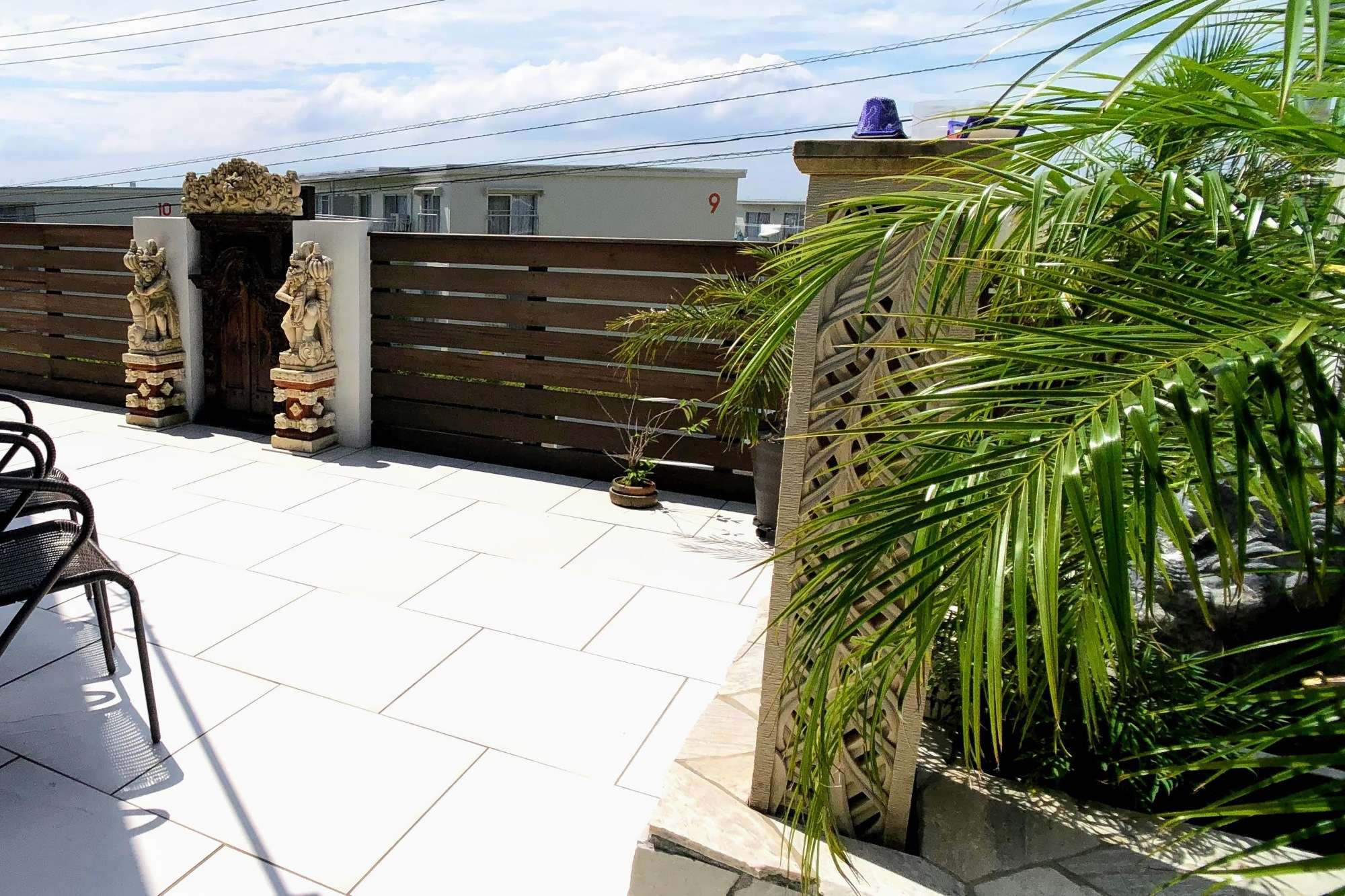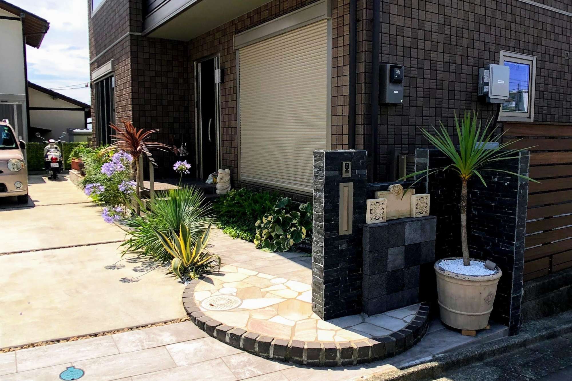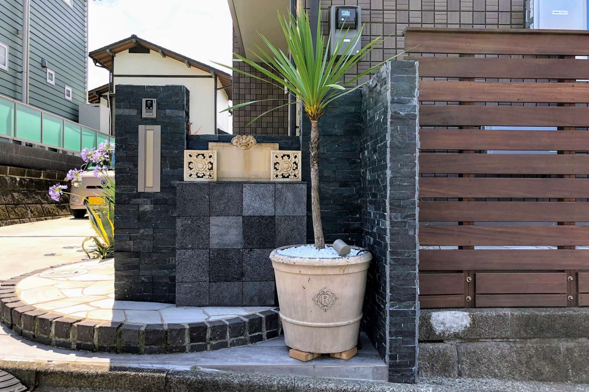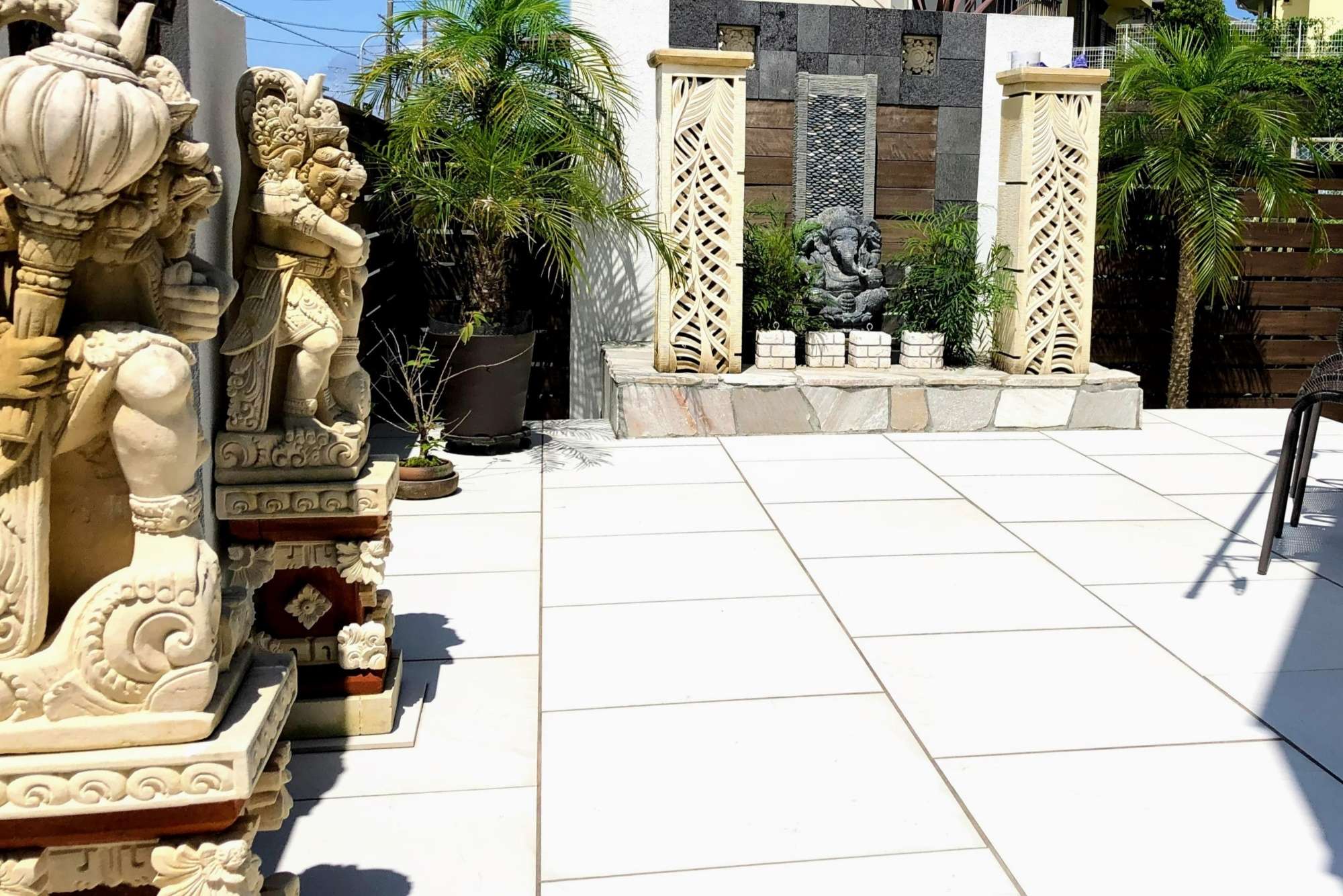東南アジアの香りが漂うガーデンテラスです。施主様がバリからお取り寄せされたオブジェが引き立つような外構デザインにしています。