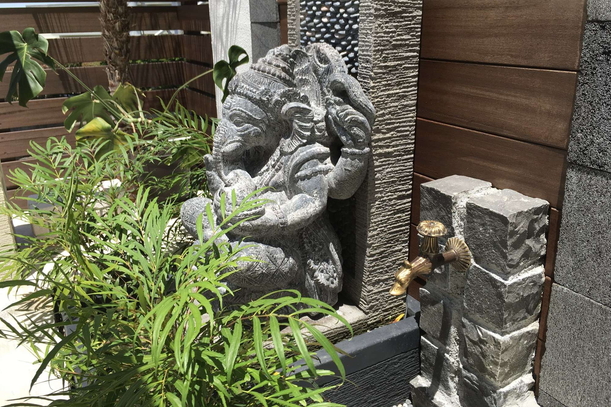 シンメトリーに配されたオブジェ。植物をモチーフにした灯篭。ガネーシャの周りは水盤にしてあり、水を受け止められるようになっています。
