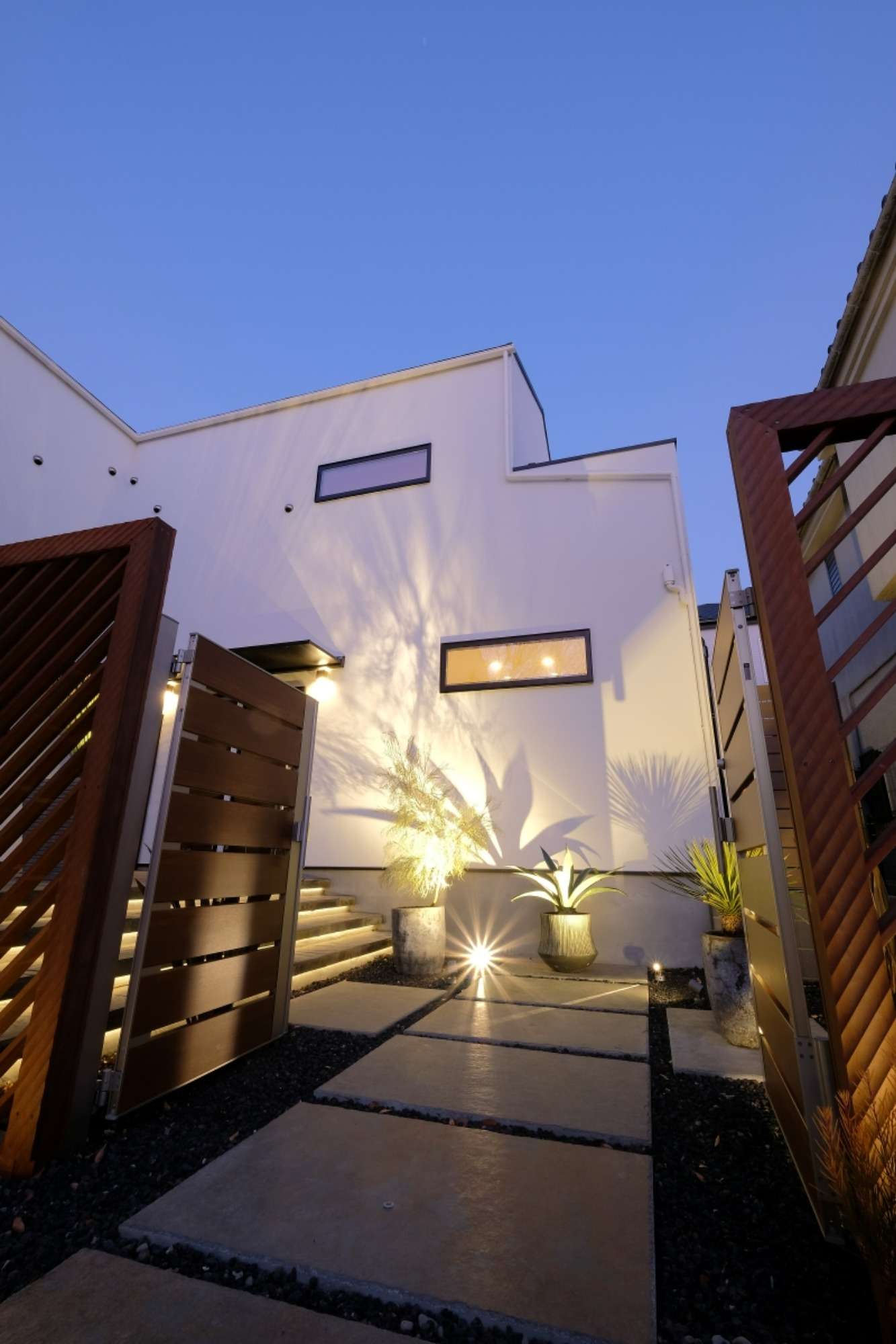 ファサードの門柱にもラインライトで間接的に明るさを出しています。門扉は造作で作っており、オートロックとなっています。門扉によって内と外と空間を分けていますが、スリット壁を用いることで、視認性は確保され安全性が高まります。
