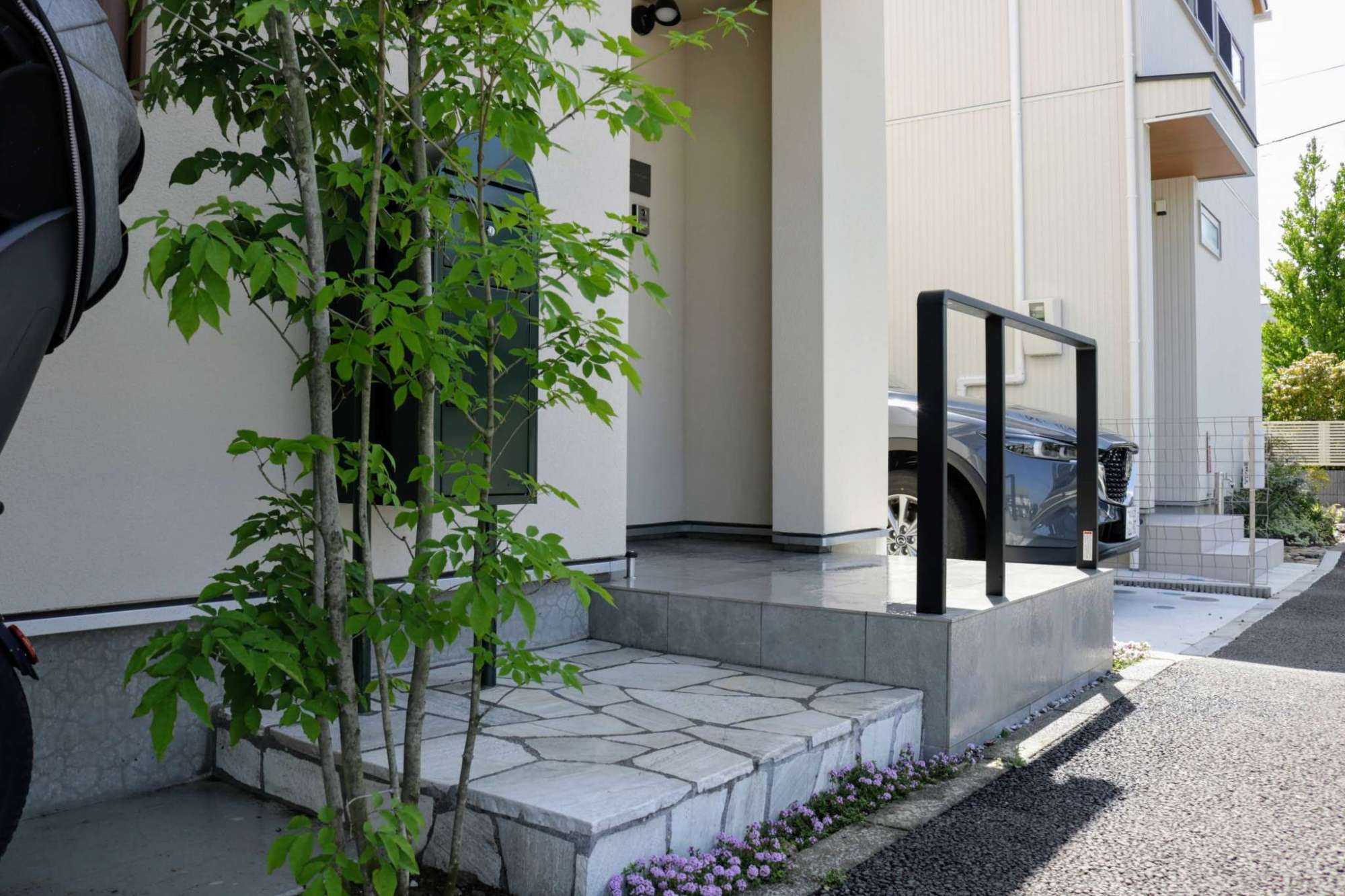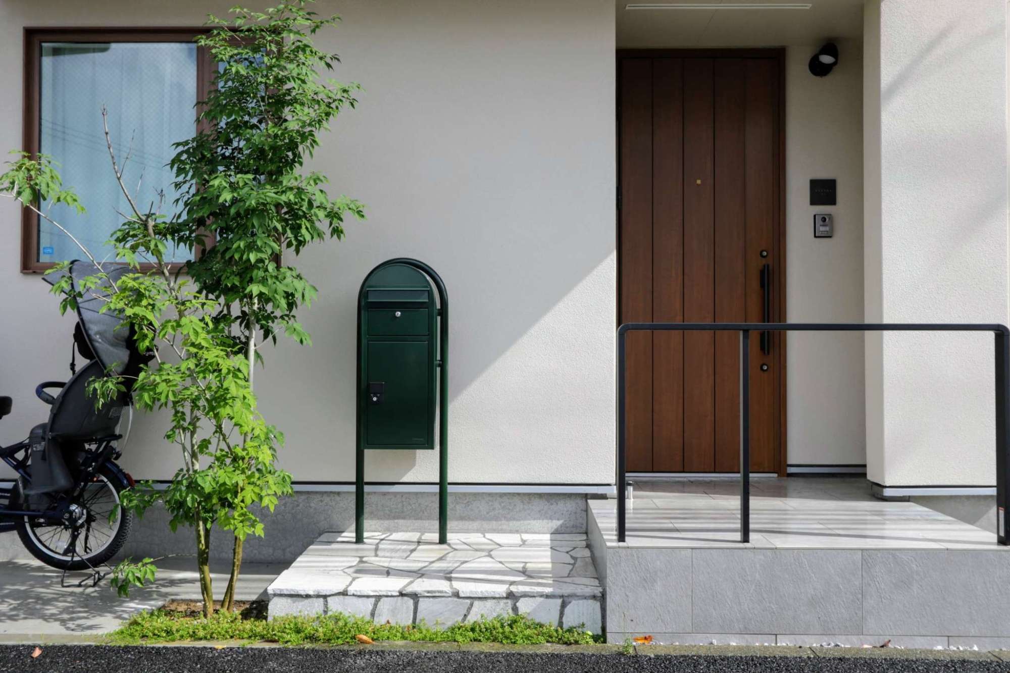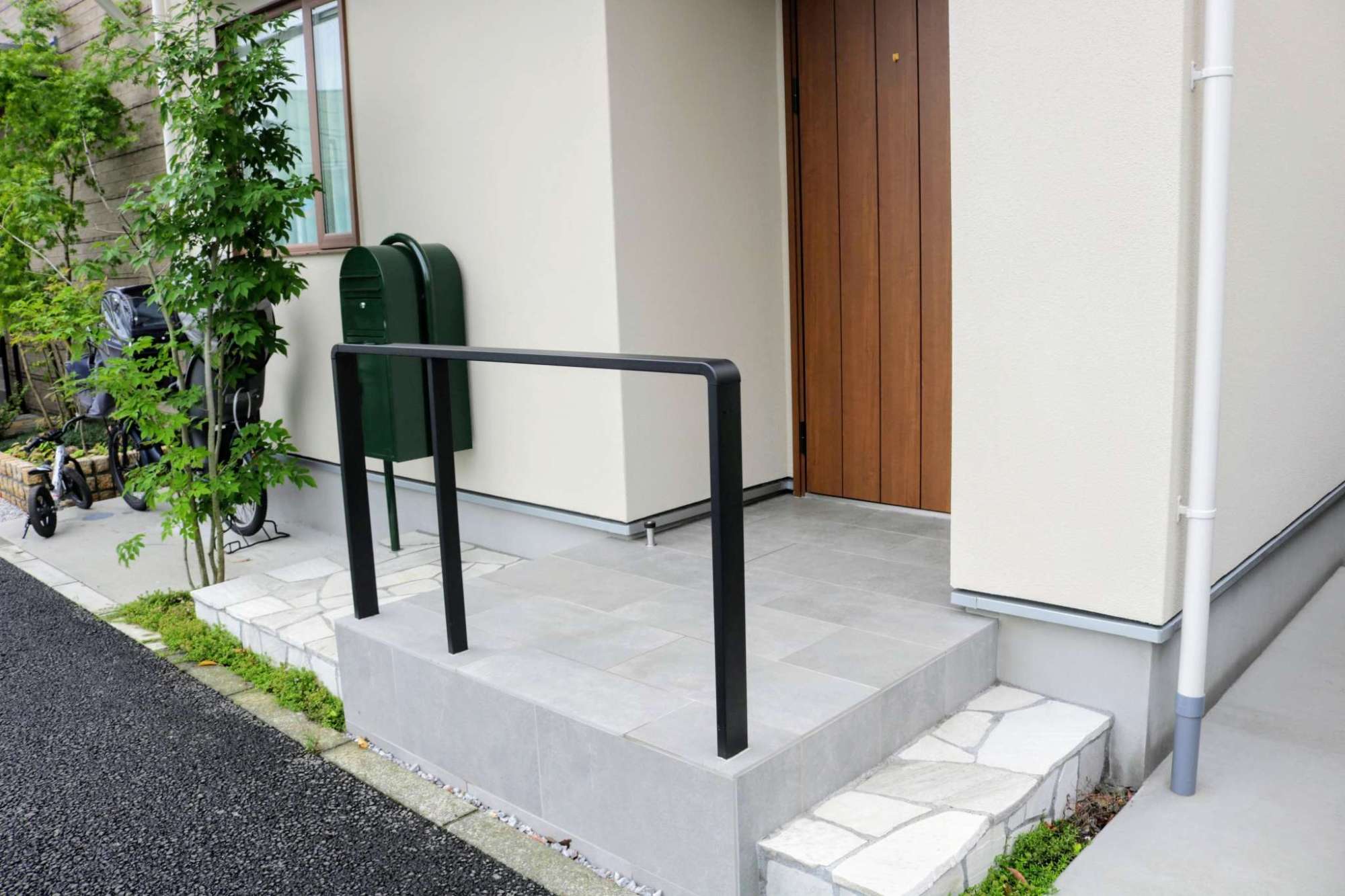 階段1段目は乱形石張りでポーチとのコントラストを作り、存在感のある宅配ポスト、ボビカーゴが鎮座します