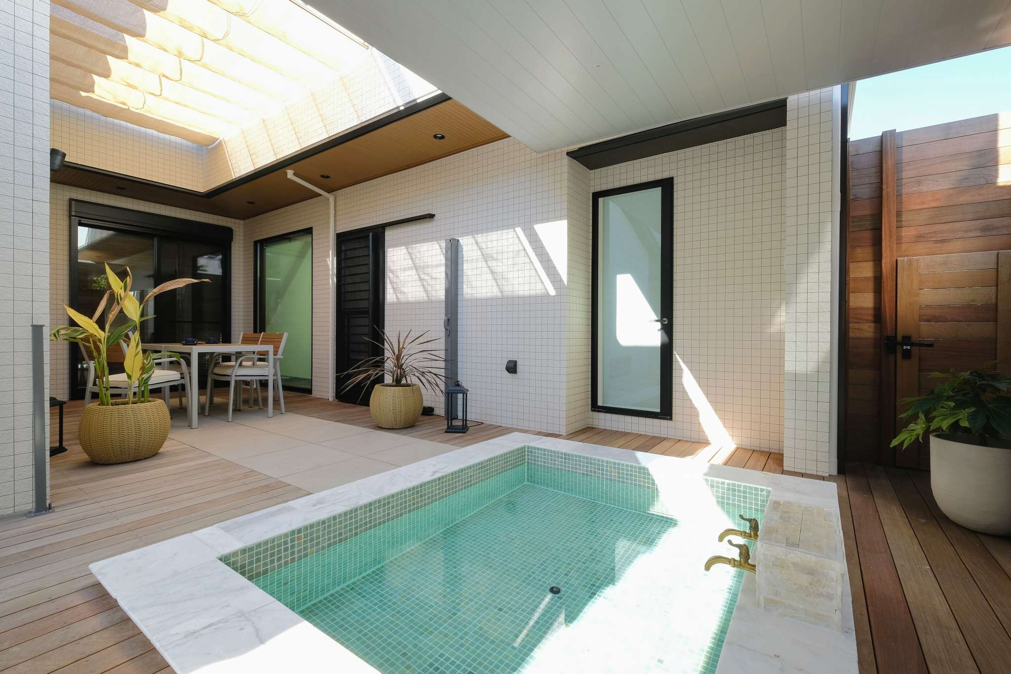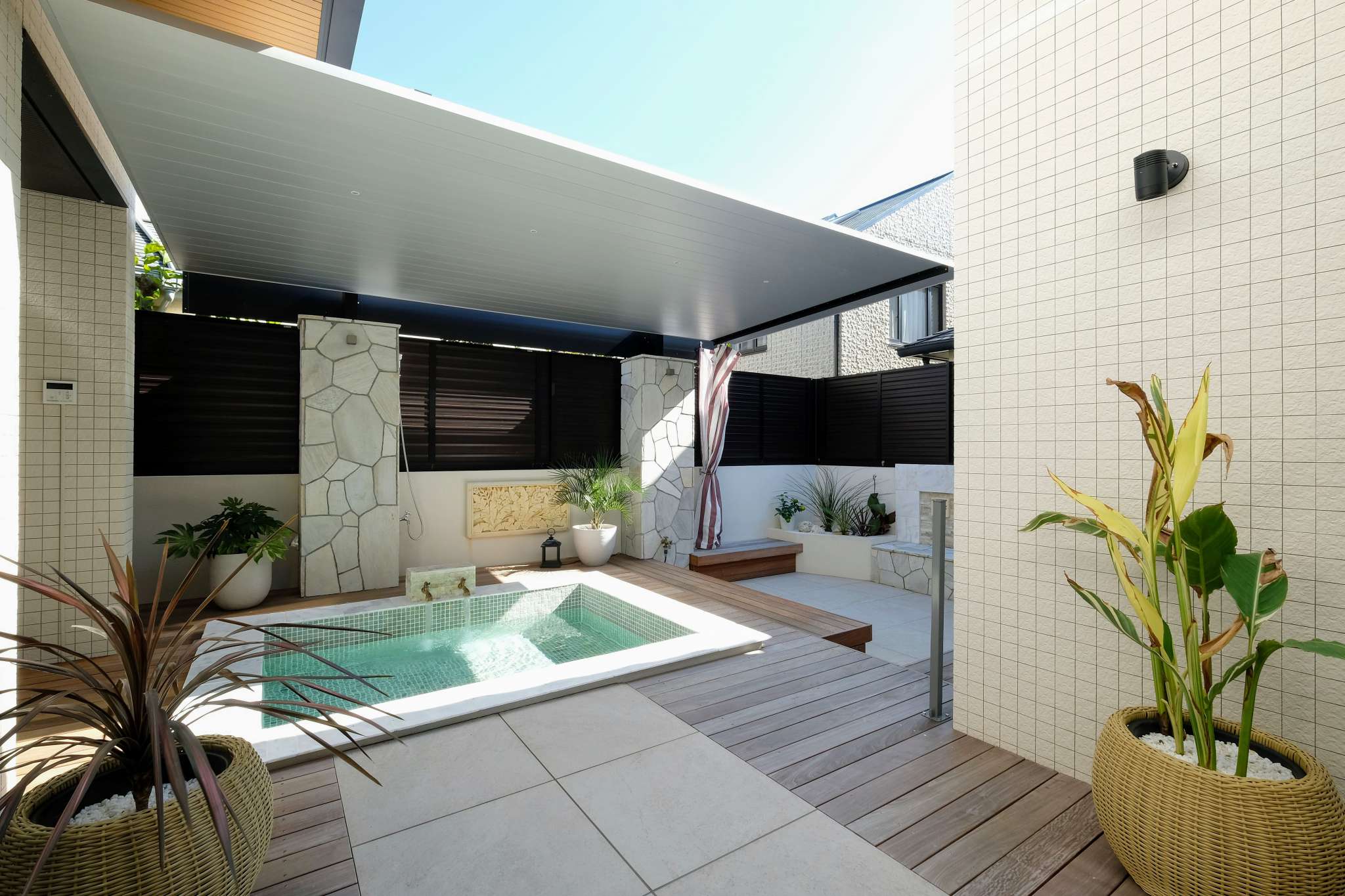 露天風呂としてデザインしておりますが、水を張ればプールとしても使えます。