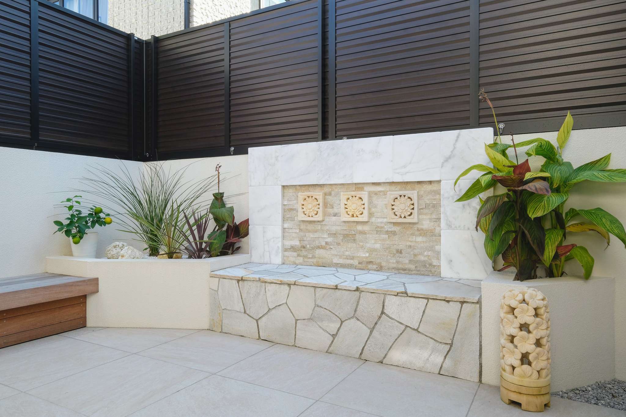 施主様が南国リゾートをイメージされていたので、それに合わせて花型のレリーフやランタン、観葉植物をご提案させてもらいました。