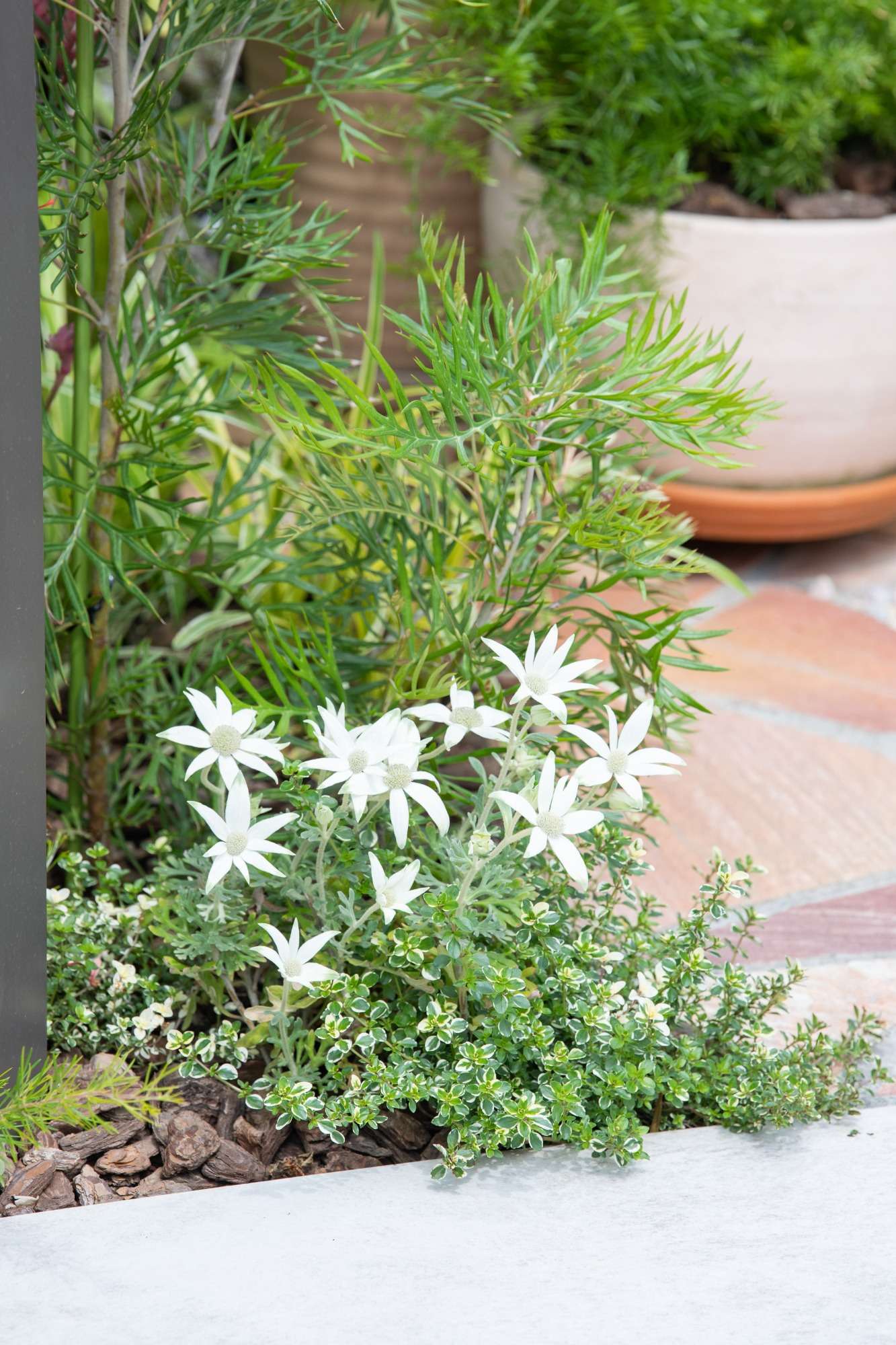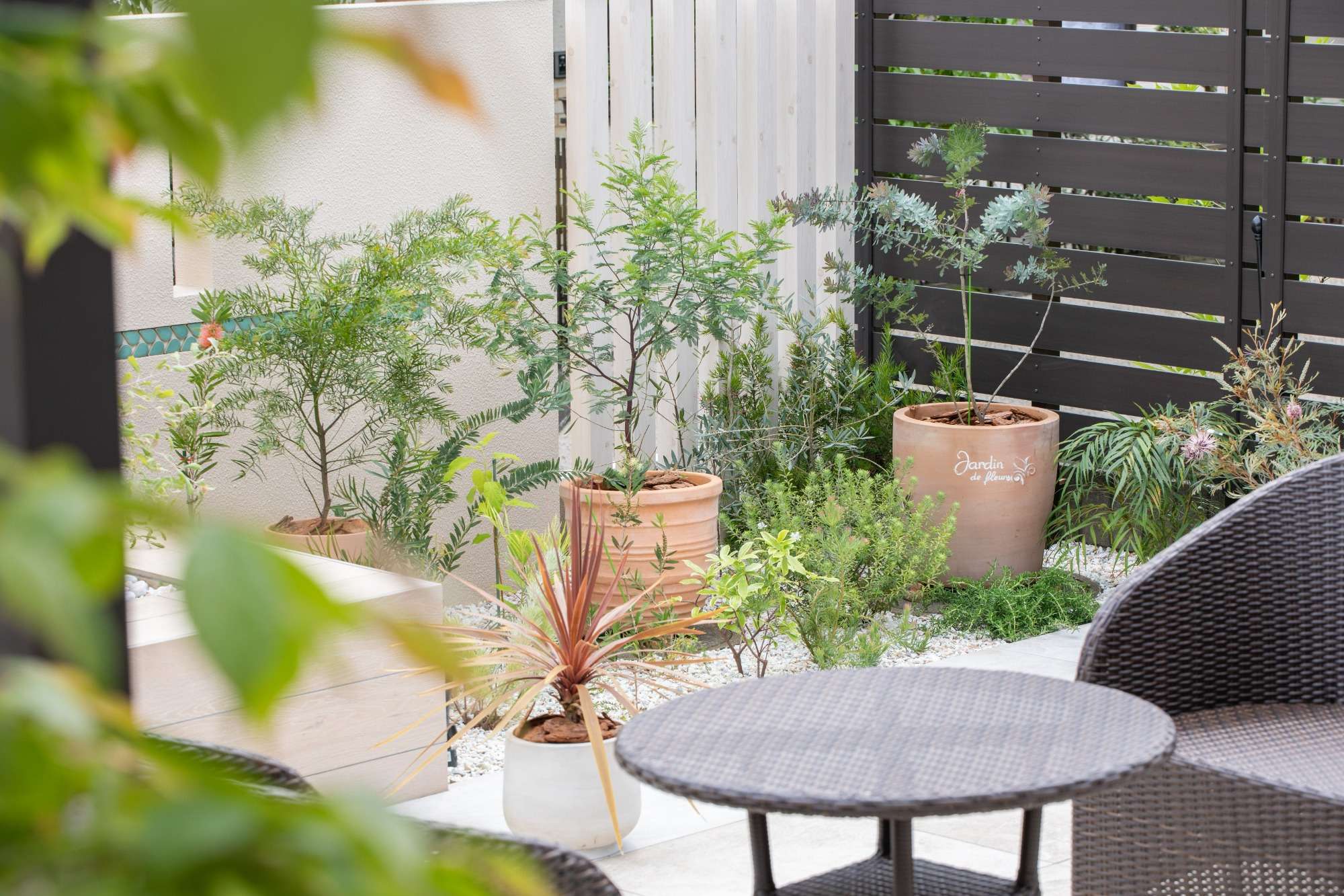 適度に鉢植えで植物を配しています。そうすることでお庭に高低差が生まれ、動きが出てきます。
