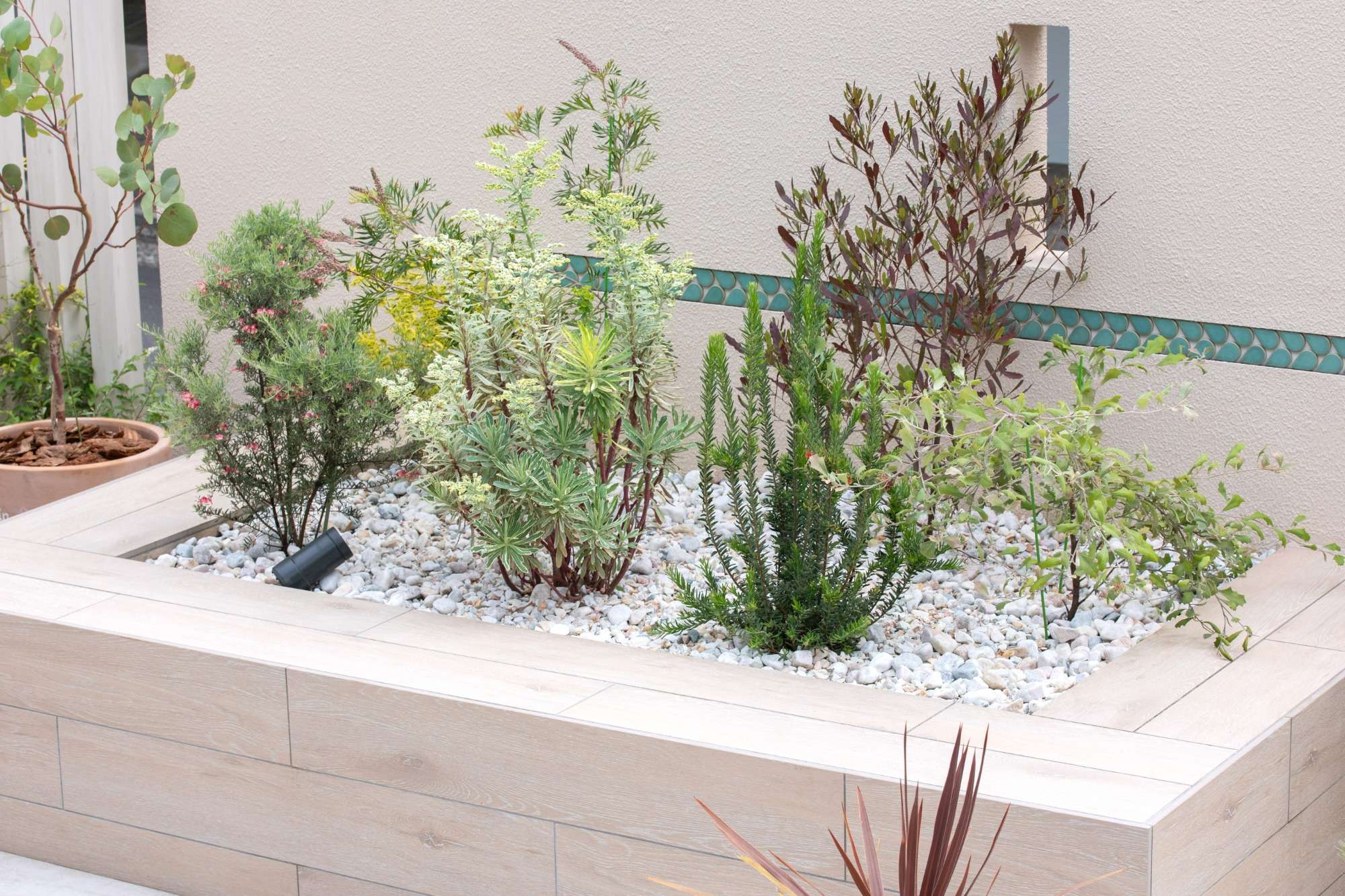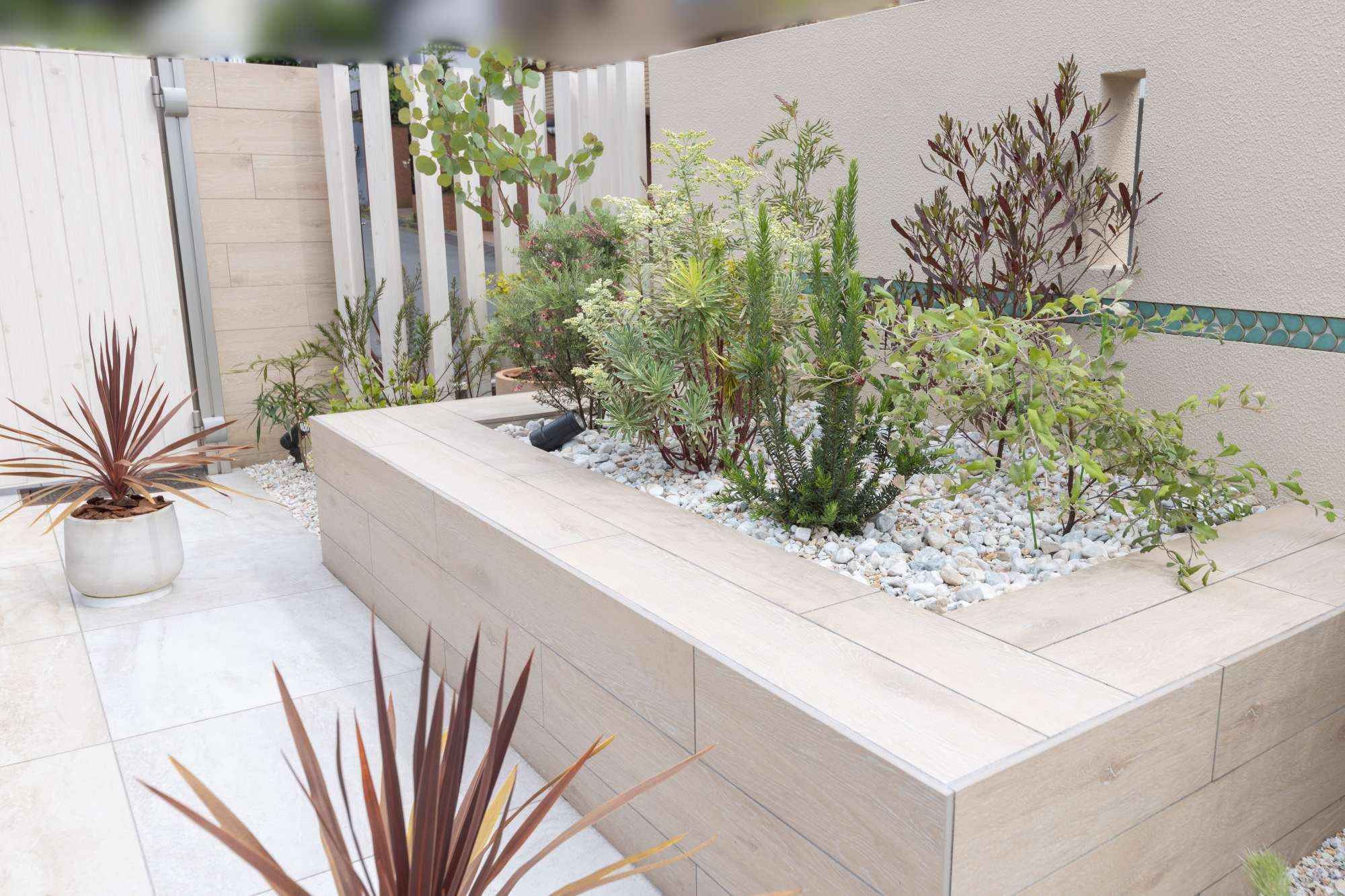 花壇を施工させて頂きました。奥の袖壁にグリーンのアクセントラインがあります。これは名古屋モザイクのドロップ型のタイルなのですが、ショールームでお施主様が気に入られ、アクセントに施工したものです。センスの良さを勉強させていただきました。