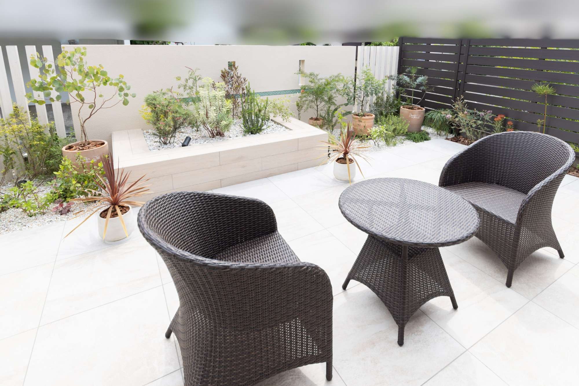 素敵なラタンの家具はお施主様が、600角の大判のタイルが美しくみえるものをと、お選びになりました。お庭に調和していて、素材や形など、よく吟味されたのがうかがえます。