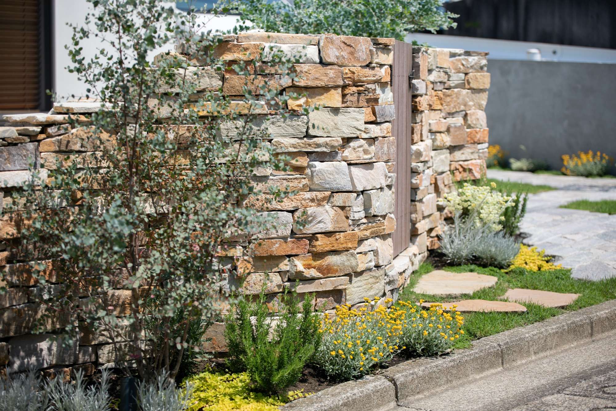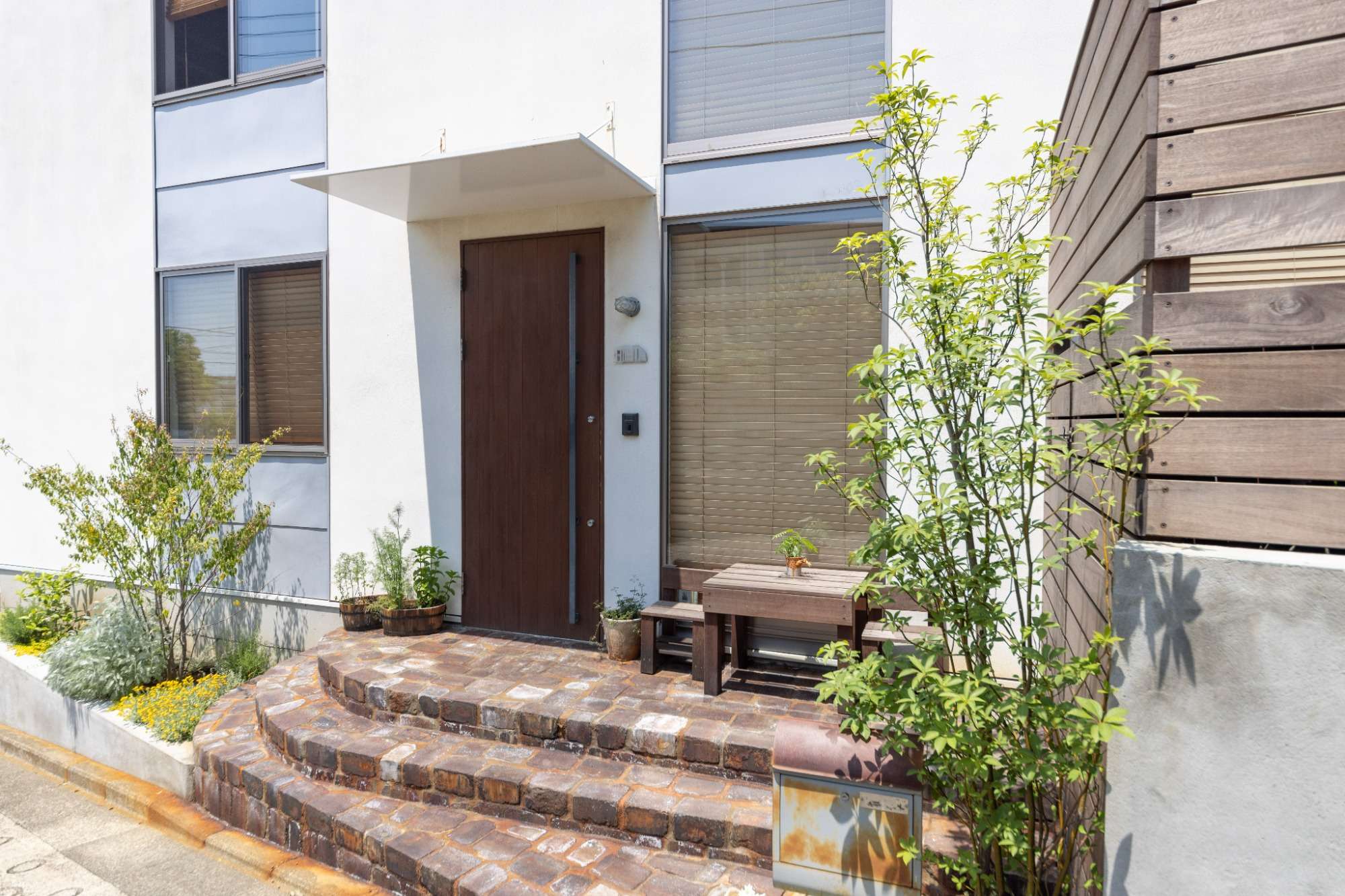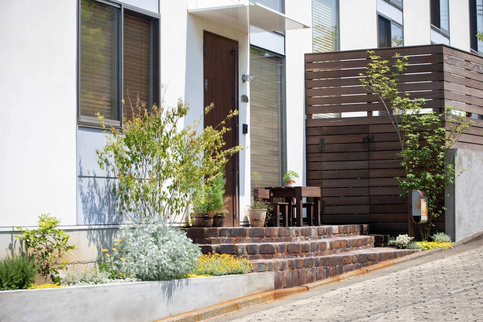 アプローチ階段もヴィンテージさを感じられるクリムレッドランダムというレンガを用いています。このレンガは染み出てくる鉄分によって独特で美しい変化を与えてくれます。重厚感のあるエントランスの向かって右側には、クロモジという樹木をポストと共に。