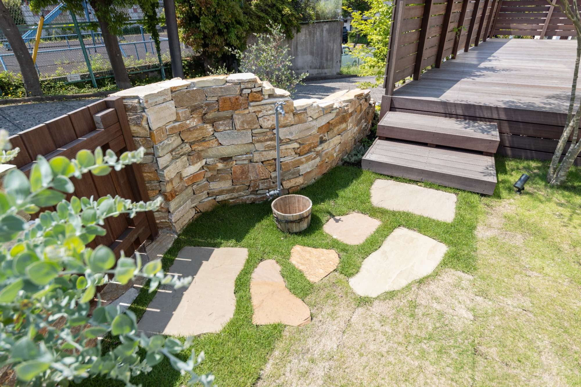 立水栓は2口仕様となっていて、上と下の2か所に蛇口が付いています。水受けは施主様のお選びになった木製バケツ。施主様がバケツに穴を空け、排水ができるように加工されています。バケツの下は砂利敷きの浸透桝を施工しています。大きい目に割った自然石を飛び石として張ってみたりと遊び心も入れました。