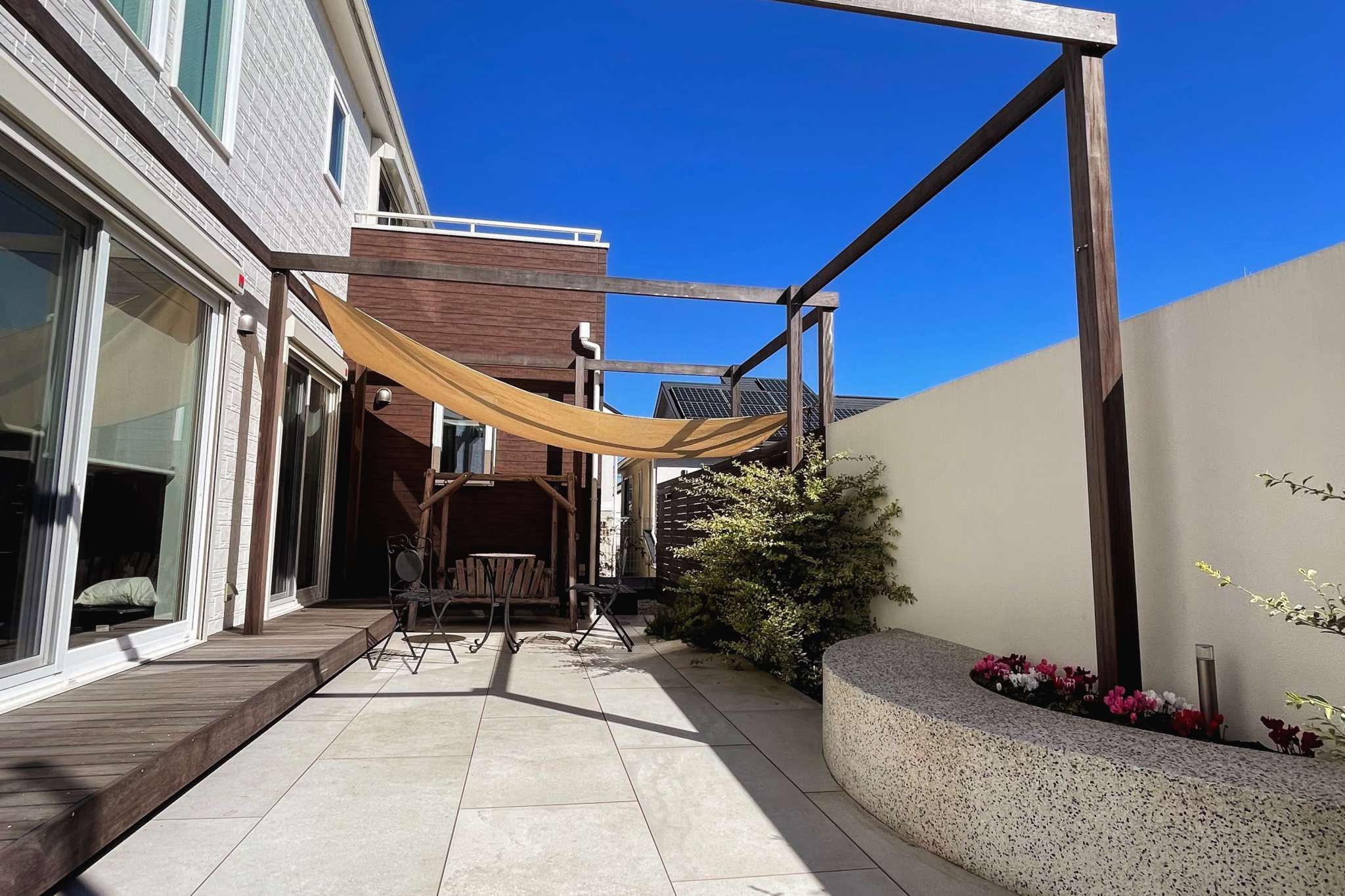 リビングからつづくタイルテラスは、アウトドアリビングとなっています。隣地からの目線も気にせず、悠々とした時間を過ごせます。タイルは施主様こだわりの大判タイル、1200×600サイズのものです。大きいだけあって、空間に余裕が感じられます。