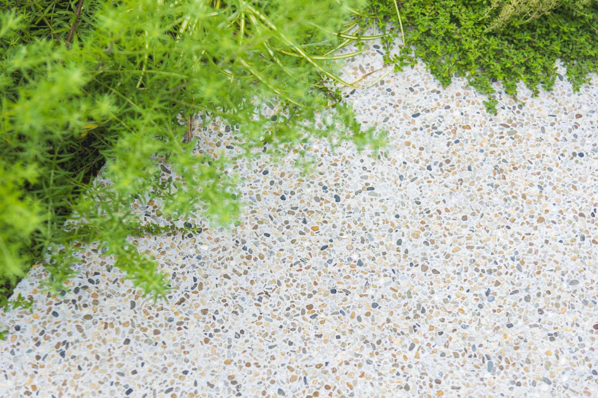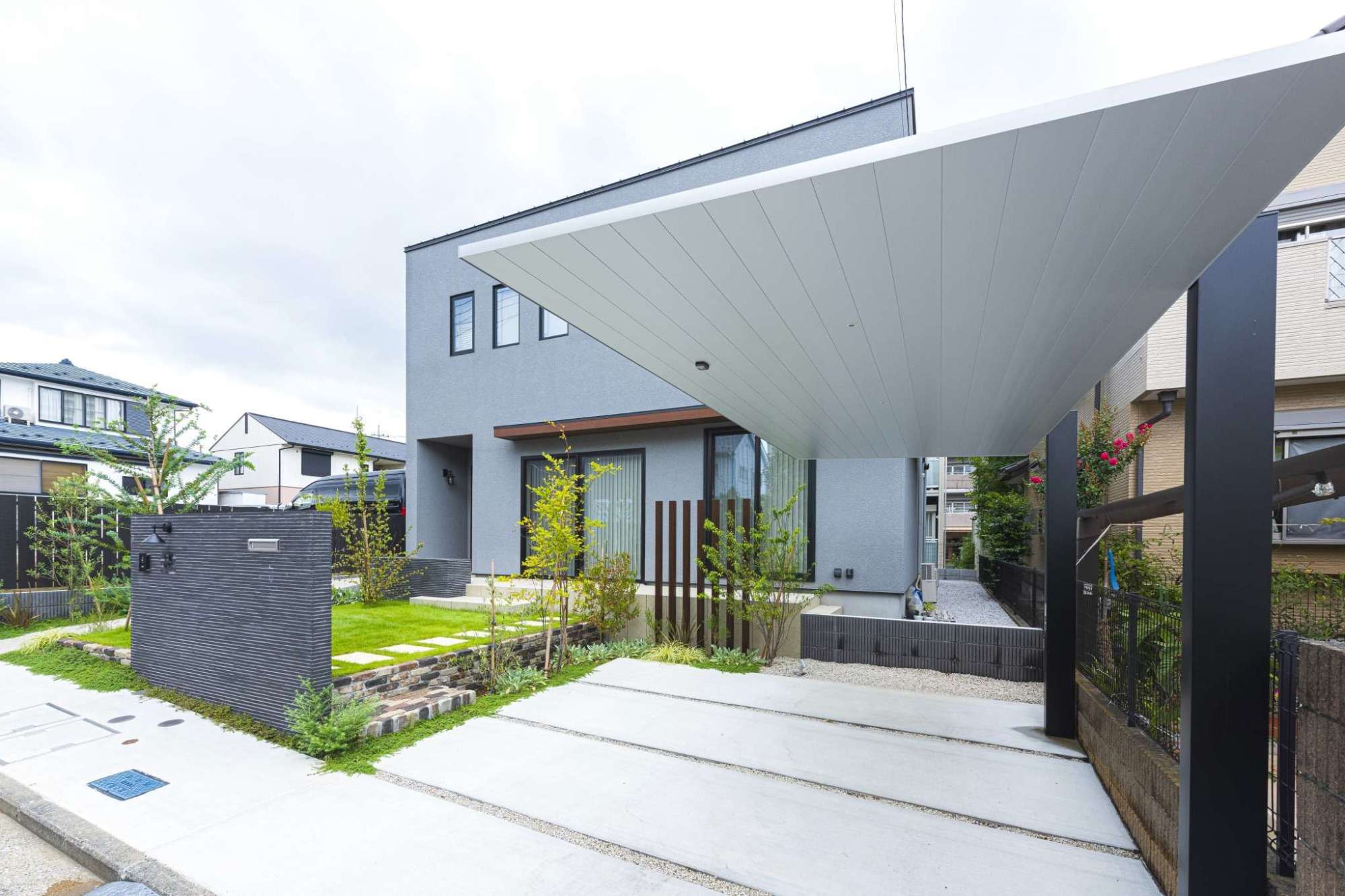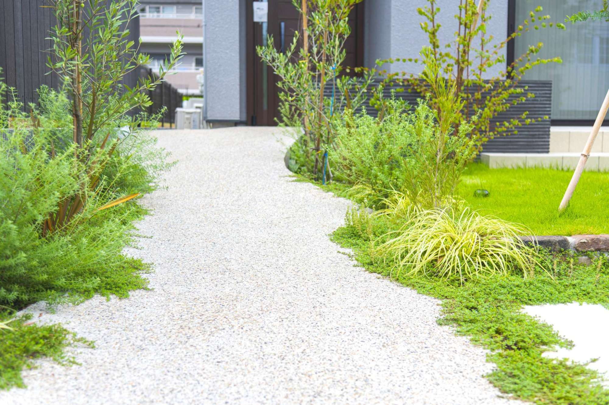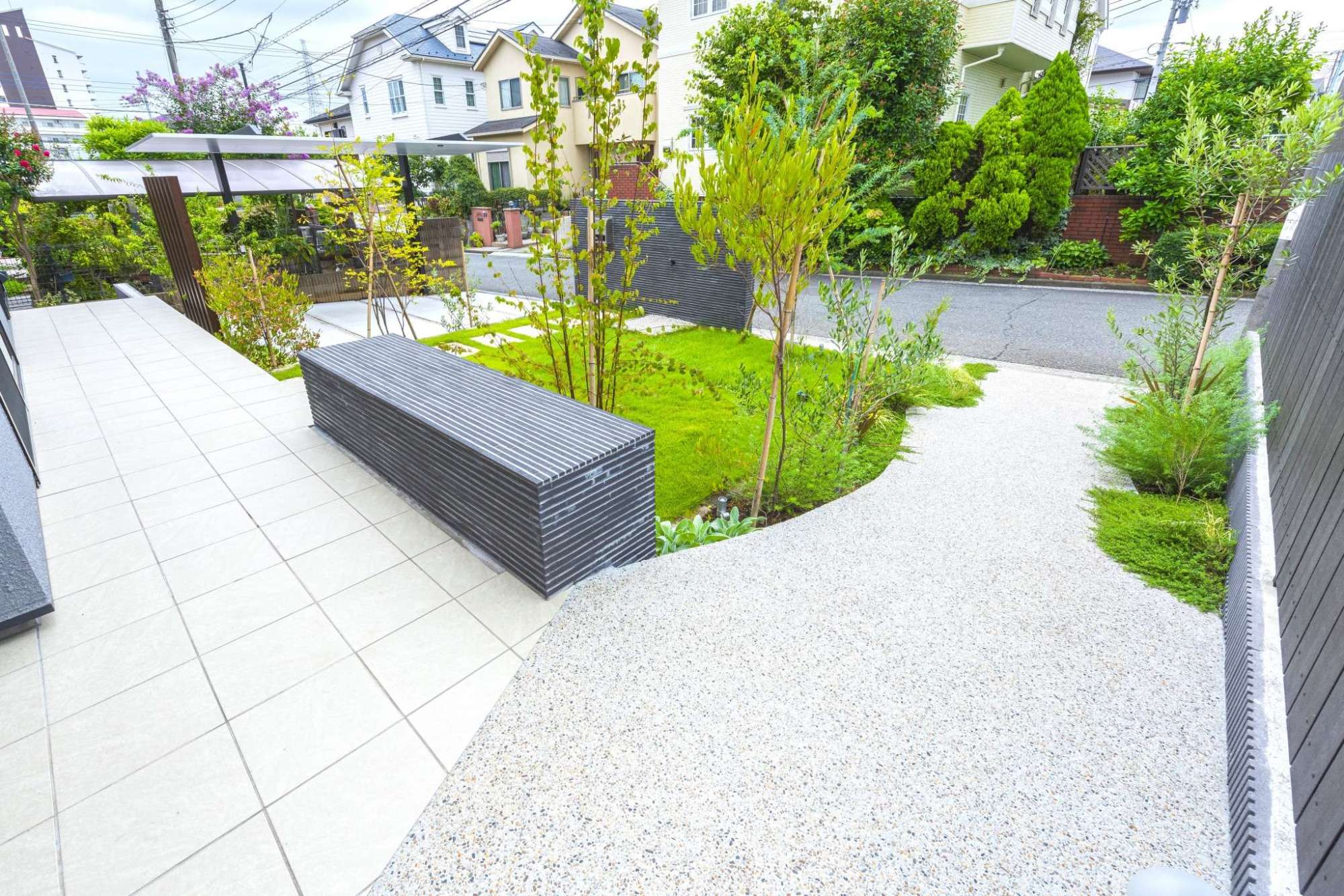 前面道路との間に仕切りとなるものは全くつくらず、フルフラットでつなげています。